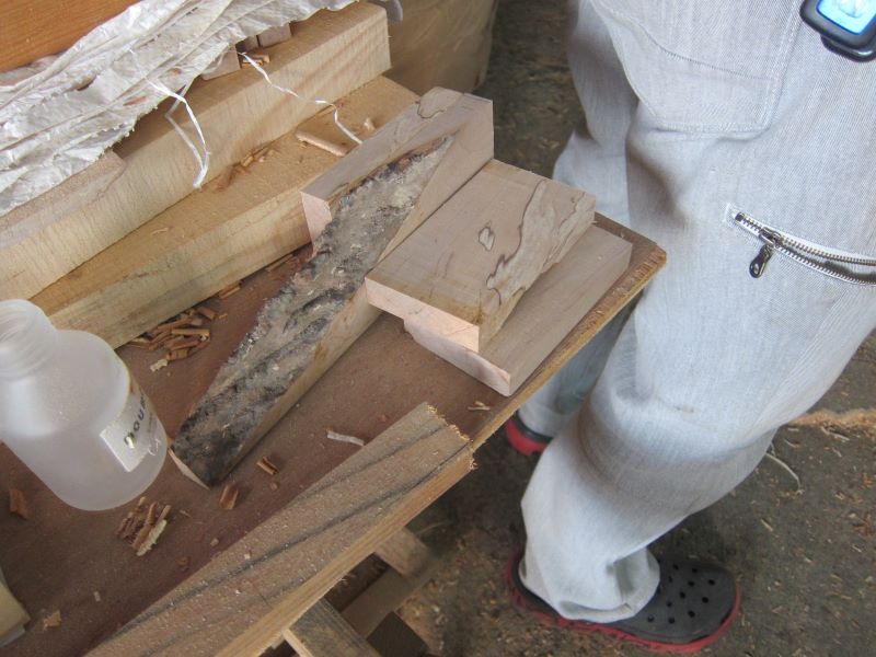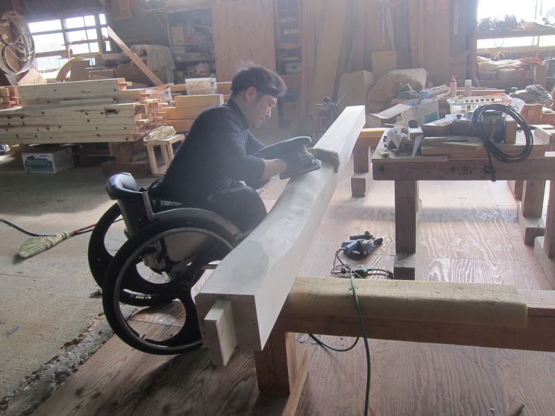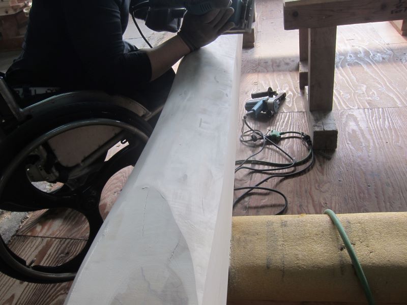 車椅子大工は墨付けを進めた後は、若手大工がその墨をもとに刻んでいますから、付き添指導しています。それでも時間を持て余して、ポーチ柱のミズキの柱を自分で加工していました。