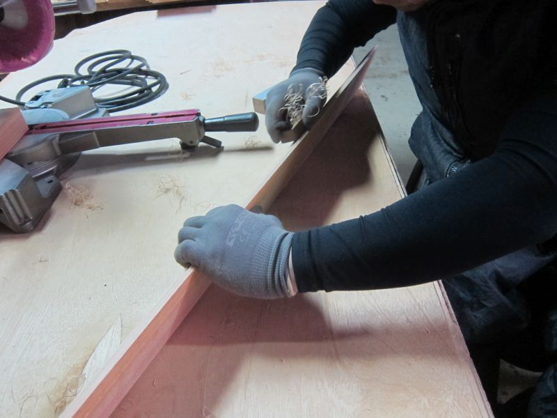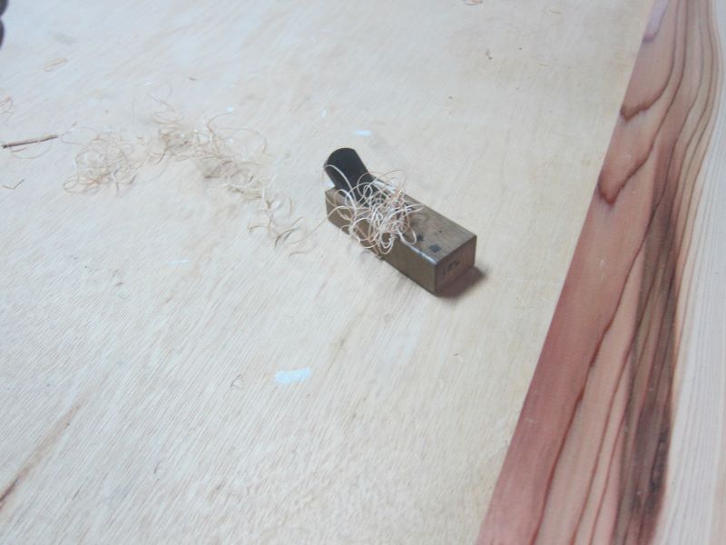 車椅子大工が、天井板の面取り鉋掛けをしていました。その鉋が小さくてかわいいのです。
