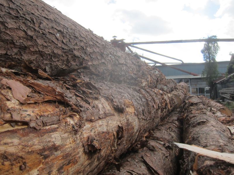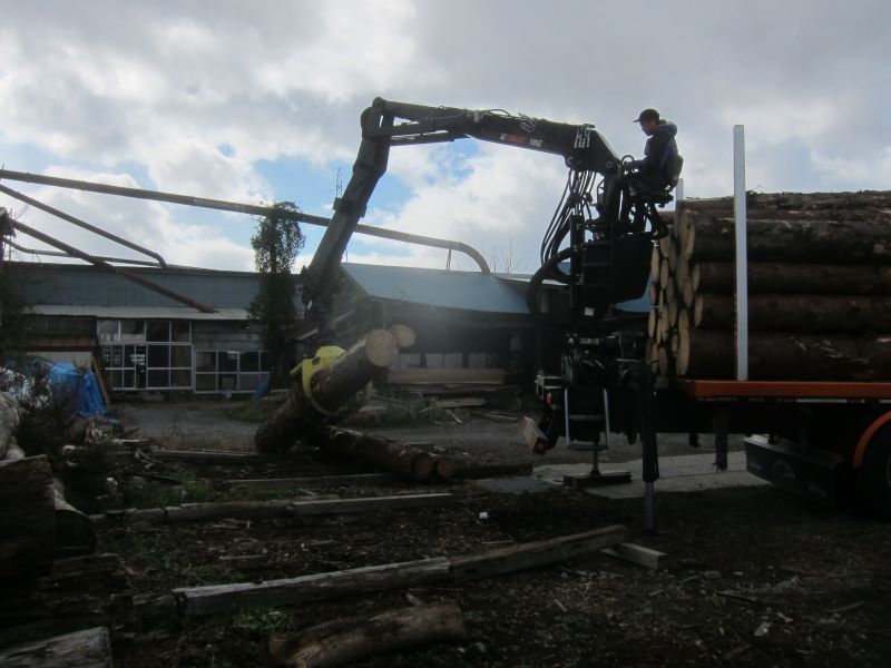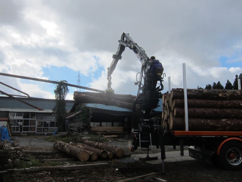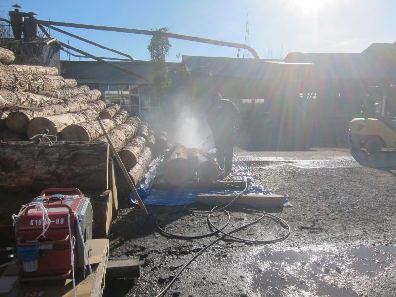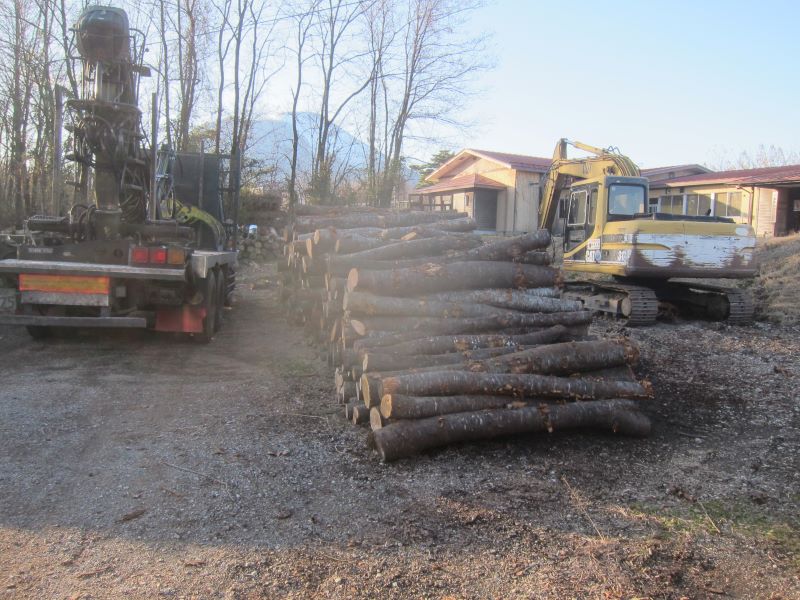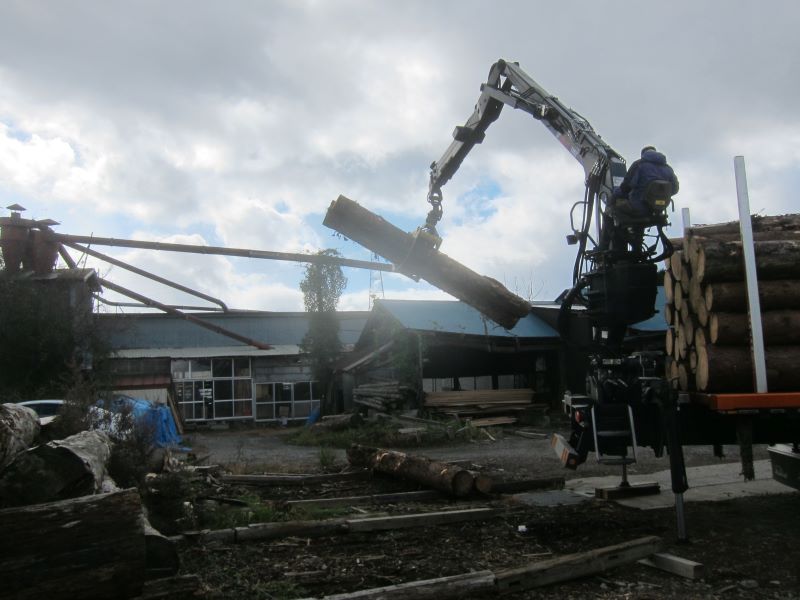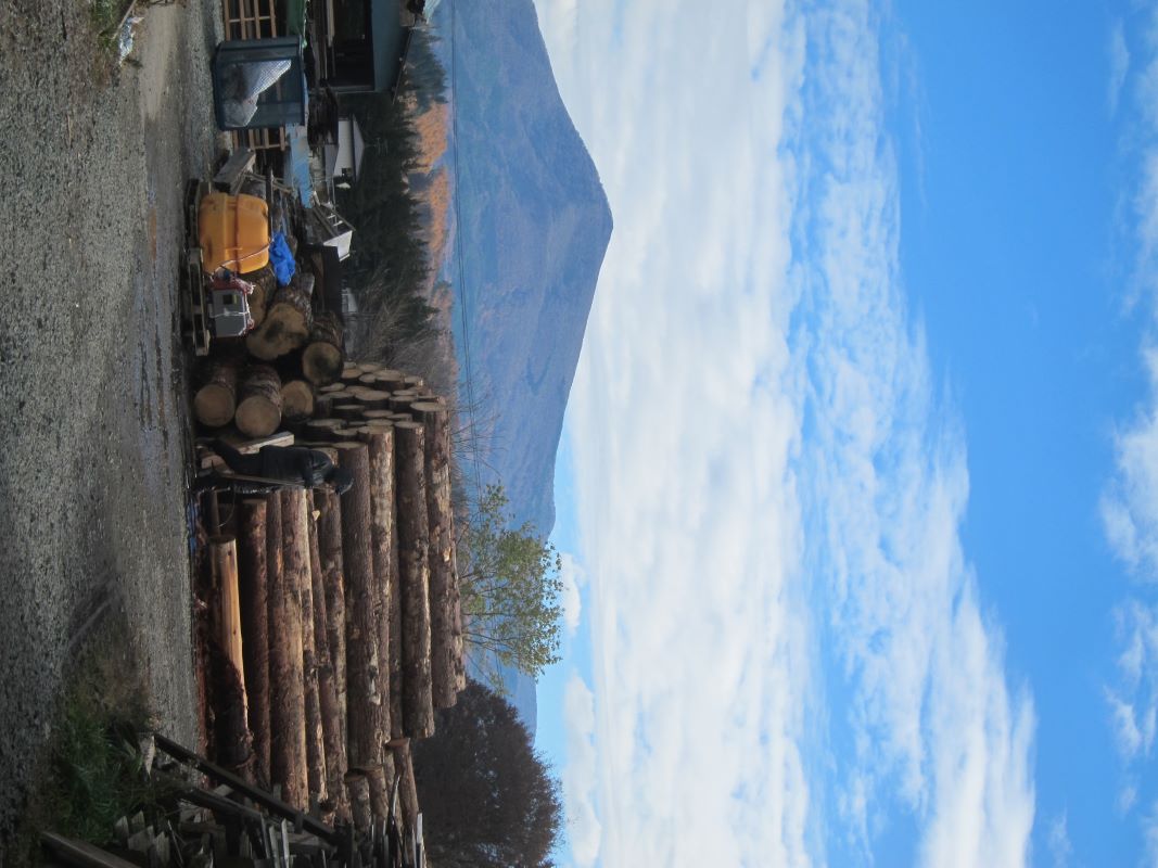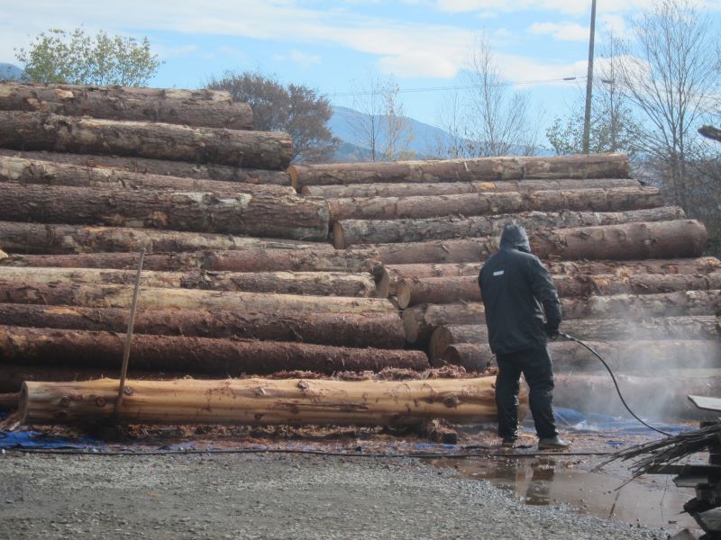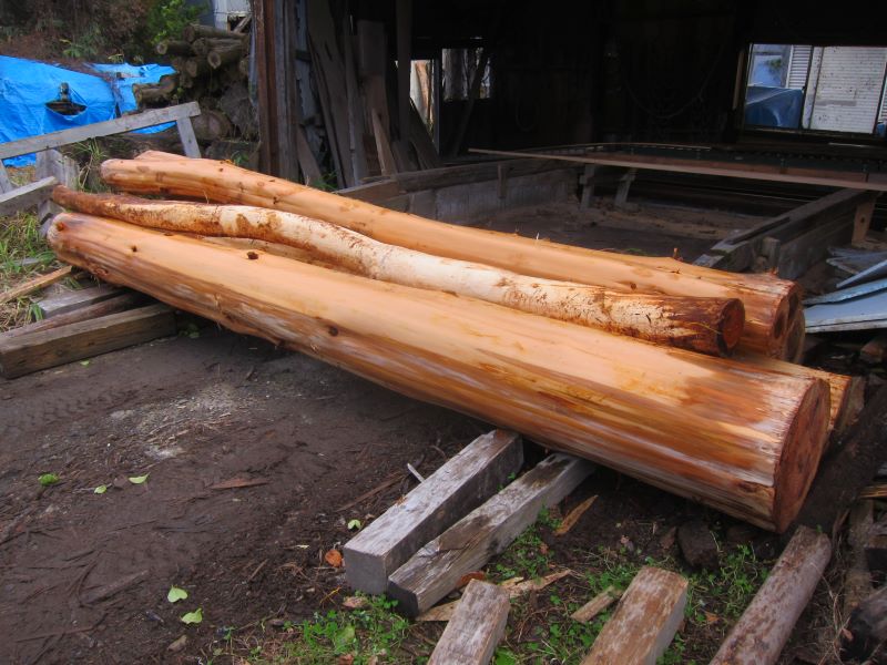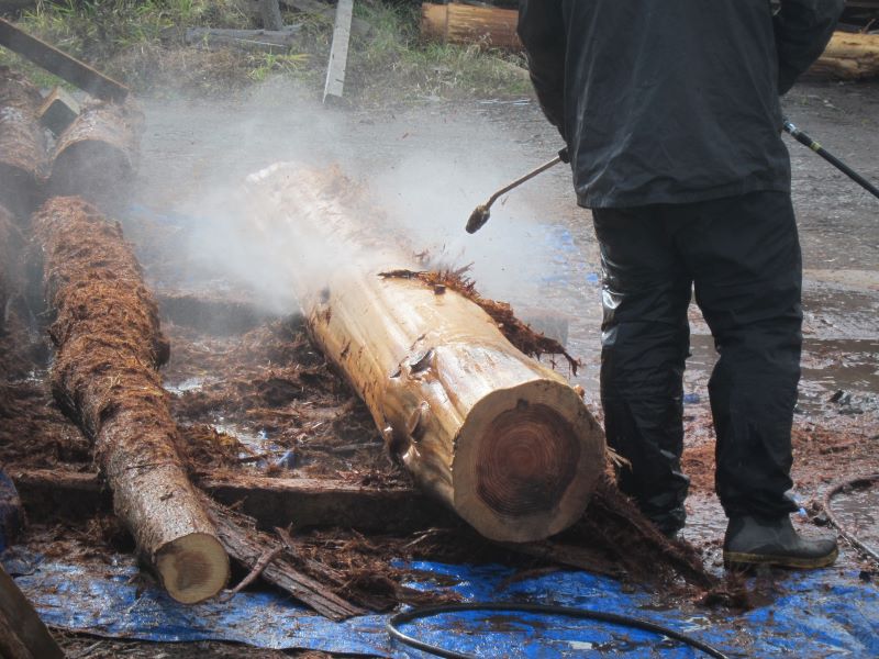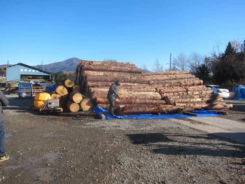 先日入荷丸太の樹皮剥がしをしています。青空の下ですが水なので寒そうに感じます。なによりもこの膨大な量です。