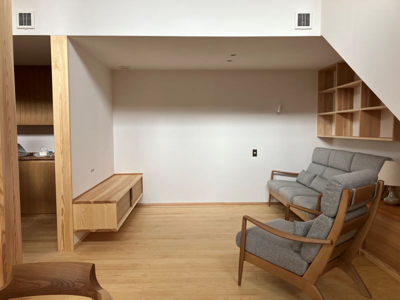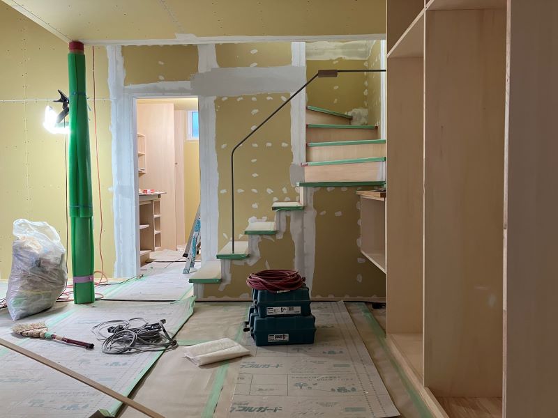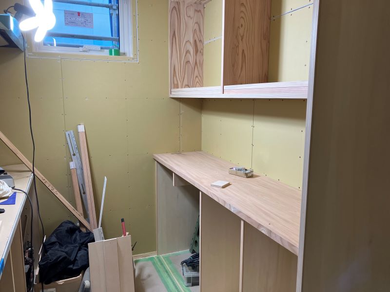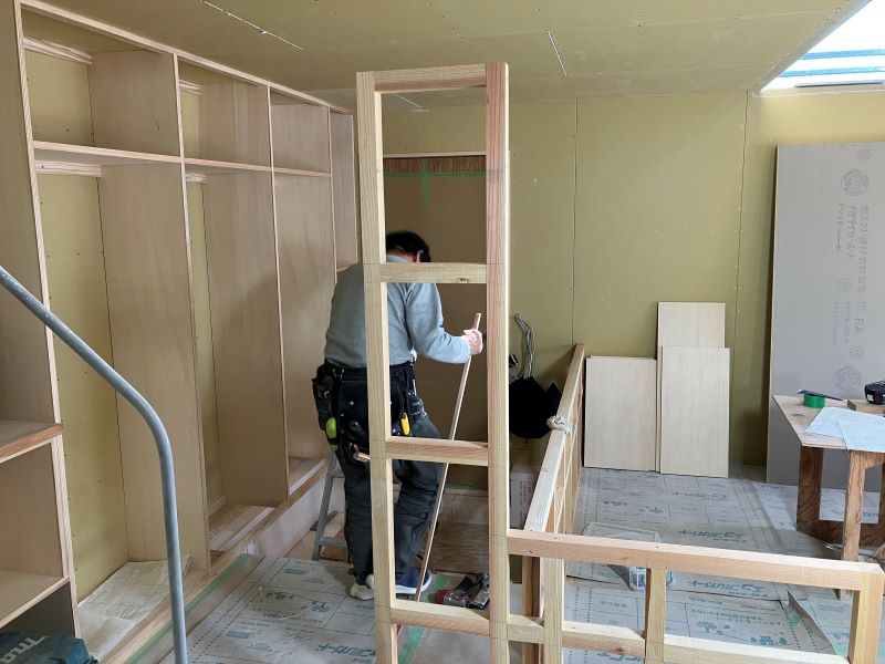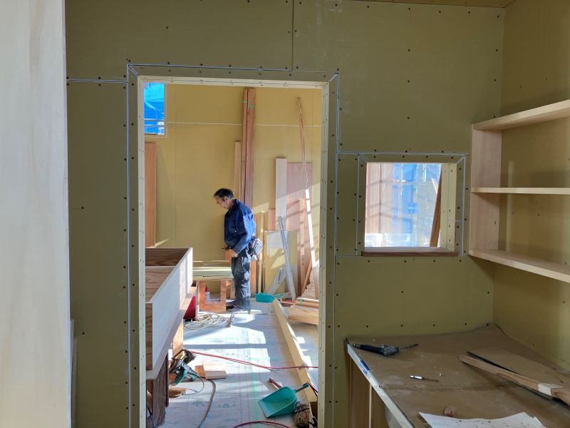 先日家族で2階内装塗り込みしていたみたけの新築住宅現場では1階も内装のパテ打ちが進む中大工の造作仕事を頑張っています。現場でも作業場でも収納棚類が細やかに作り込まれて階段下空間も収納として機能するコンパクトな家造りが取り組まれておりますので、竣工予定の12月21日22日は完成見学会を予定させていただきたいと思います。