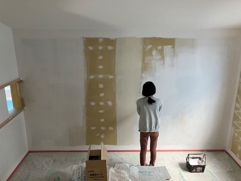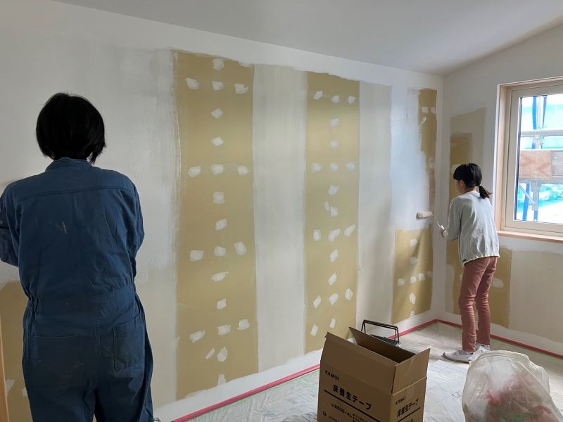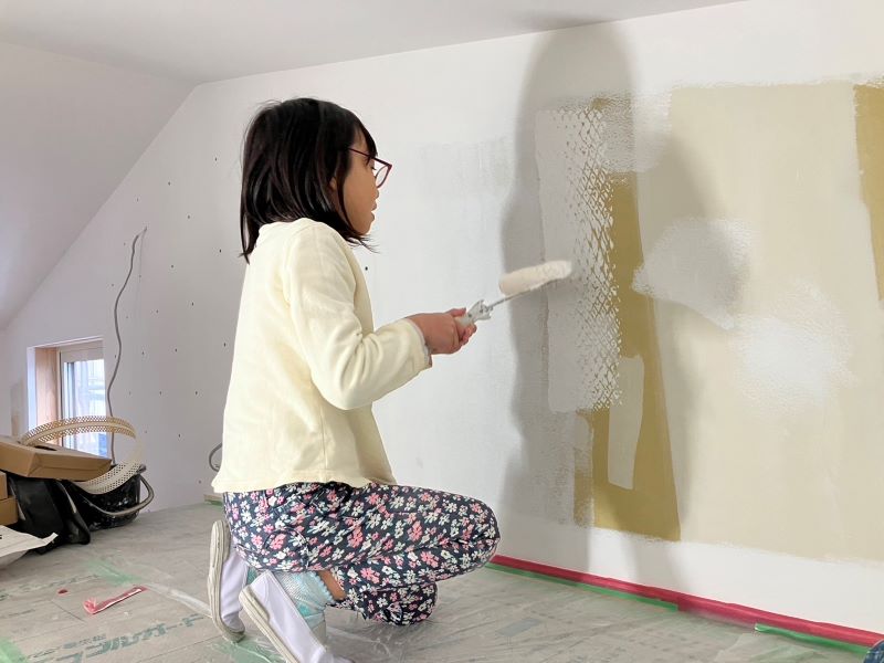 みたけの新築住宅では先日1階では大工がまだ作業する中で2階の内装チャフウォールの塗装をご家族みんなで取り組んだようです。写真を写したのはお父さんでお母さんとお子さんたちの背中が移る写真を貰って掲載しています。自分の住む家を自分たちで塗装仕上げするって楽しいでしょうね。下地処理はプロの内装職人がやってくれたし、査収的な仕上げ手直しも同様となるので安心です。2階がどんどん仕上がってきて大工さんたちは追われていますが頑張りましょう!チャフウォールとは、ホタテの貝殻を粉砕してペースト状にした塗り壁材で空気施錠効果がある自然素材なので体に優しい塗り壁材です。