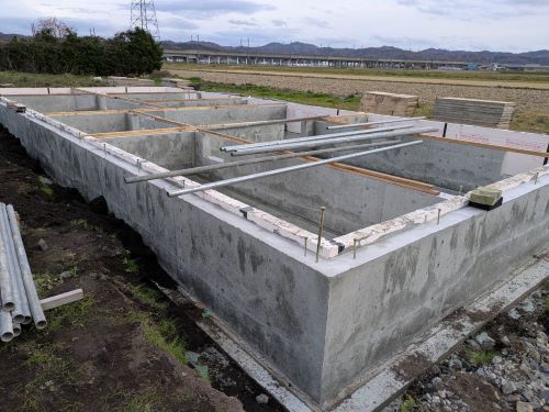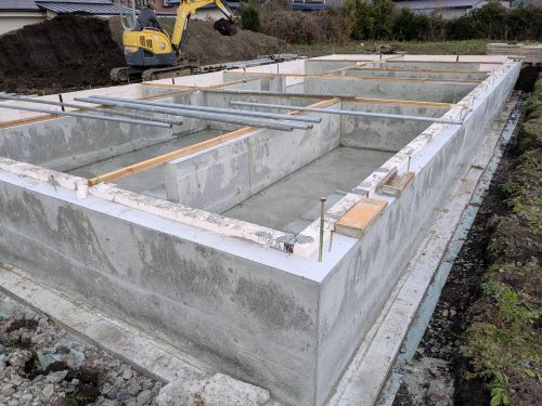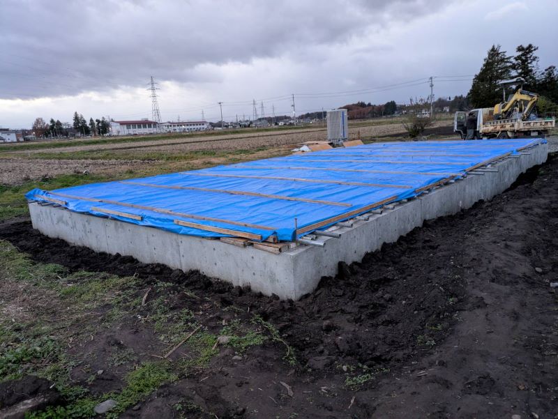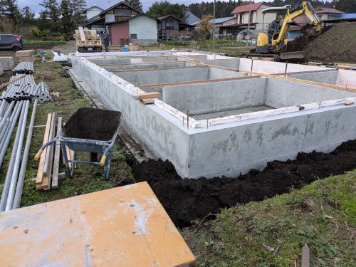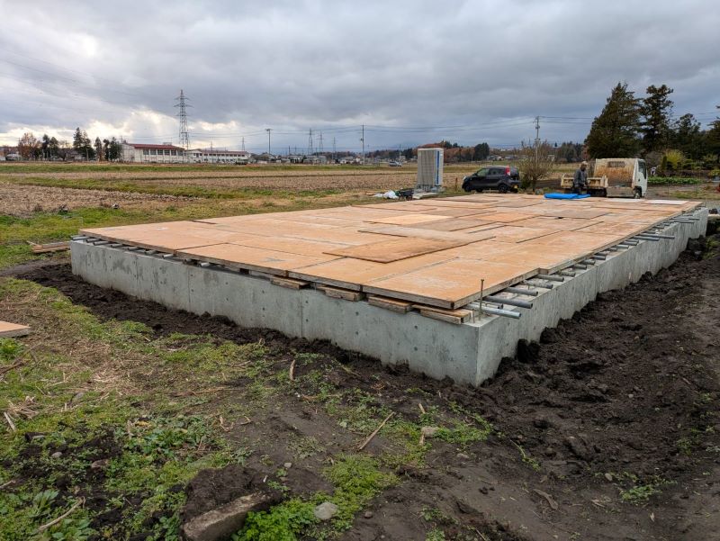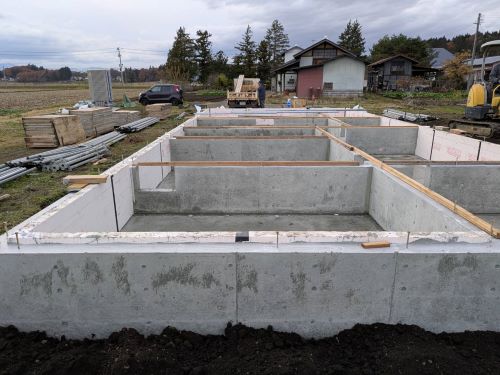 北上の新築現場では基礎の打設養生が完了して、基礎枠を外しその外した枠で基礎本体を囲い込み、冬超しの準備が出来ました。この冬の間に構造材の墨付け手刻みを行い、来春からの建込準備に入ります。遠方の雪国の場合は、雪が降り積もると工事だけでなく除雪からとても大変なので、このように工期をいただいてより良い住まい造りに取り組ませていただいております。この完成した基礎は総堀による耐圧版べた基礎で、内部の立ち上がりも外部の立ち上がり高さと同じ900ミリで全て打ち継ぎなしの一体打ちであり、地反力による曲げモーメントに対応した強度の確りとしている基礎です。床下空間も見た通りに取れる基でもあります。