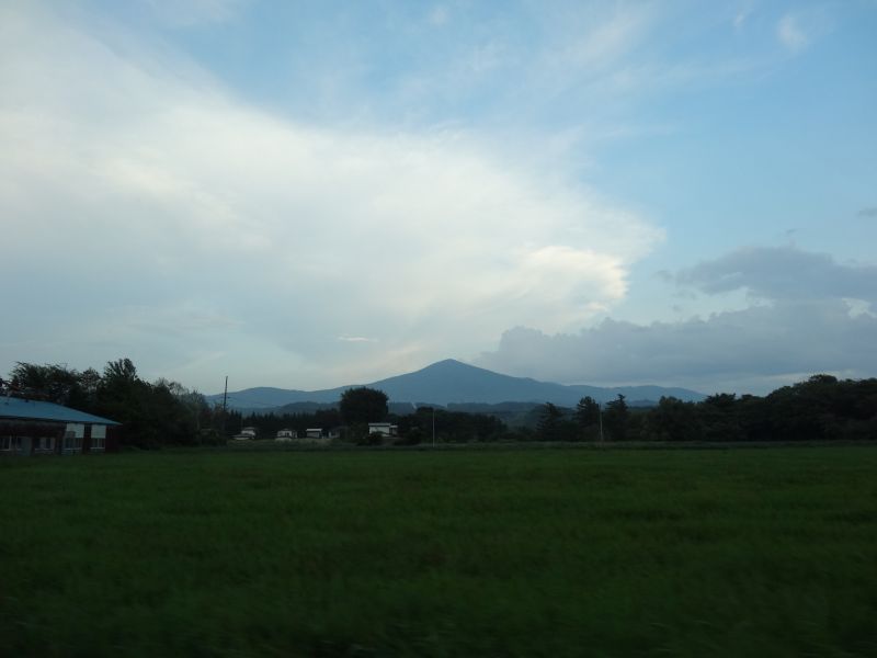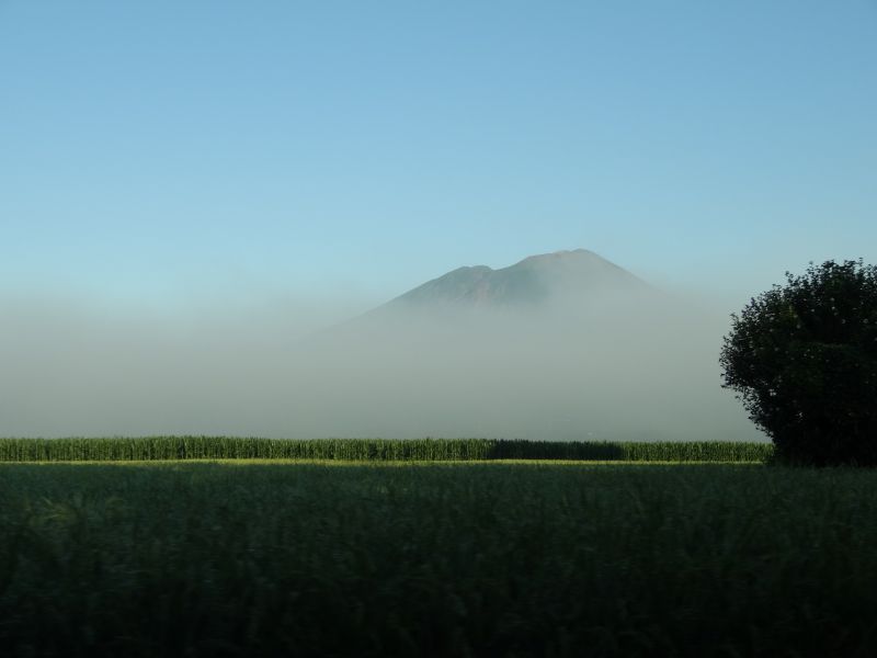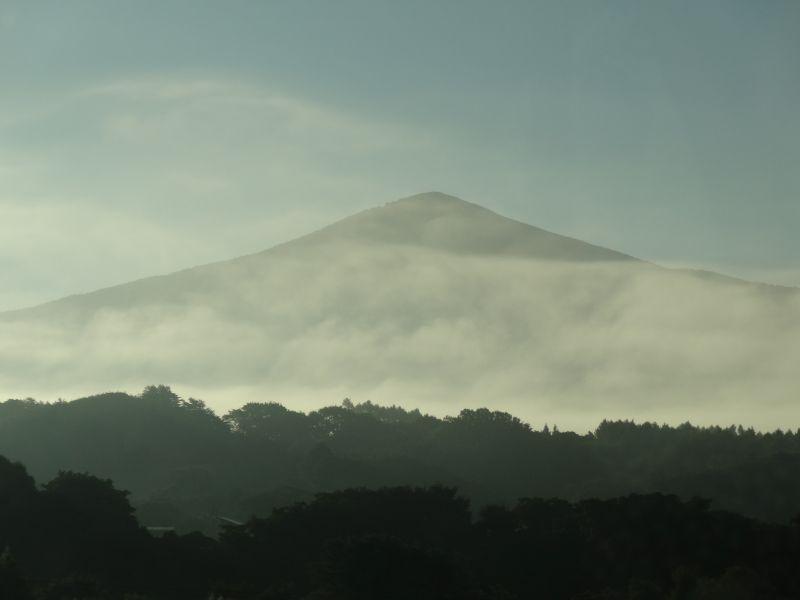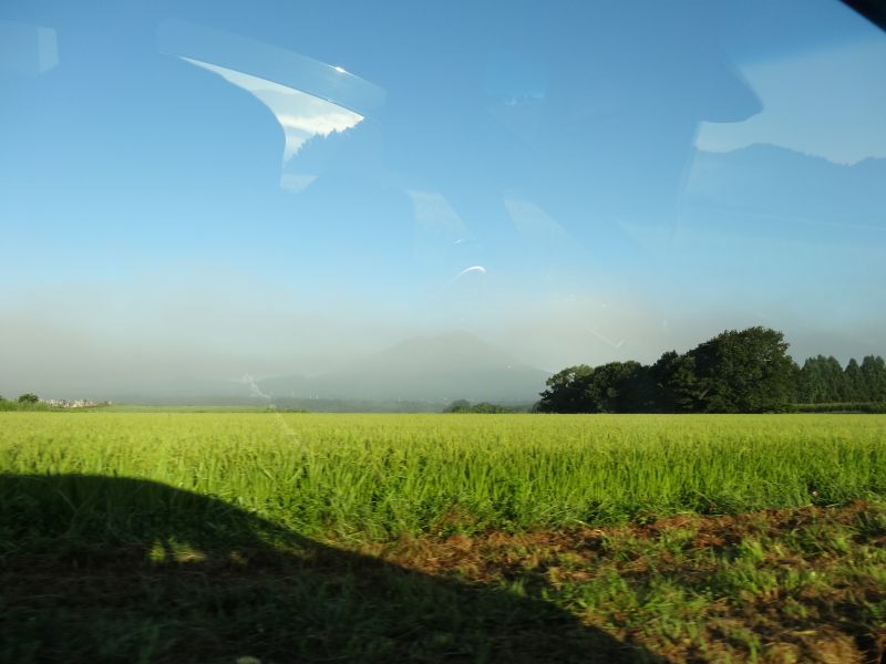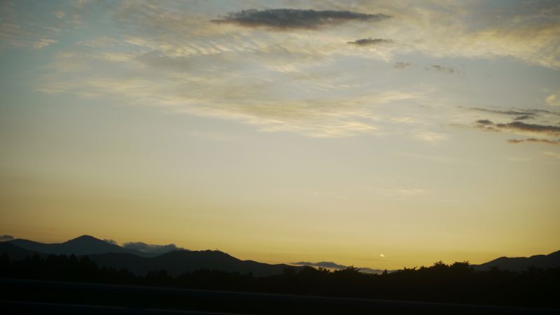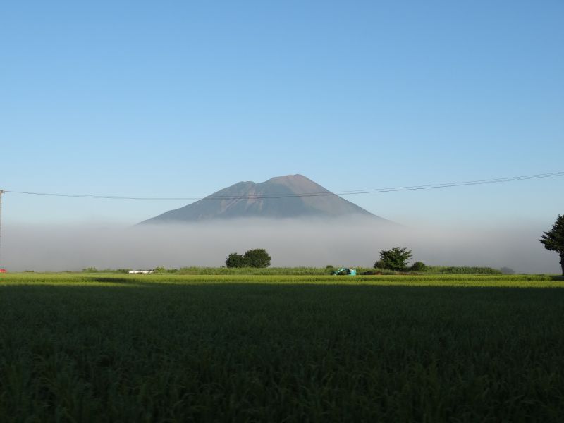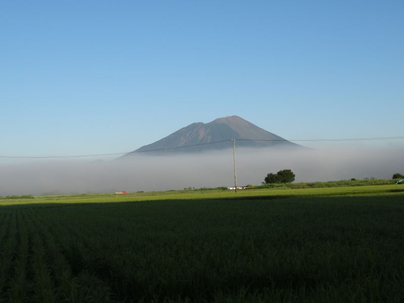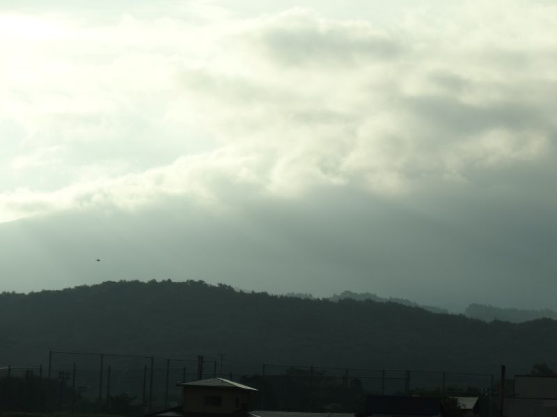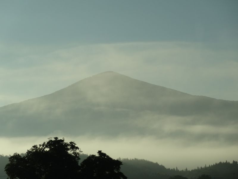 猛烈な暑さの日が続いた日の翌日温度が下がった朝を好摩に向かい走行すると、山々に靄が掛かり、山裾を靄が覆いそこに朝日が差し込んで幻想的な光景に出会いました。