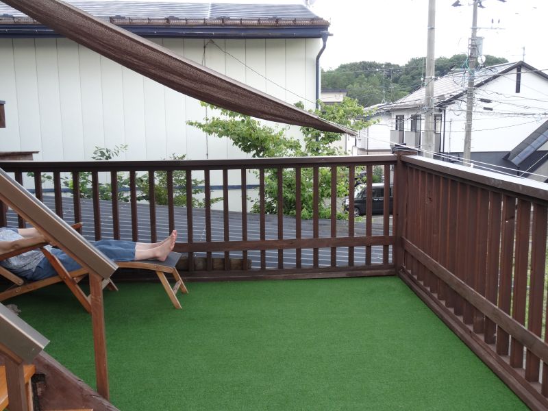 自宅のウt度デッキの床が傷んできたので、合板を張り込んでその上に人工芝を敷き込んでみました。高松の池方面からの風が吹き込んでとても気持ちよく寛げます。
