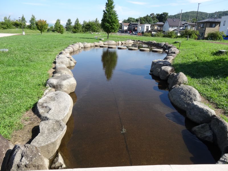 川留め神社の裏に回ると中津川の流れが美しく見えます。岩手山山頂には日本列島のような雲も見えて、川では近所の子らしき子供たちが川遊びしていました。