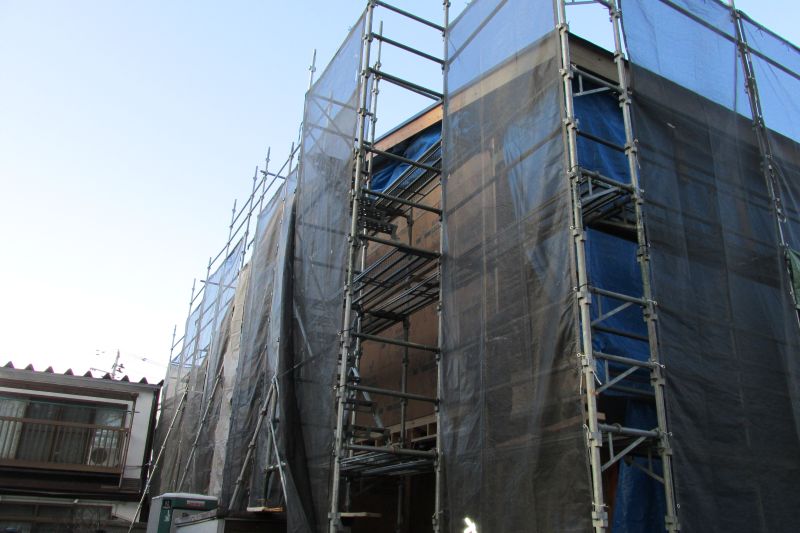 西青山の新築現場も鉈屋町の新築現場も外部の囲い込みが進んで、年末の年越しを迎える準備が出来てきました。特に鉈屋町は、狭いので足場と外部が近くて難儀しておりますが、頑張ってくれていました。