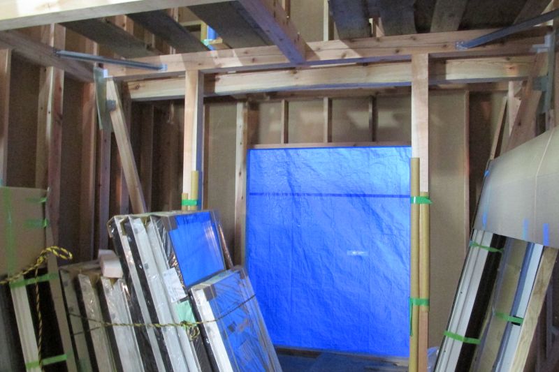 城西町の新築現場は屋根断熱工事が行われていました。大屋根の吹き抜け部には、内部足場を組んでの施工です。南側の大開港は木製サッシで、豪華です。