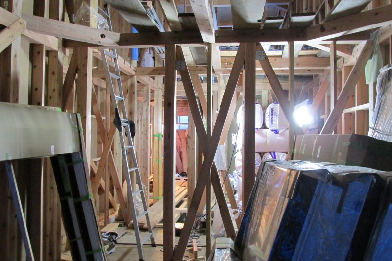 鉈屋町での新築現場は、雨で屋根が出来なくて、金物取付を進めておりましたので、地震でも建物は問題なく大丈夫でした。何が幸いするか分かりませんね。そして、屋根はその後葺きこみが進みました。そして、耐震筋違いの取り付けも進んで更に安心です。この後構造面材が張り込まれると耐震等級3の構造躯体が出来上がります。