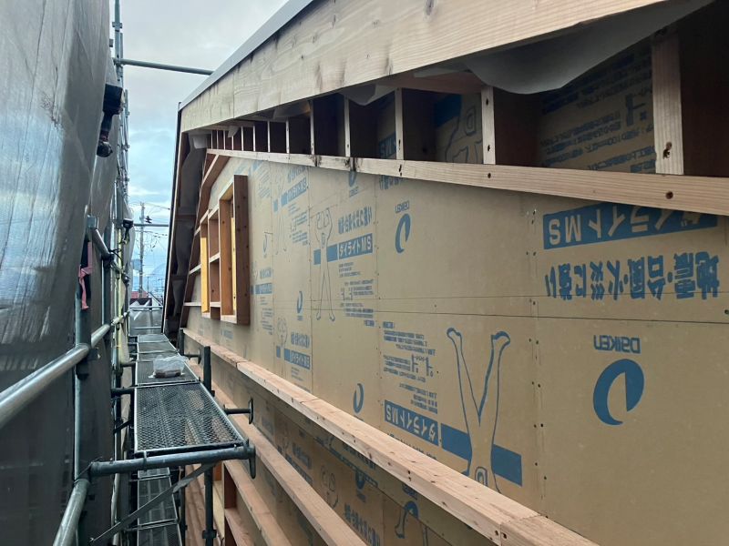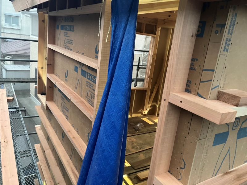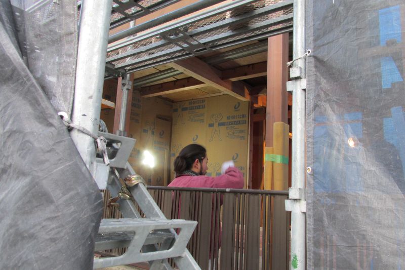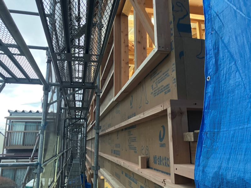 狭い敷地ながらも頑張って外周部構造面材を張り込みました。「地震に強く台風にも火災にも強い」構造躯体が出来あ買ってきました。この次は熱性能をきちんと数値化できる断熱工事とトリプルガラスの樹脂サッシの施工が進めば暖かい工事現場へと進んでまいります。館門の内にはその純が出来て来た様子もうかがえます。