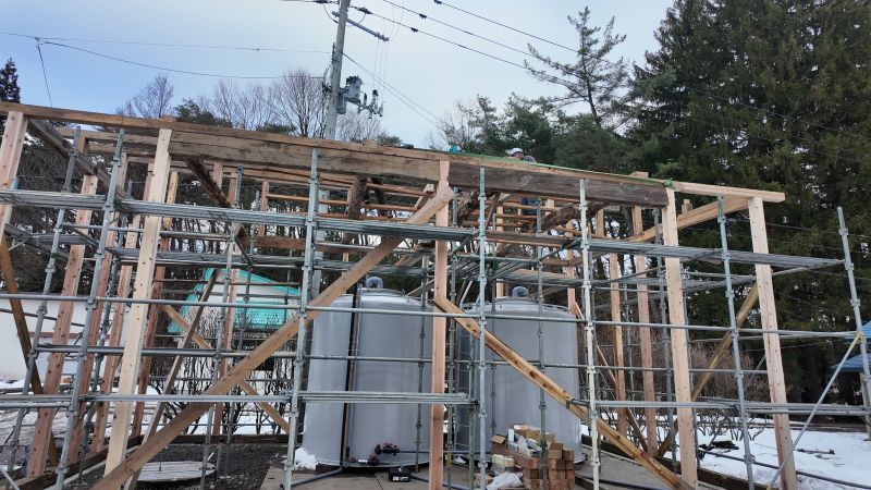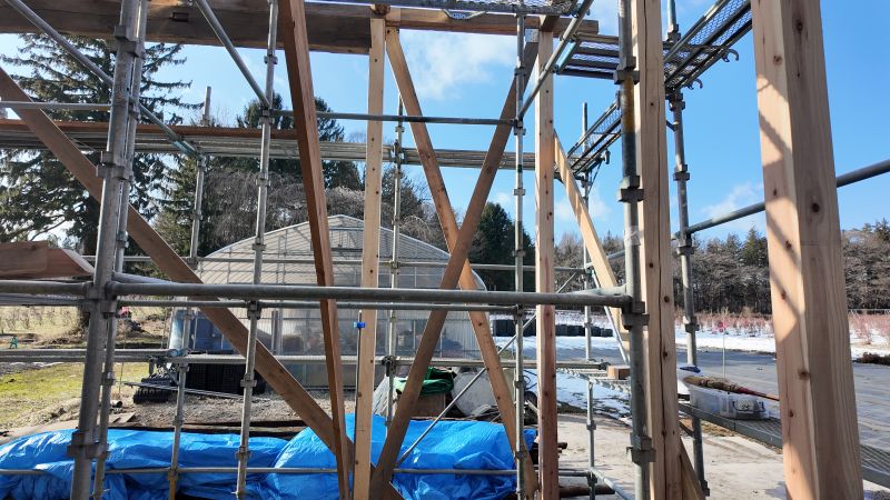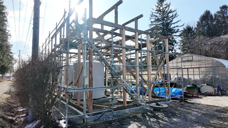 師走上旬に上棟した鉈屋の新築工事は、屋根を葺き上げて筋違いも取り付けて間柱窓台の取り付けも進んでいます。現在の電動工具には、充電器がつきものなので、雪や雨で濡れて困らないように現地に置いた小屋に電線を引き入れて金物置き場の小屋内部で充電しています。小屋を置かせていただいているお隣様に大感謝です。
