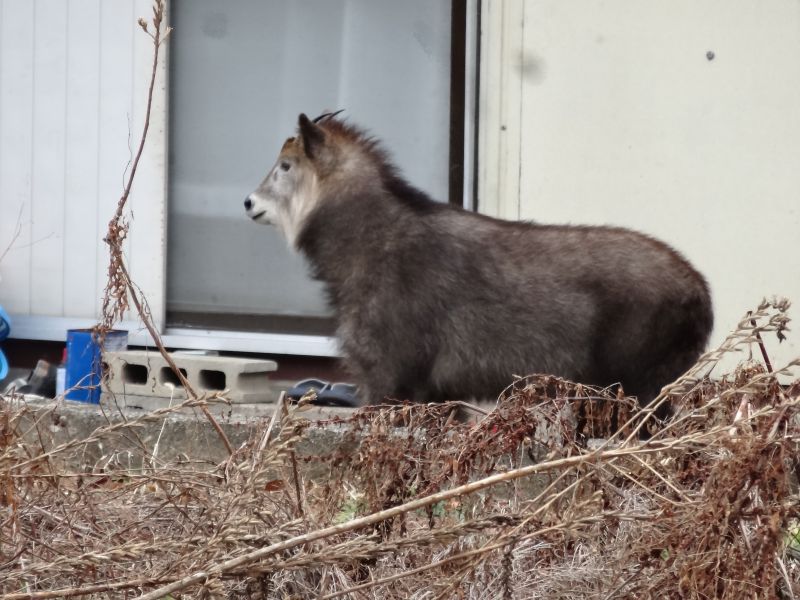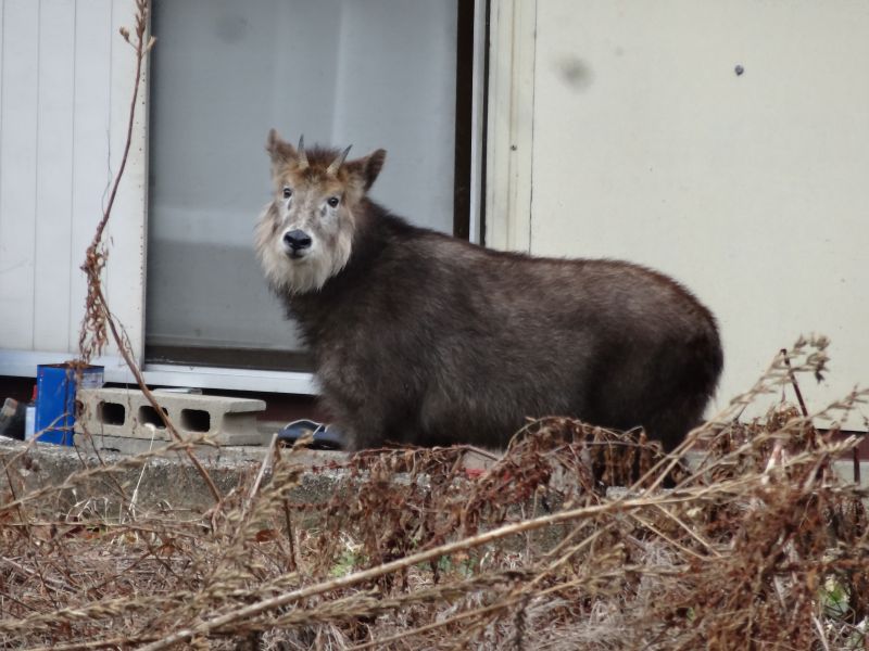 最近歩行カウントが低いので、歩数計の数値上昇を目的に朝の散歩に出ましたところ、お向かいさんの玄関先に山鳩のつがいらしきのが居たので、カメラを向けていると、左側方向から何やら殺気の様な何かが近寄ってくる気配を感じて見ると、写真の通りカモシカが近付いて来るではないですか・・・息を潜めてカメラを向けて写真を写すと避ける様に隣の藪に入り込んで行きました。そして明らかに私を見ていますが、逃げるそぶりはなく、堂々と悠々と歩いて行きました。この出来事にワクワクしながら公園まで歩いて行き、水辺で子供が遊ぶ姿を眺めて腕の回転リハビリ具を回しながら上空を悠々と飛ぶ鳥を眺め、人の暮らしの中に森の動物が息を潜める様に暮らしているんだな~ぁと感じました。しかも、人に慣れている雰囲気です。