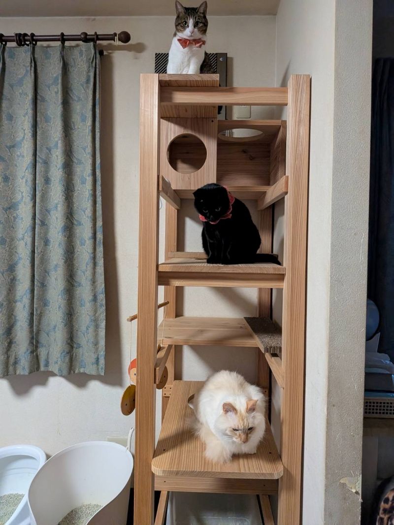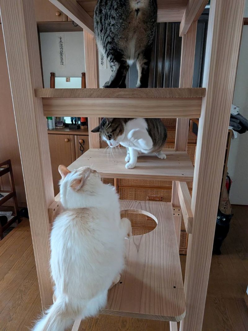 森の秘密、これは蜂蜜です。盛岡市紺屋町の「森の百花店」様からいただきました。11月28日の岩手日報にも「生物多様性味わう蜂蜜」として紹介されていました。詳しくはチラシの写真を載せますので、拡大してみていただけたら幸いです。他の写真は猫も多様性があります。薪ストーブ前でスフィンクスみたいになっているのや猫はこたつで丸くなるそのものや、ネコタワーで遊ぶ子たちと様々です。この木造りの猫タワー当社制作で、ご購入いただいたお客様からの写真です。