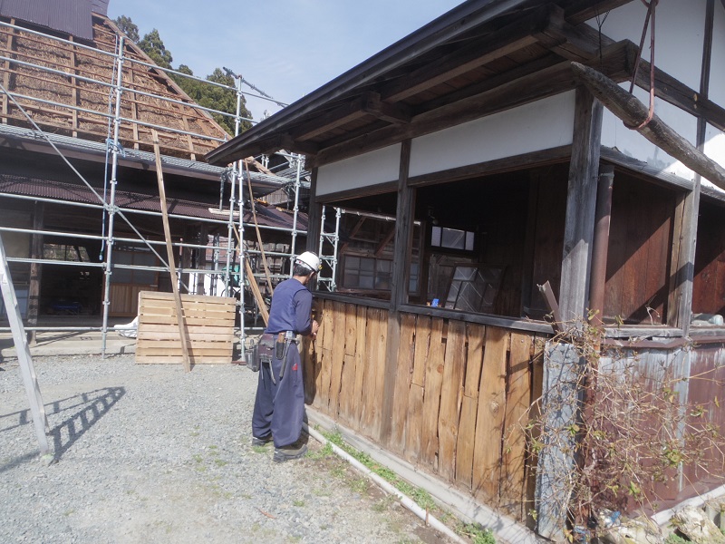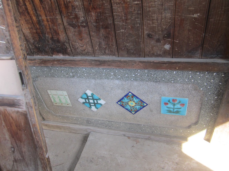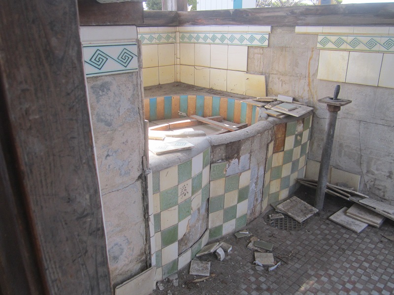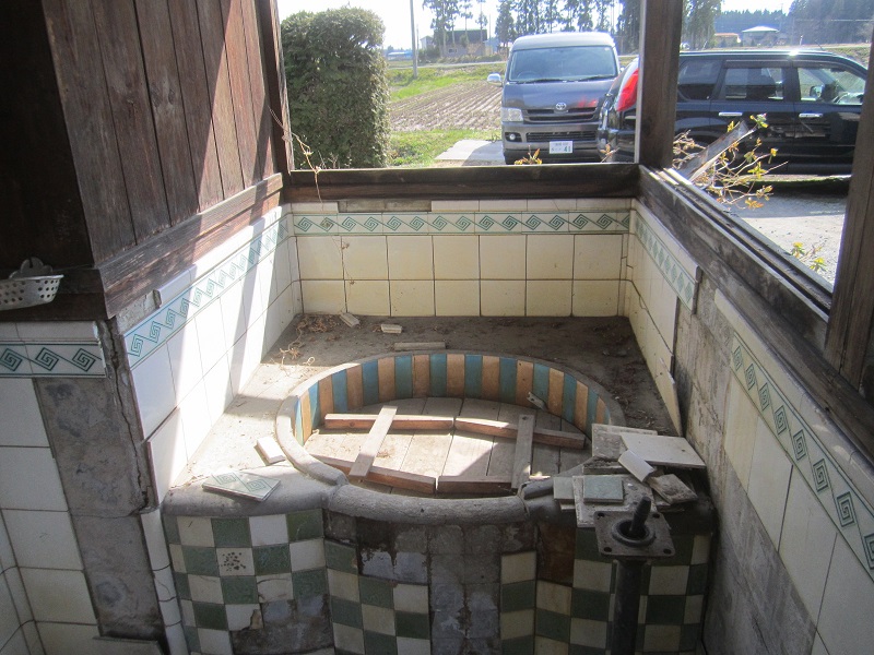 花巻市の茅葺屋根の取り外し工事が進む現場脇には、昔の古い外風呂があって、そこも解体依頼されております。いざ解体しようとして中に入ると、タイルや煉瓦造りのとても面白い浴槽がありました。