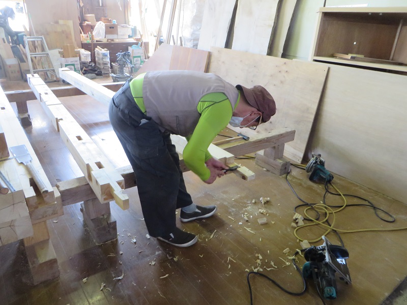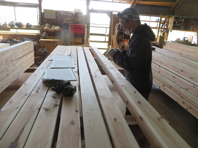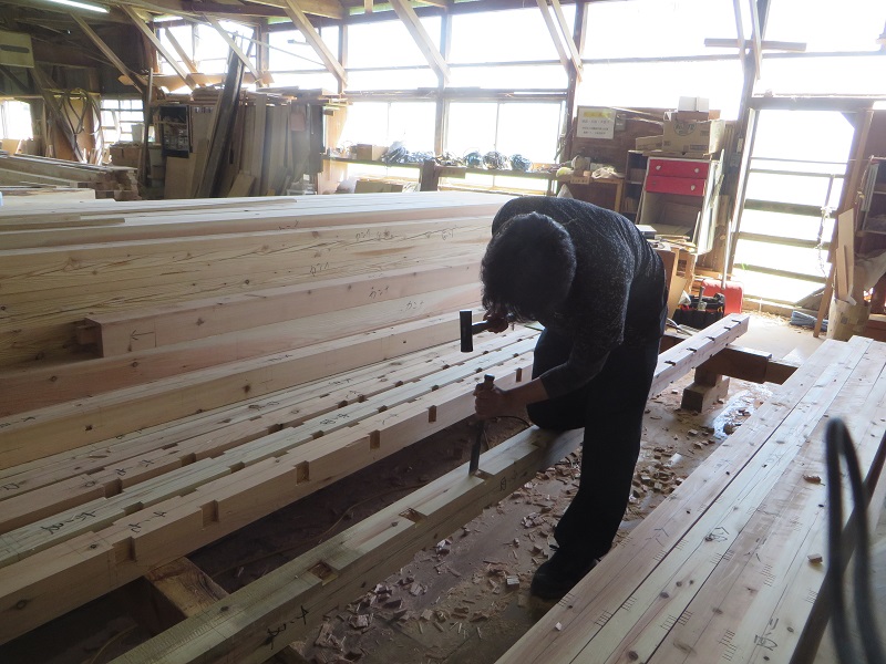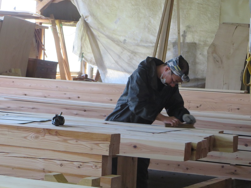 墨付けを終えて、8日土曜日木材の清めをさせて頂いたので、昨日から刻みを始めました。刻み材は浄法寺の新築現場に向かいます。