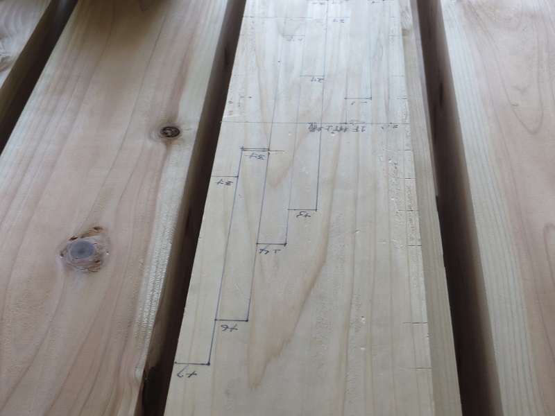 柱の墨付けには、この梁の上がり下がりを刻んだ定規がとても重要で役立ちます。