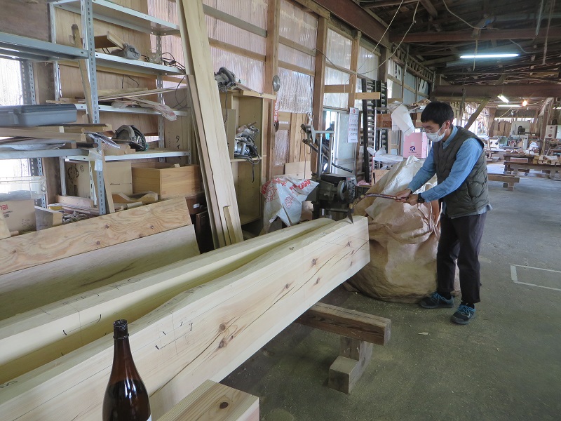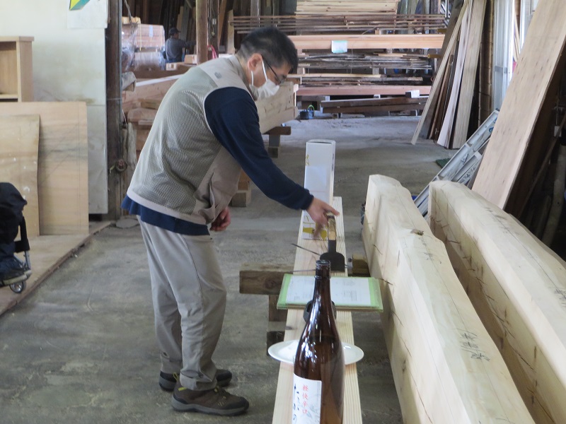 墨付け棟梁大工がお神酒、設計担当の栗城が塩ですべての構造木材を清めさせて頂きました。