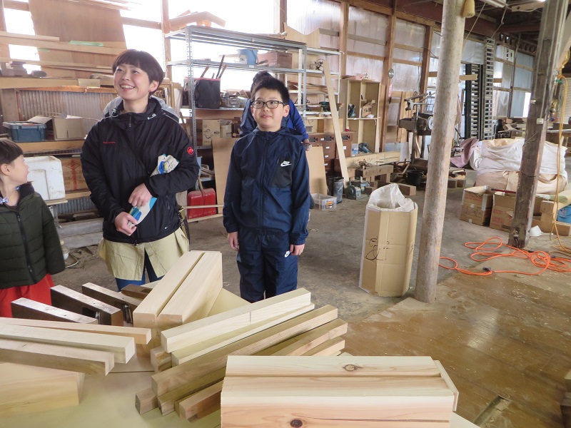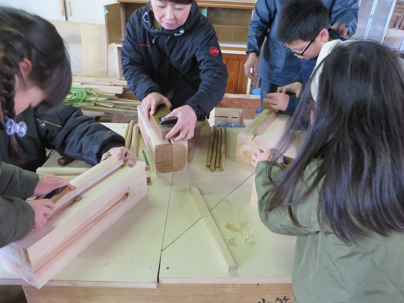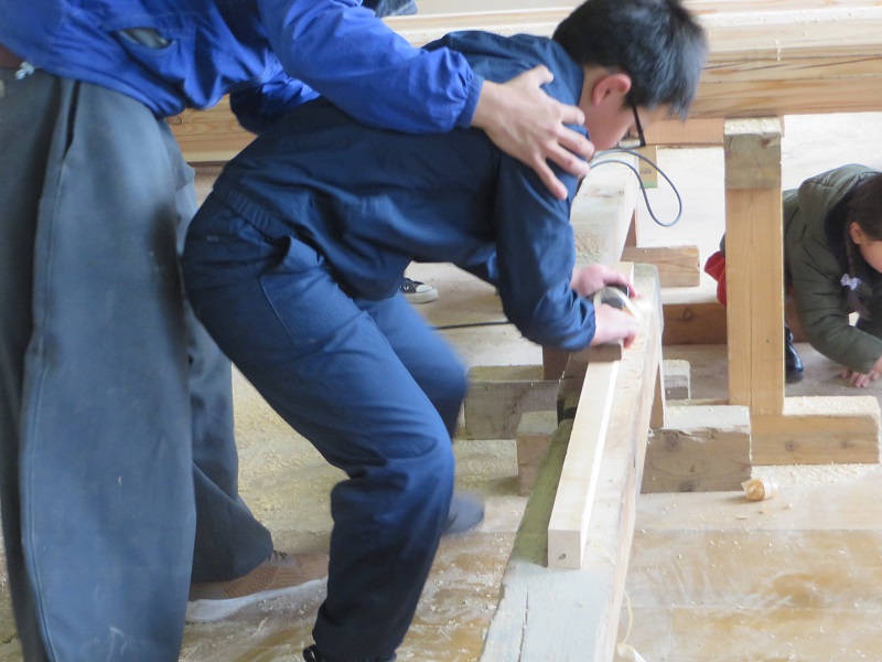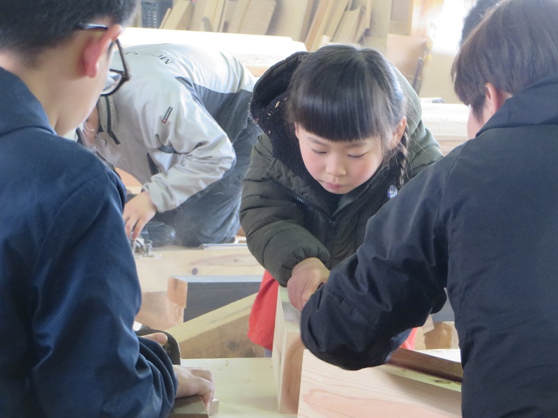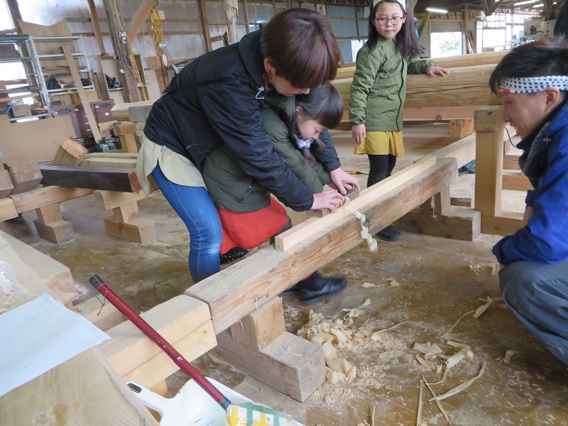 最初寒そうにしていたので、鉋掛け体験に切り替えて体をほぐしました。