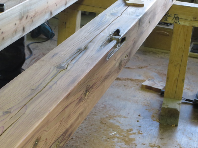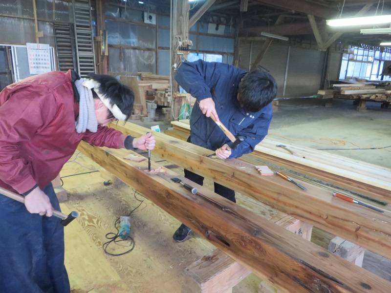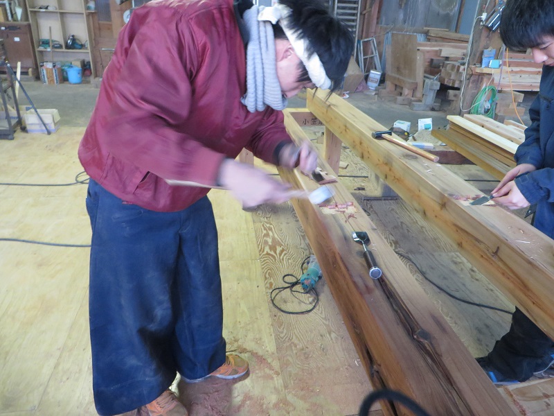 「杉なのに固いです。」と樹齢150年の凄みに驚く若者たちです。