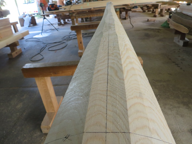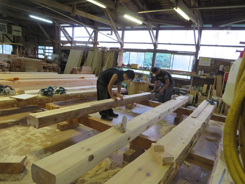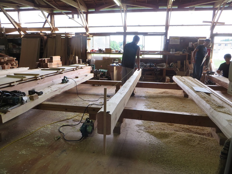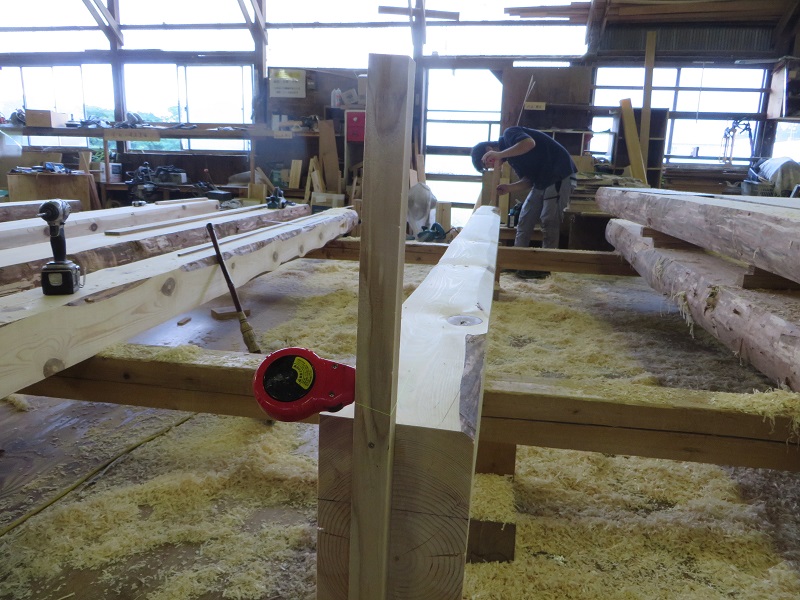 引き続き太鼓梁体造りが続いています。木造でもS造RC造でも天井を張って構造を隠すと、何ら変わらない四角い部屋になるだけですが、当社では構造が見える仕上げになるので、構造木材も意匠的に綺麗に仕上げて魅せるものとなりますから、この段階から意匠的な加工が必要となります。