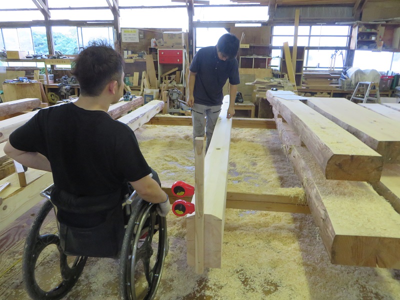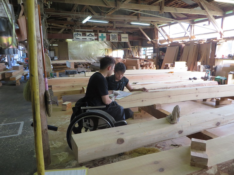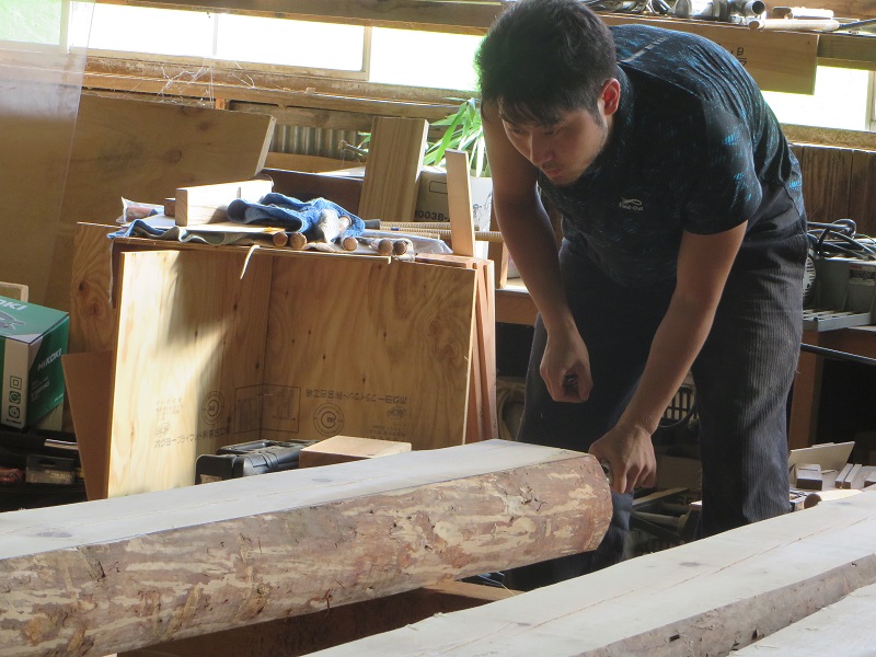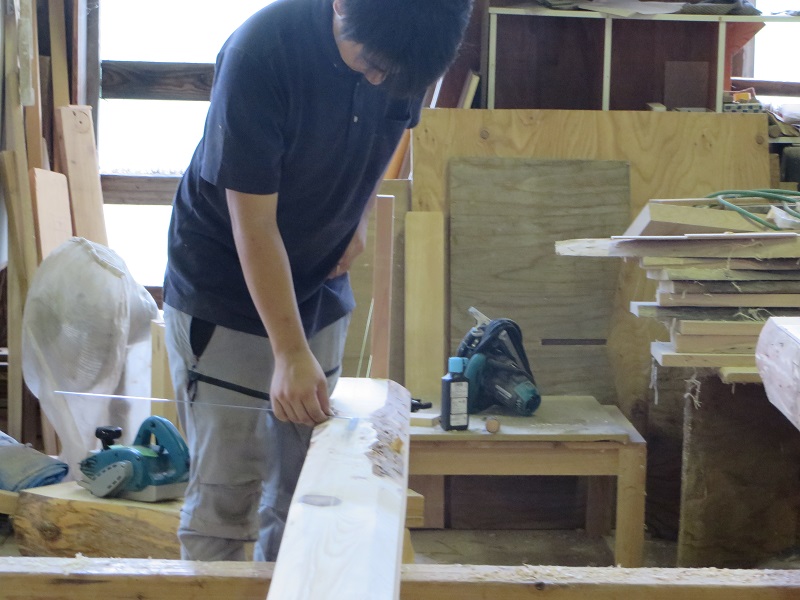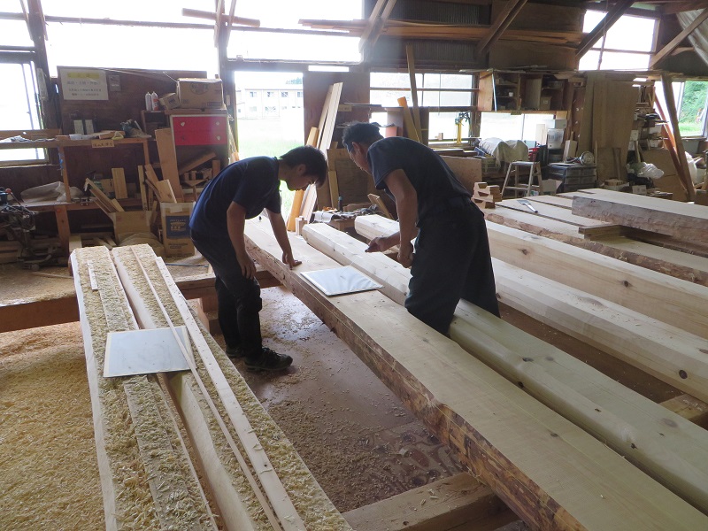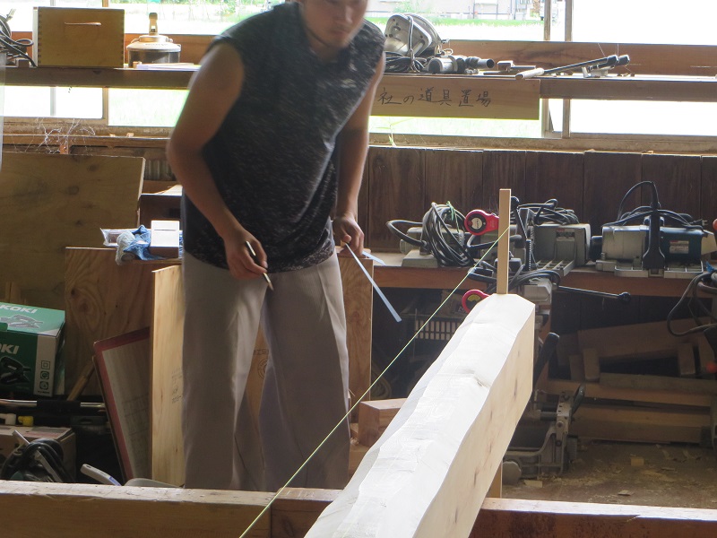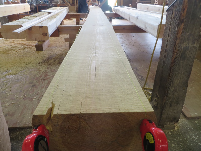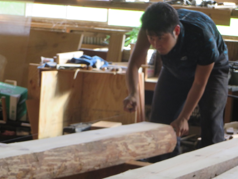 大きく切り落とししたい時には、製材機が便利です。しかも使いたい墨を大工が出しているので、効率よく修正挽出来ます。そして今回は、製材機の台車の扱い方の説明が成されて、若手大工が自分で製材しました。こうして、製材機の安全な使い方を覚えて、来春入荷予定の丸太の製材も皆でしようとの事になりました。