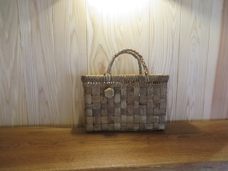 これは、専務手作りの樹皮編み籠です。胡桃の木の樹皮で造りました。この様な籠造りのワークショップも時々開催していますので、お問い合わせ頂ければ幸いです。