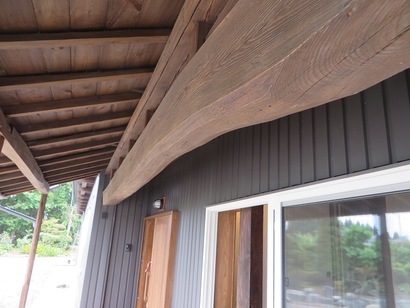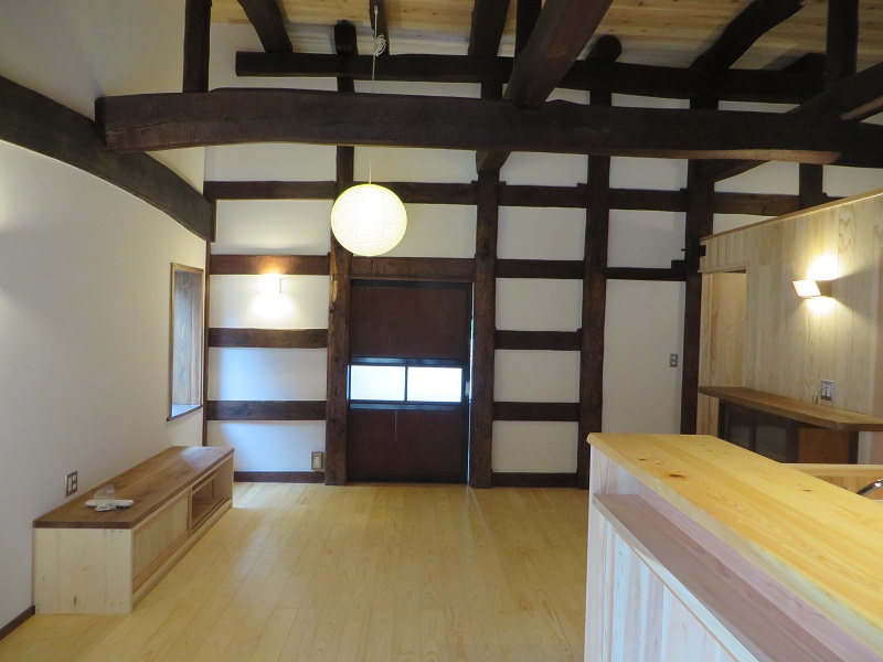 黒い横貫と白い壁のコントラストが古民家改修での醍醐味でした。