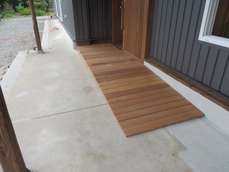 左側はサンルームで、右側に水回り、正面は台所とその後ろの収納部と直結している収納棚やベンチ付き廊下です。