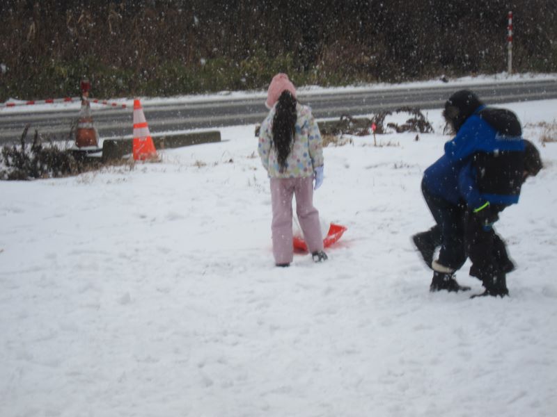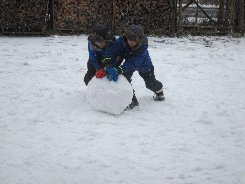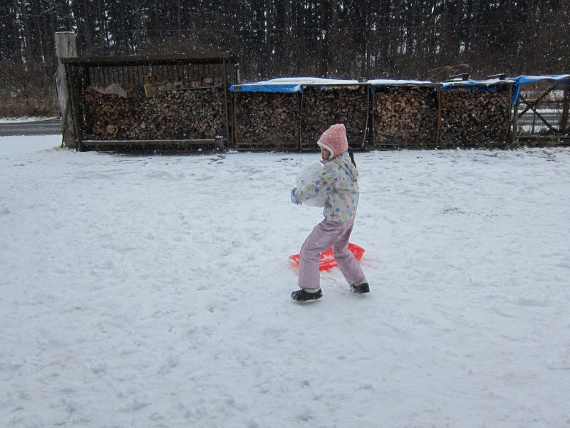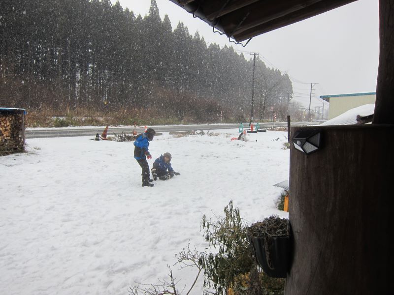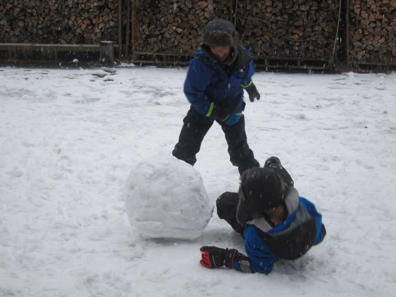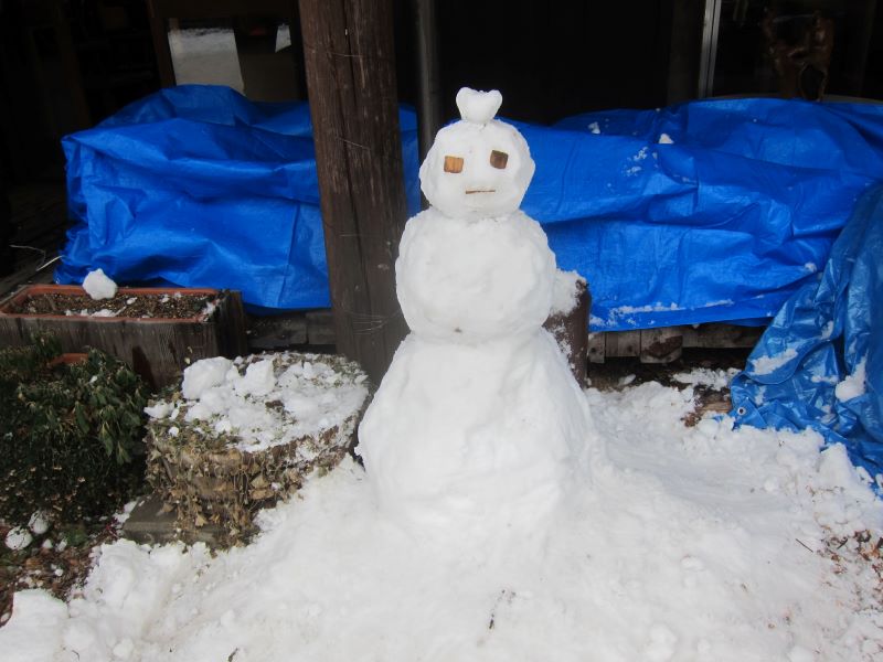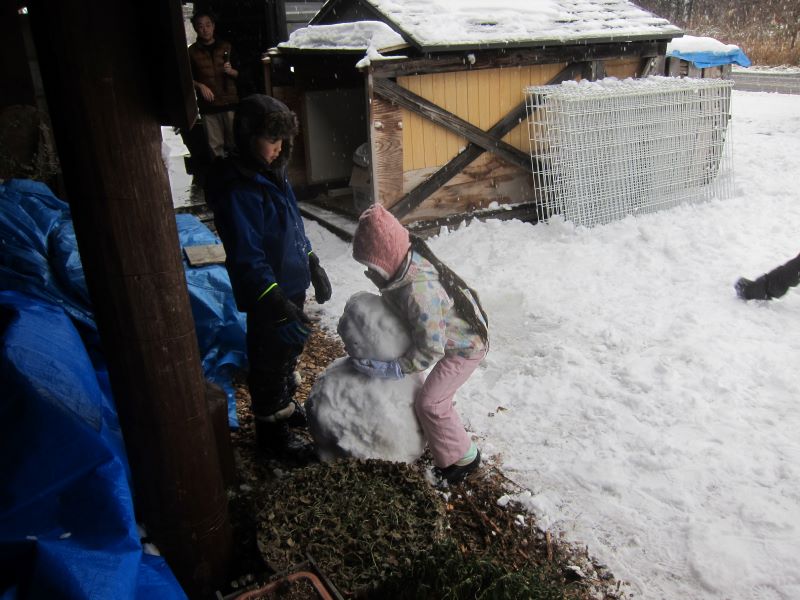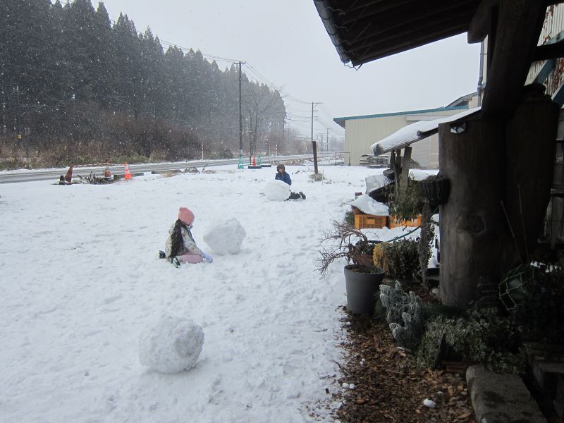 孫たちは餅突きの傍ら、降り始めた雪の中で、三兄弟楽しそうに雪だるま作りをしていました。子供らしさとは、餅突く義務感よりも楽しく遊ぶことですね。見ているこっちが楽しくなりました。
