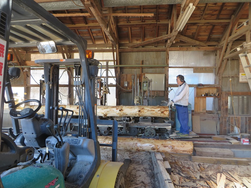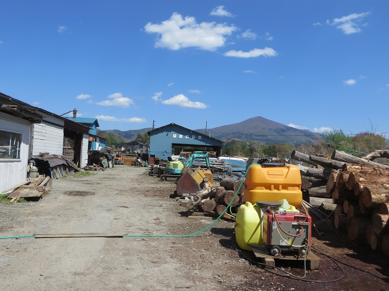 すごくいい天気です。向こうの奥では製材した板材の桟積みをしています。