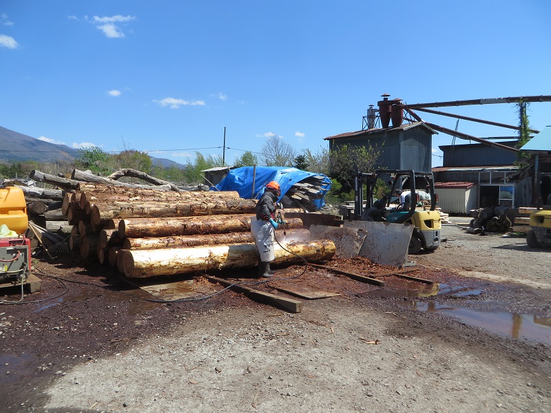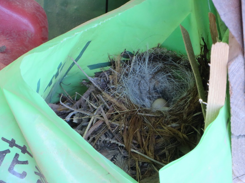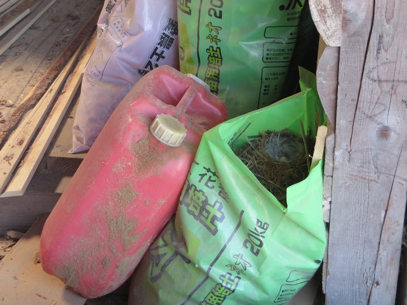 ゴールデンウィーク連休明けの当社場内では、製材作業がまだまだ続いておりました。凄く良い天気で青空の下積み上がる梁や板材の美しさに気分良くしております。木の樹皮を入れた袋にはセキレイの巣も出来て、卵も見えるので、そっとしておかねばなりませんね。