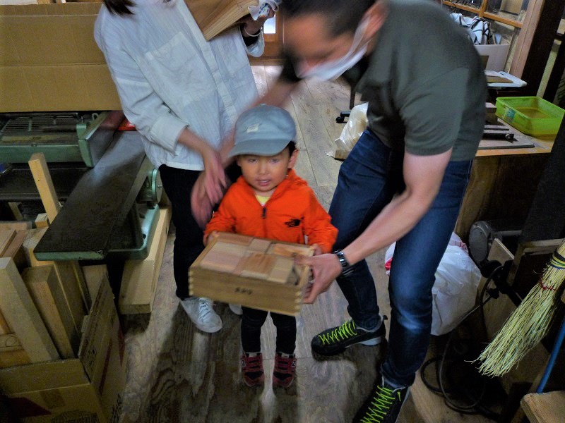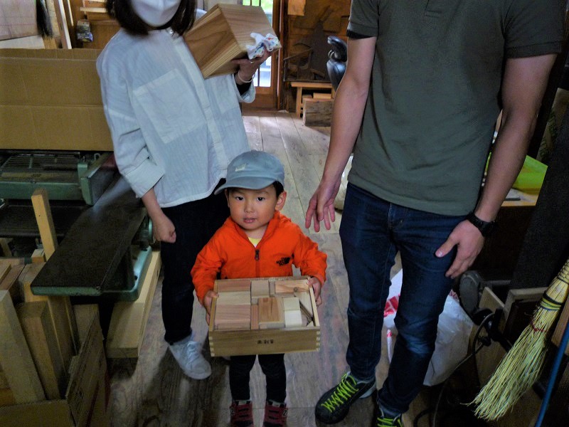 先週土曜日、新築工事中のお施主様打ち合わせでしたが、山羊と遊んだ後で積み木の箱1セットをご購入いただきました。記念すべき第一号様として記念撮影させて頂きました。