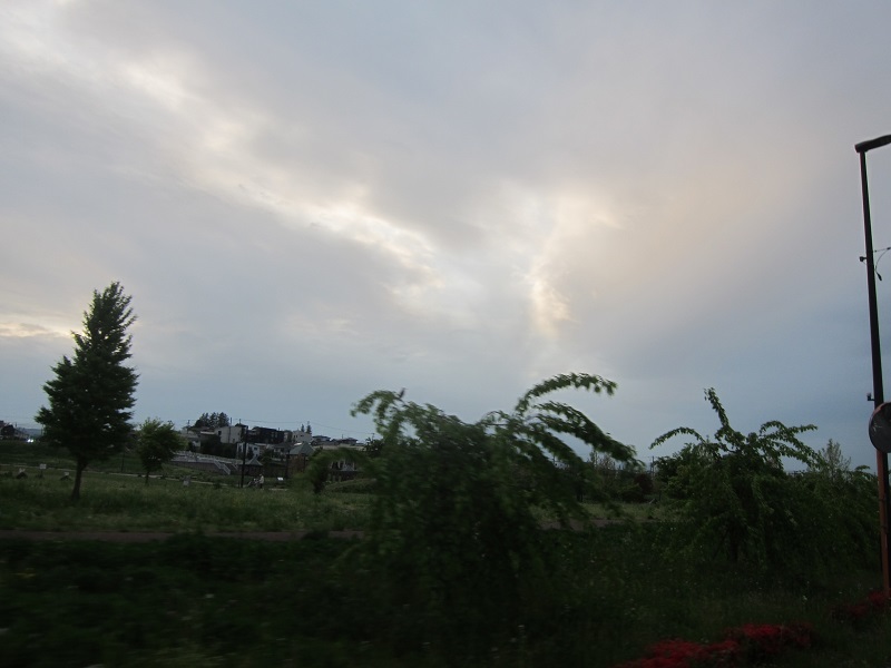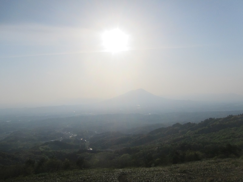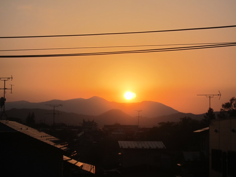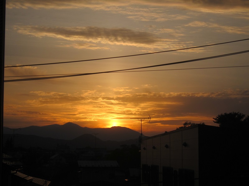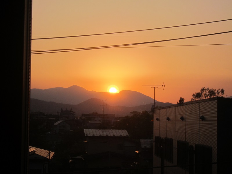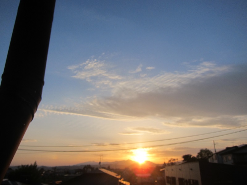 天峰山から、盛岡市内方向や岩手山を望む景色です。光景とも言いたくなります。のが、天峰山を下って自宅に戻って見えた西窓への夕日です。この通り連休中は好天でしたが、今朝は雨ですね。
