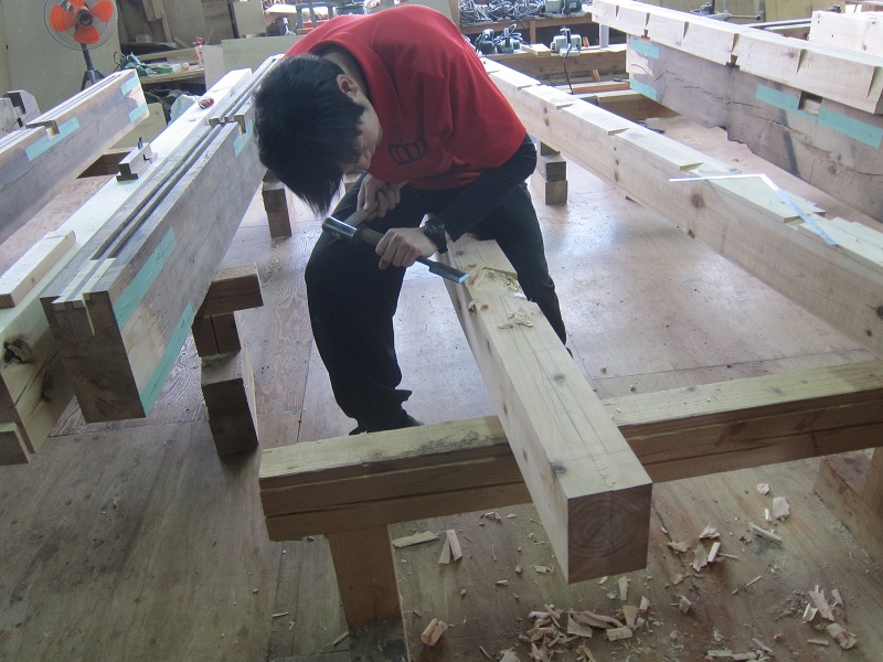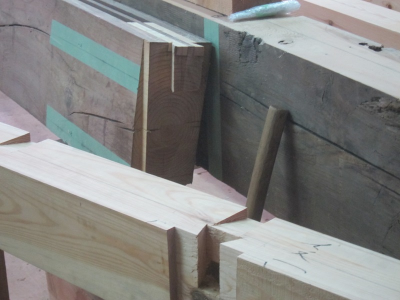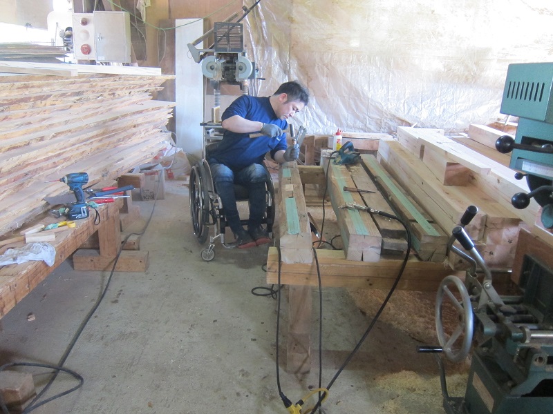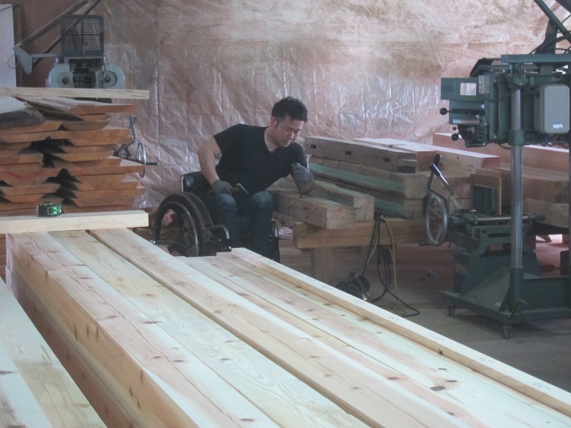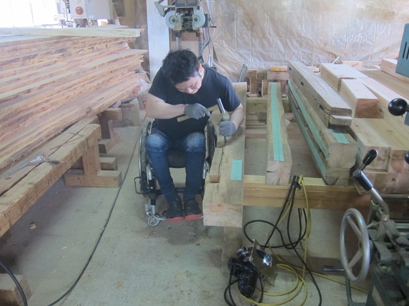 連休前には、新たな車庫追加工事の構造材の手刻みが取り組まれていました。車椅子大工も若手大工と共に刻んでいました。古材を使うので、古材の捻じれや歪みに対応すると仕口が斜めになっていたりするので、木を相手の仕事の柔軟さが身に付いてきたかに思われて、嬉しくなりました。