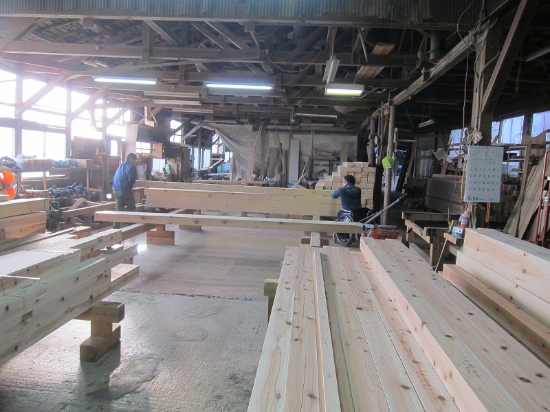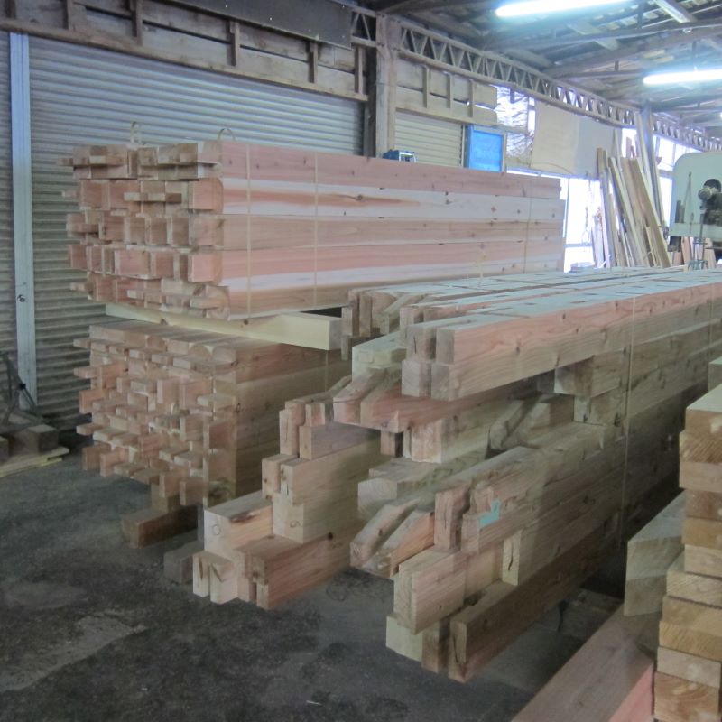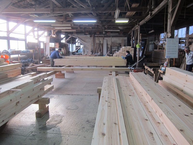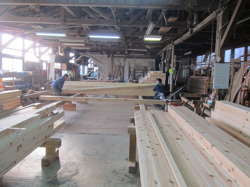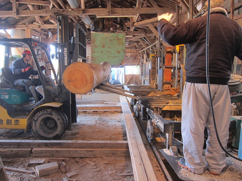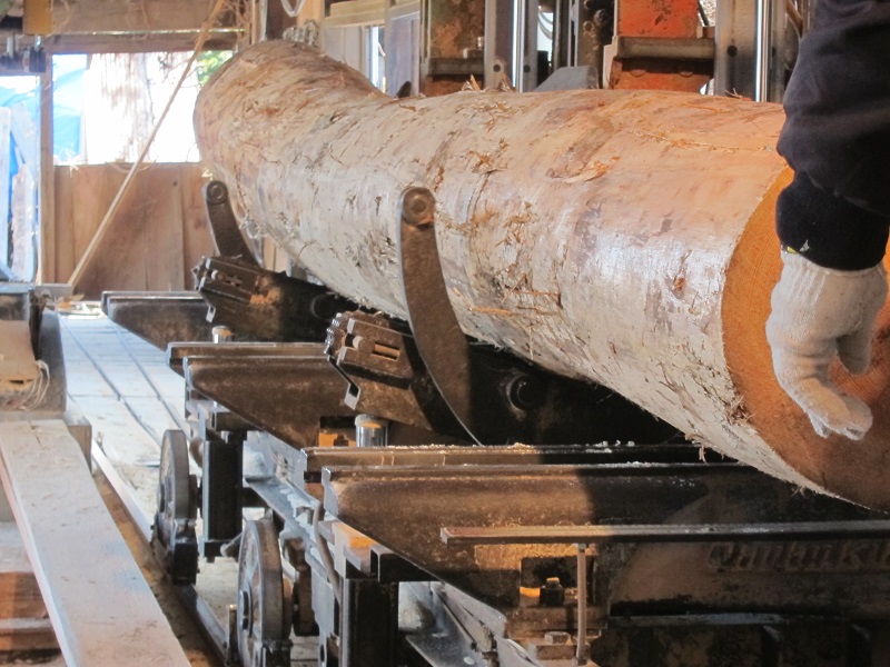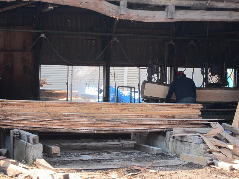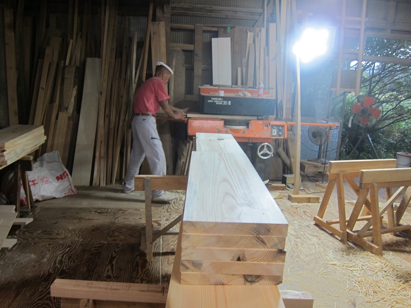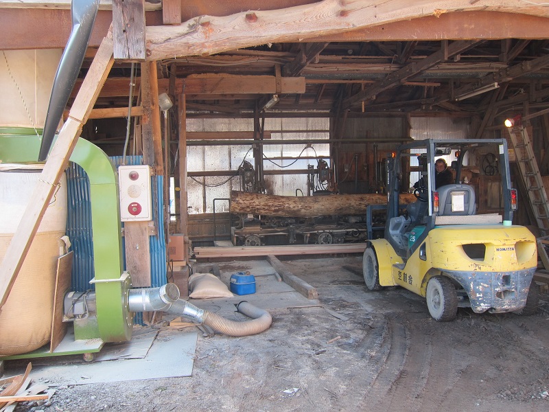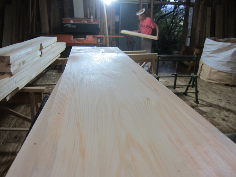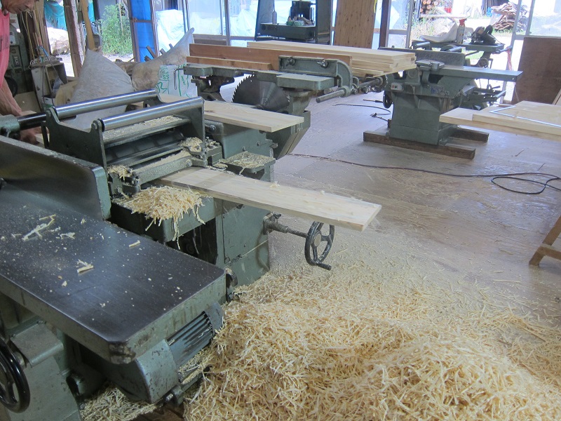 次の新築工事の構造材の修正挽に取り組んでおります。台車に乗ってサイズを見ながら調整する家具職人とそのサポートが一人、製材されて出来たセッカ板を片付ける担当が一人の計三人で行います。桟積天然乾燥しているので、乾きながら反ったり割れて膨らんだりするので、このように直角で真っすぐな材に修正できる製材機の扱いがとても有難く大切です。