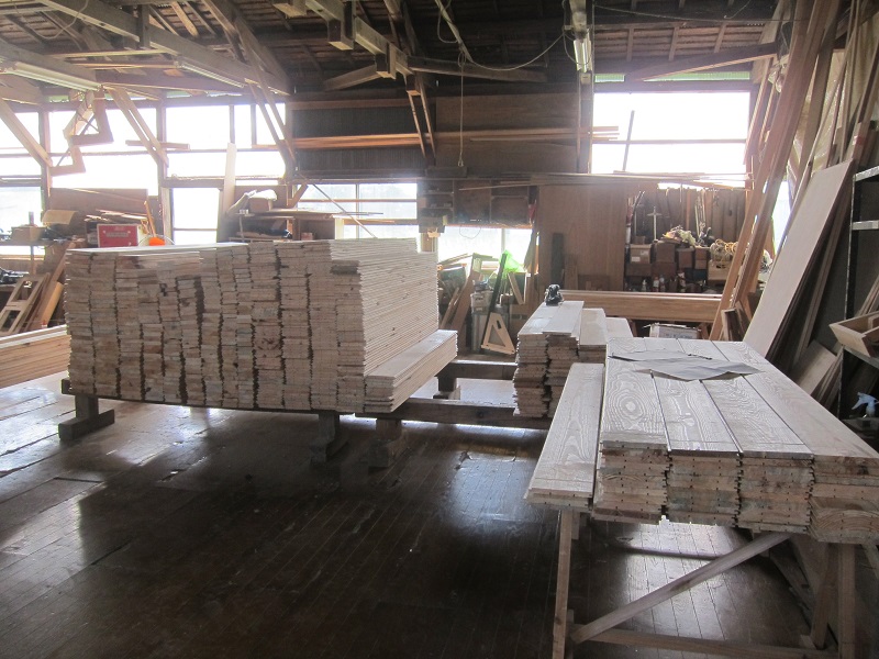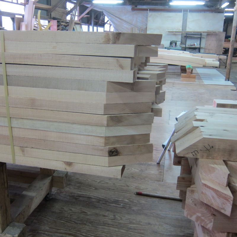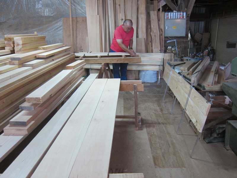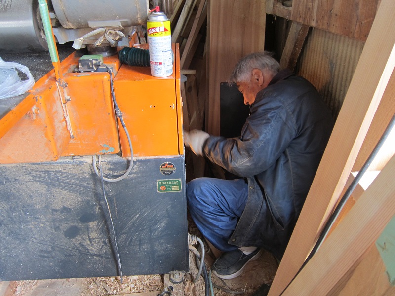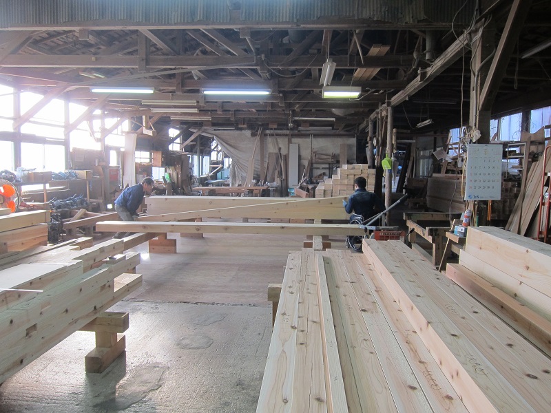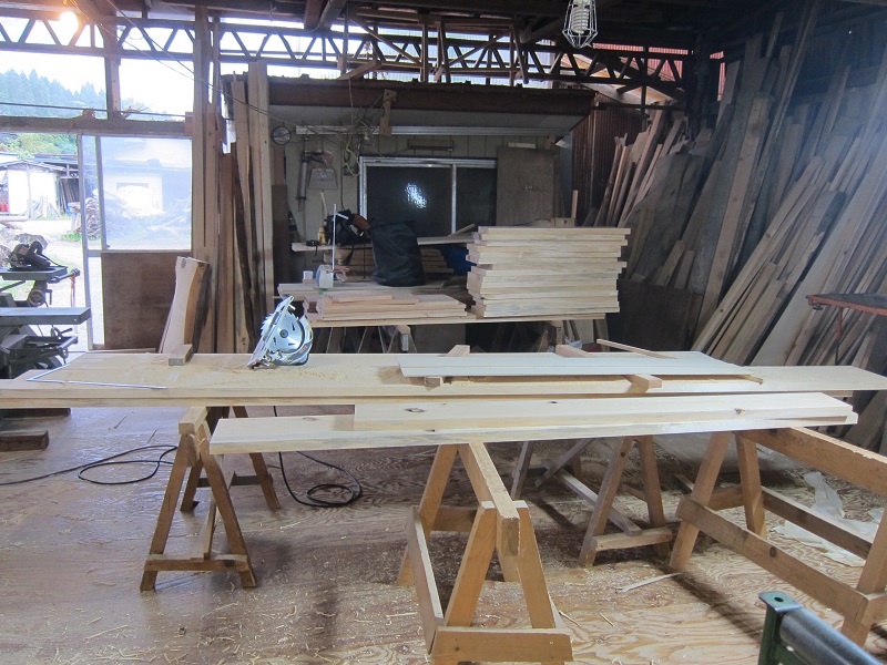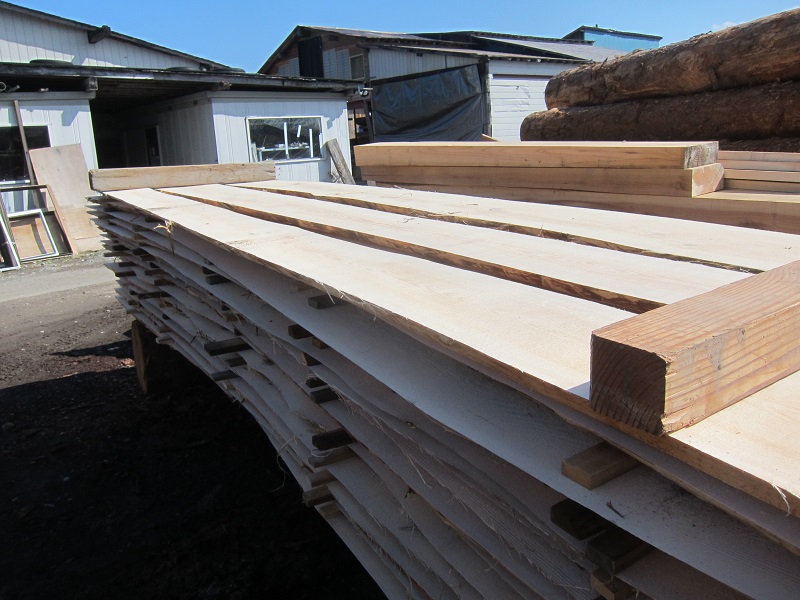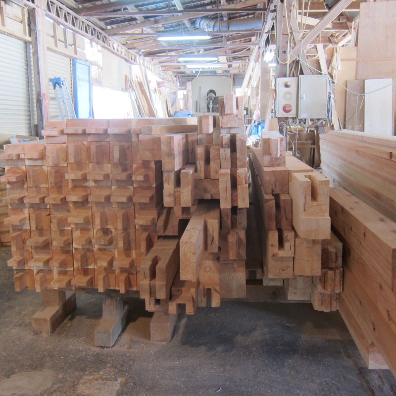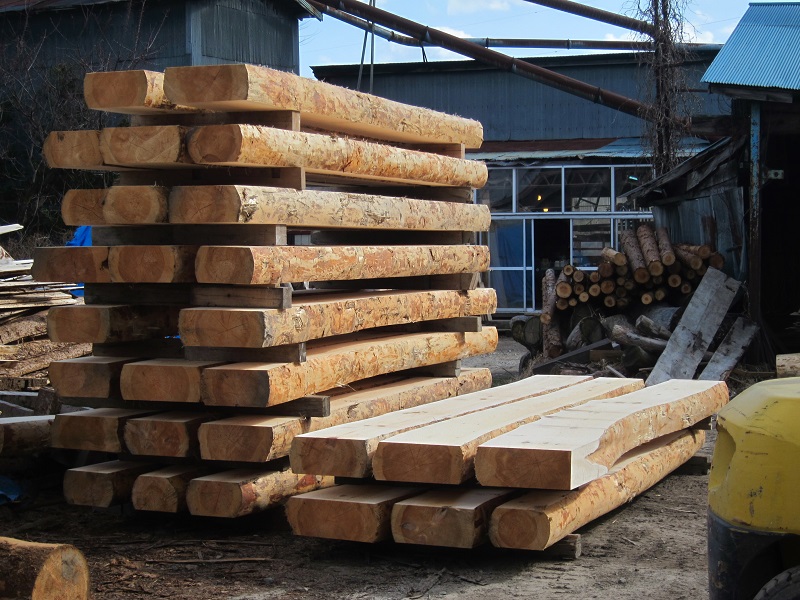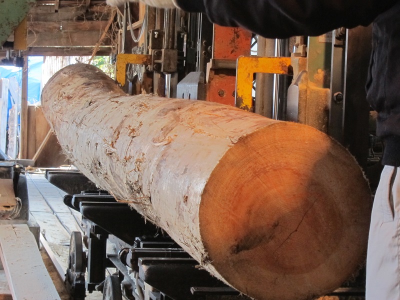 次の新築工事の構造材の修正挽に取り組んでおります。台車に乗ってサイズを見ながら調整する家具職人とそのサポートが一人、製材されて出来たセッカ板を片付ける担当が一人の計三人で行います。桟積天然乾燥しているので、乾きながら反ったり割れて膨らんだりするので、このように直角で真っすぐな材に修正できる製材機の扱いがとても有難く大切です。