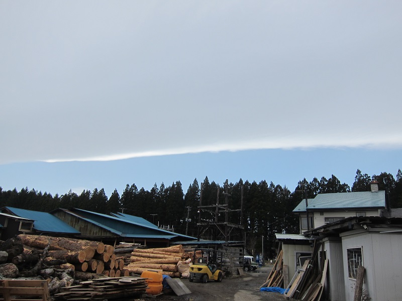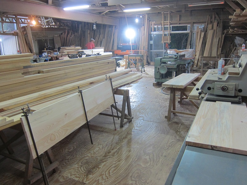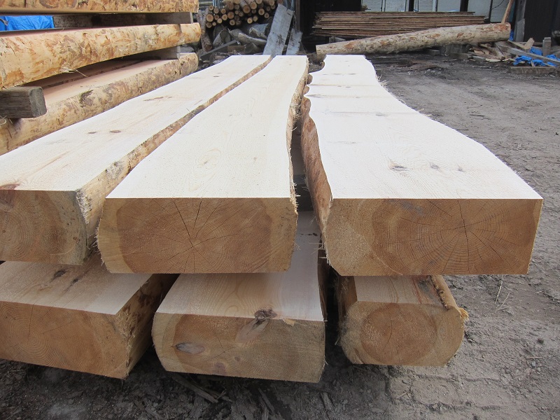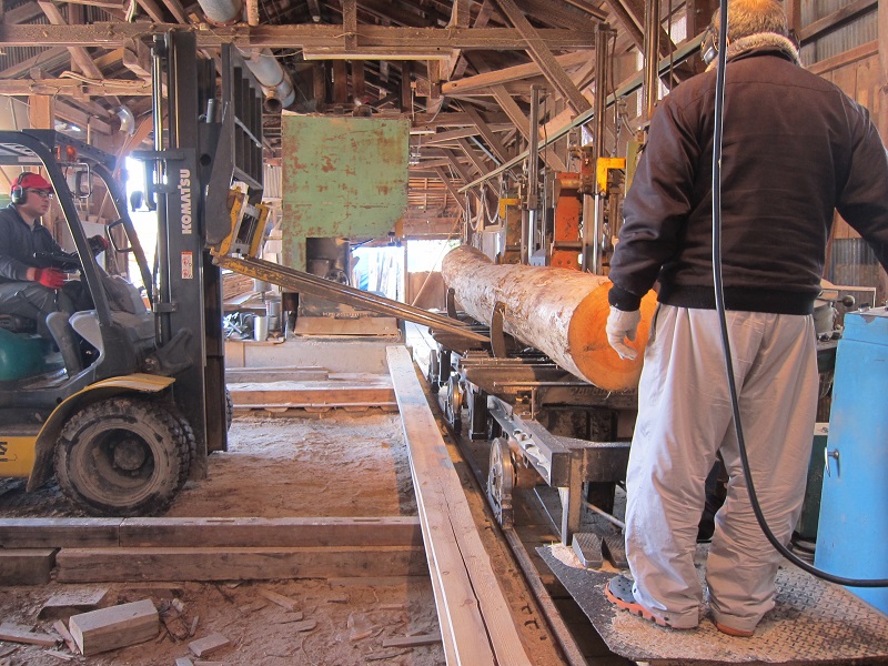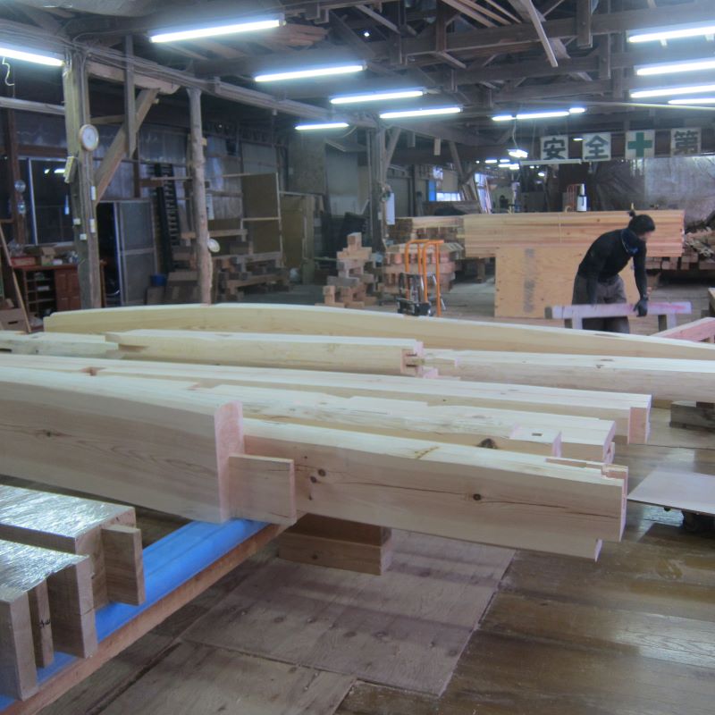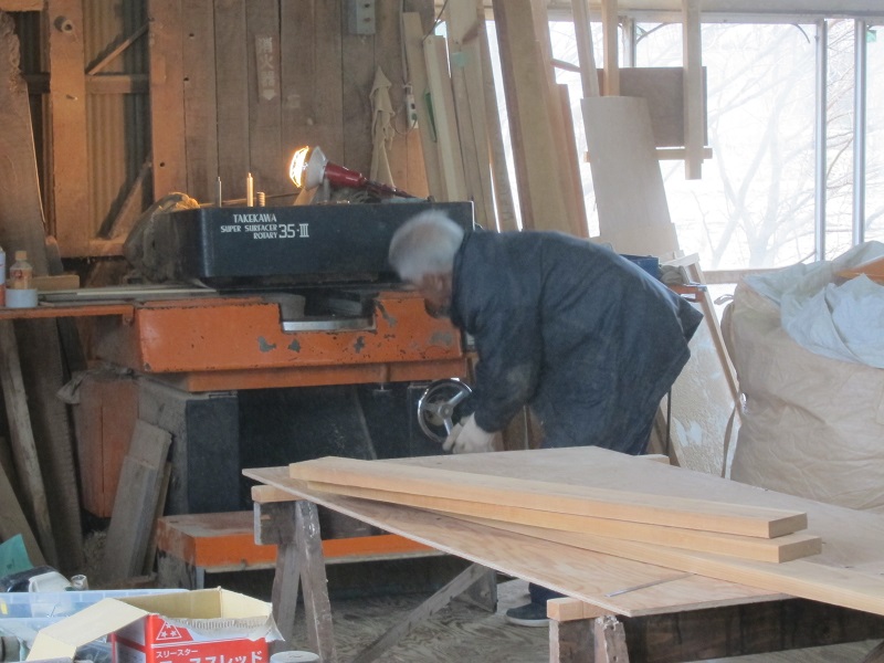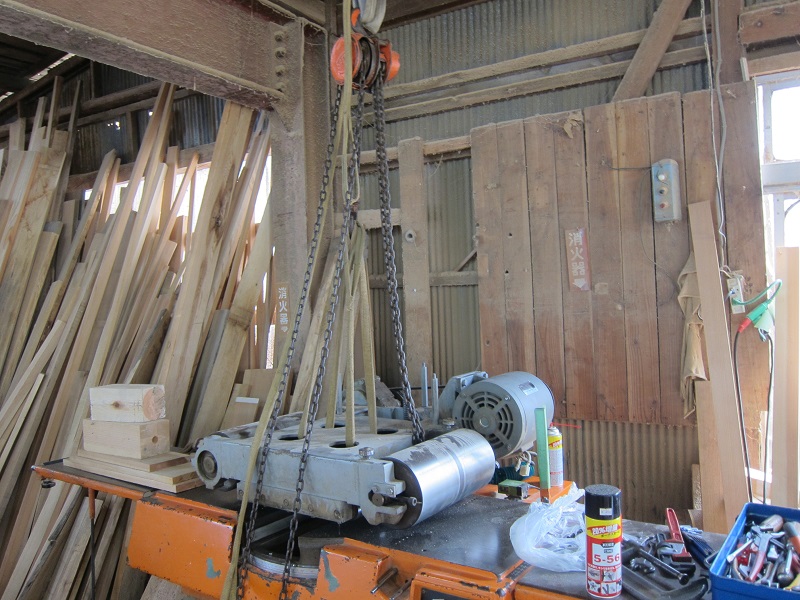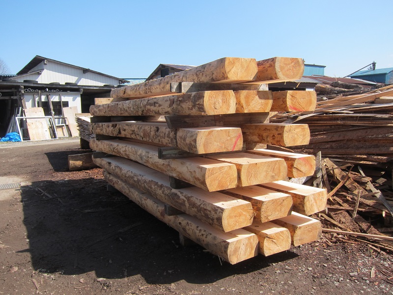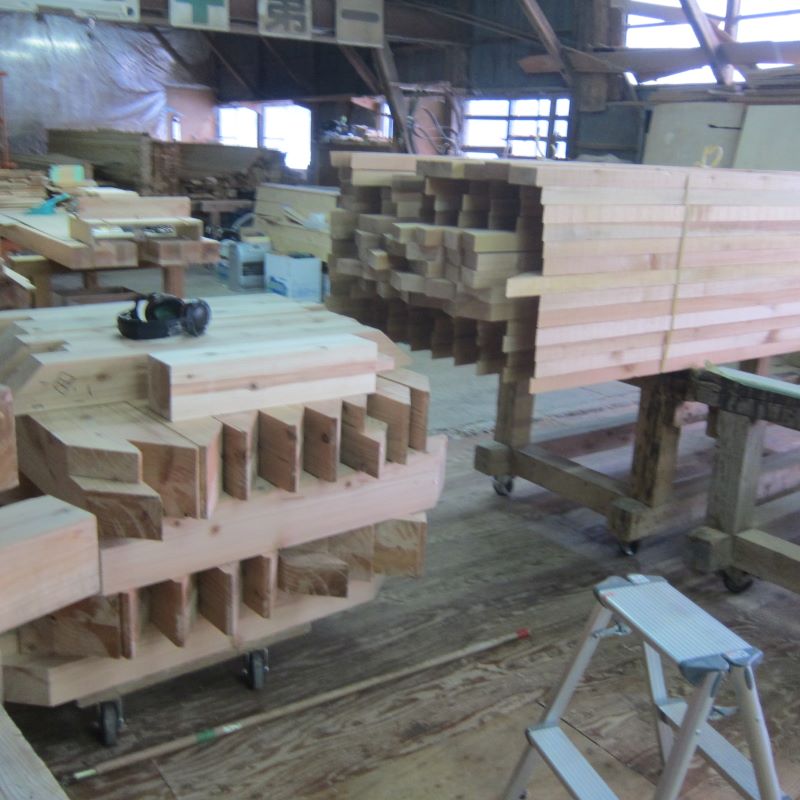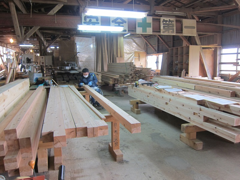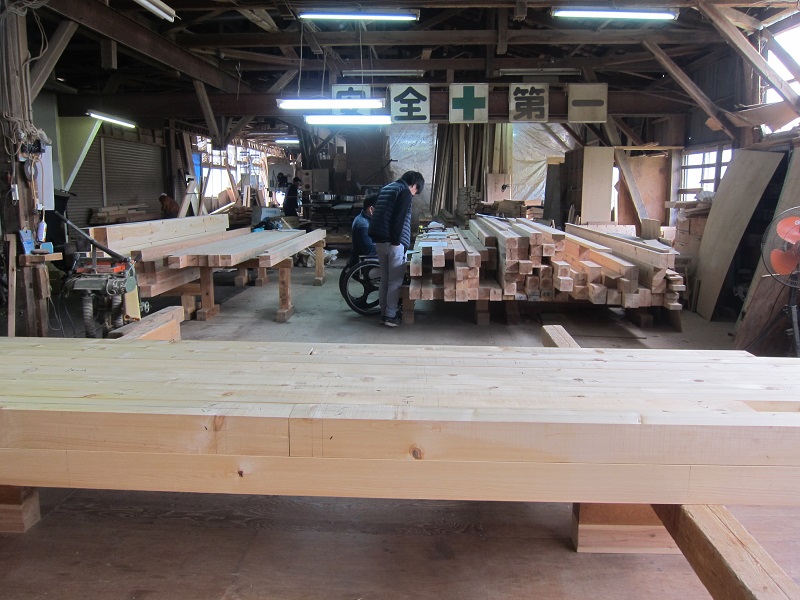 次の新築工事の構造材の修正挽に取り組んでおります。台車に乗ってサイズを見ながら調整する家具職人とそのサポートが一人、製材されて出来たセッカ板を片付ける担当が一人の計三人で行います。桟積天然乾燥しているので、乾きながら反ったり割れて膨らんだりするので、このように直角で真っすぐな材に修正できる製材機の扱いがとても有難く大切です。