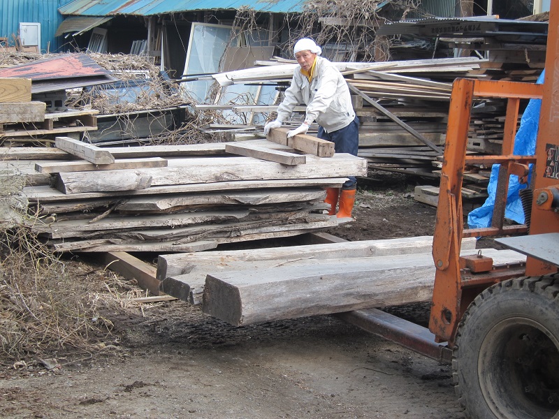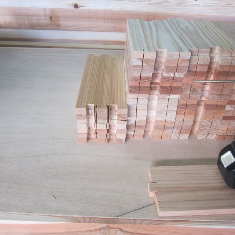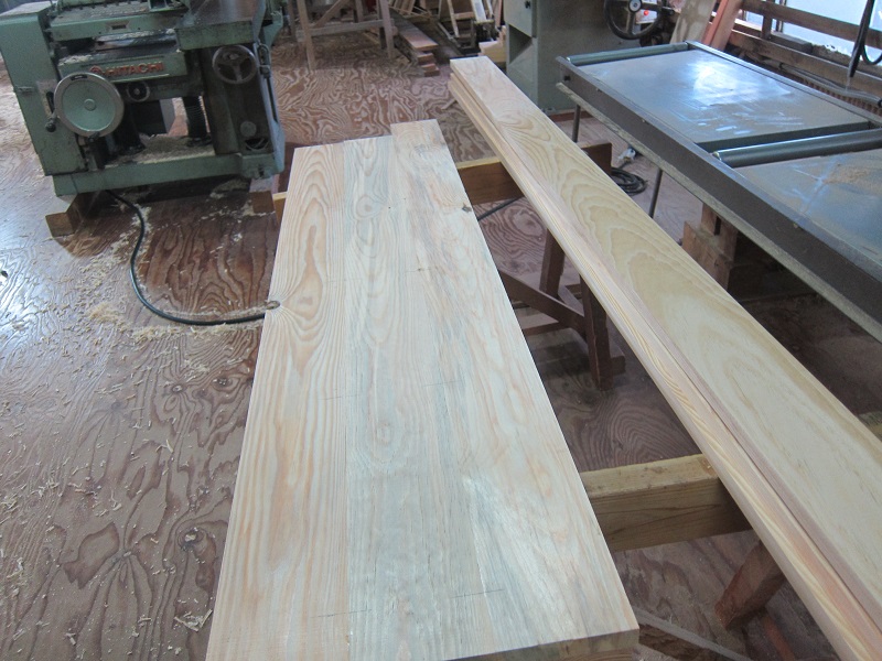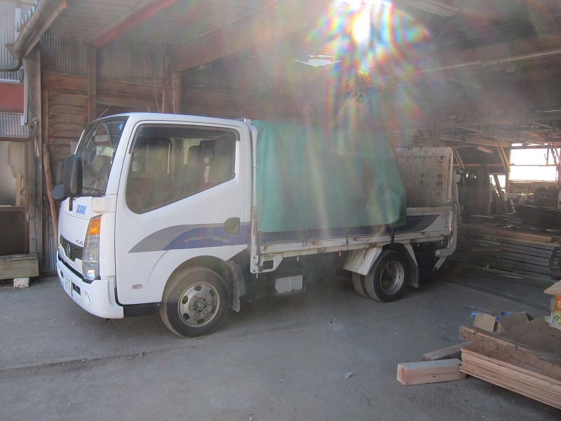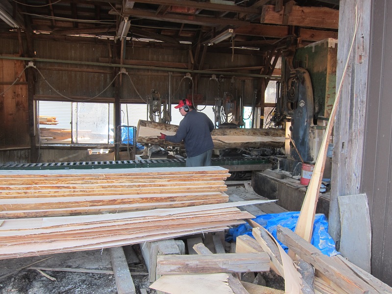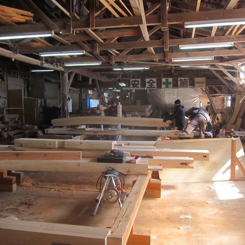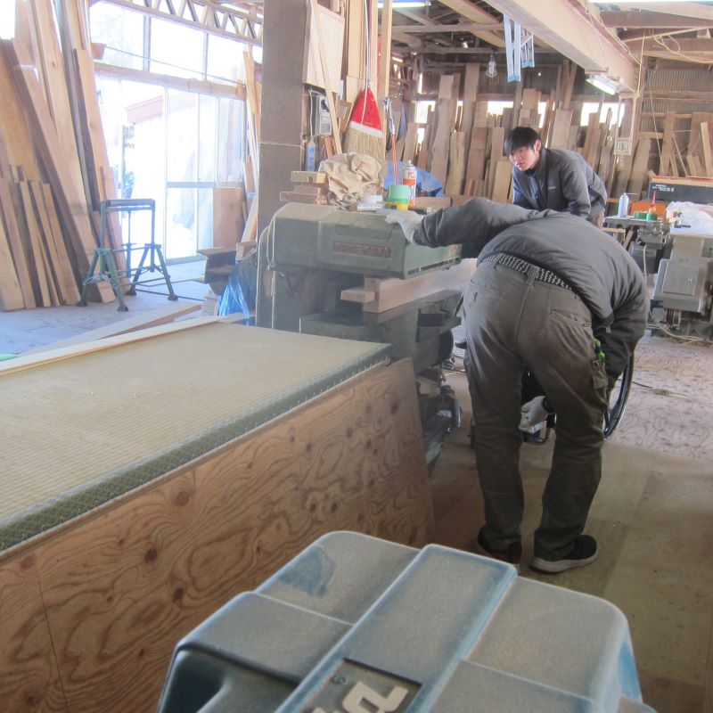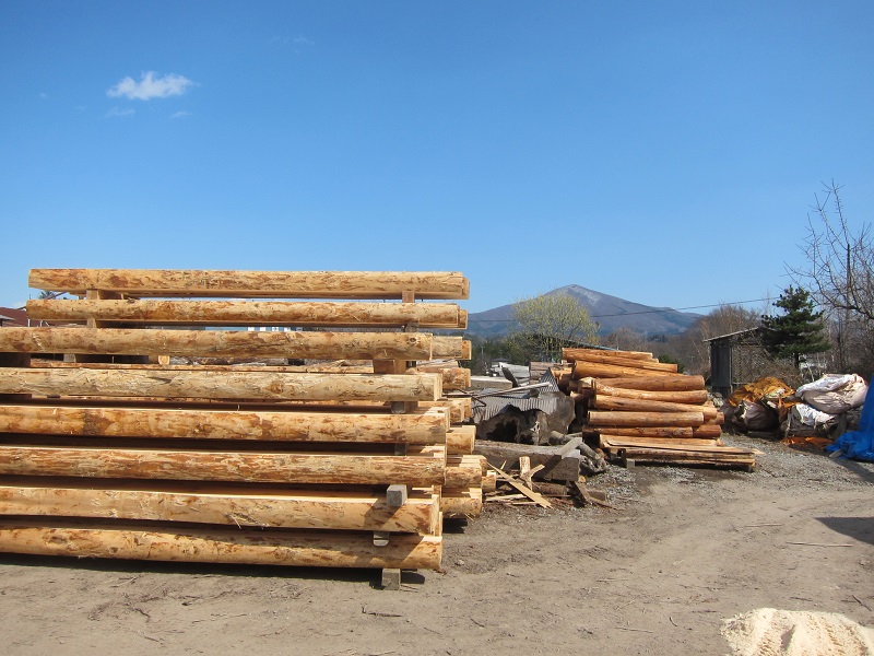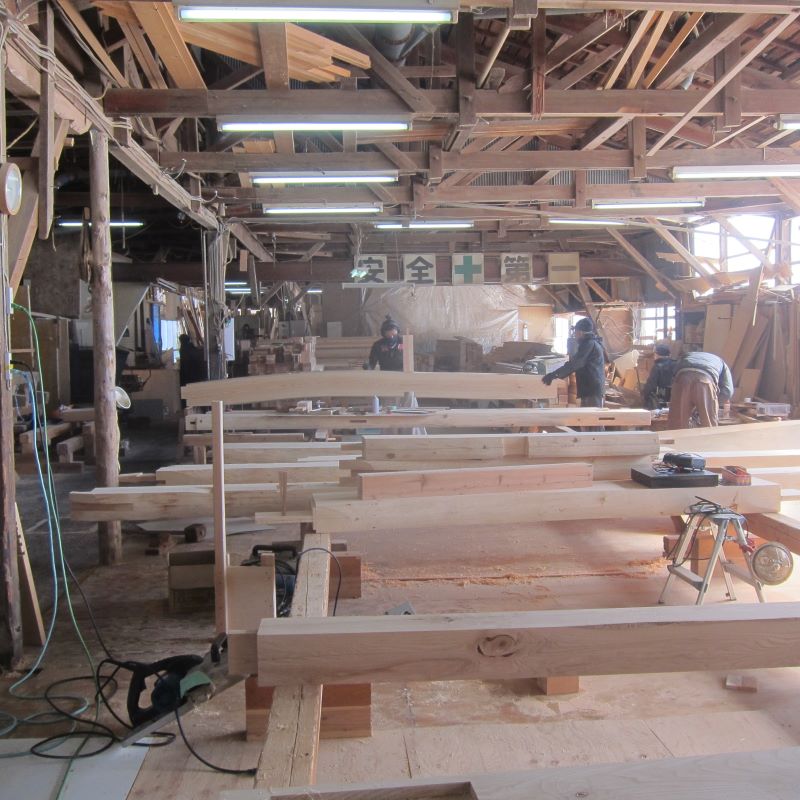 次の新築工事の構造材の修正挽に取り組んでおります。台車に乗ってサイズを見ながら調整する家具職人とそのサポートが一人、製材されて出来たセッカ板を片付ける担当が一人の計三人で行います。桟積天然乾燥しているので、乾きながら反ったり割れて膨らんだりするので、このように直角で真っすぐな材に修正できる製材機の扱いがとても有難く大切です。