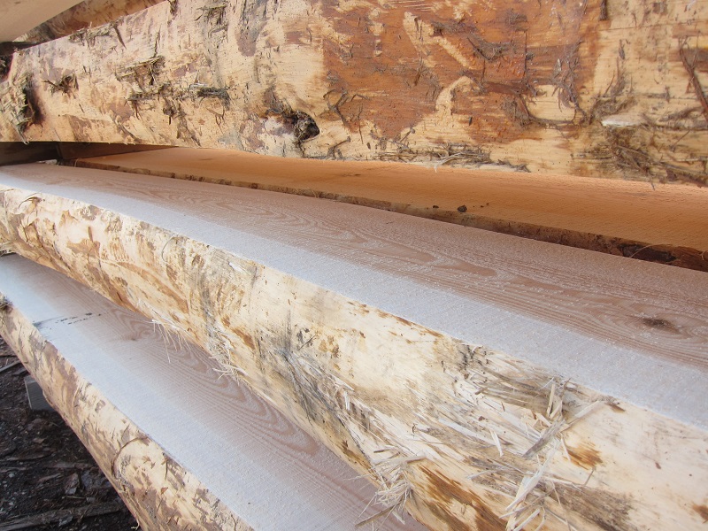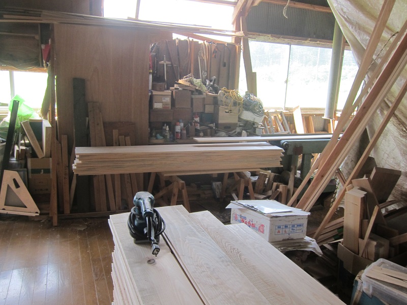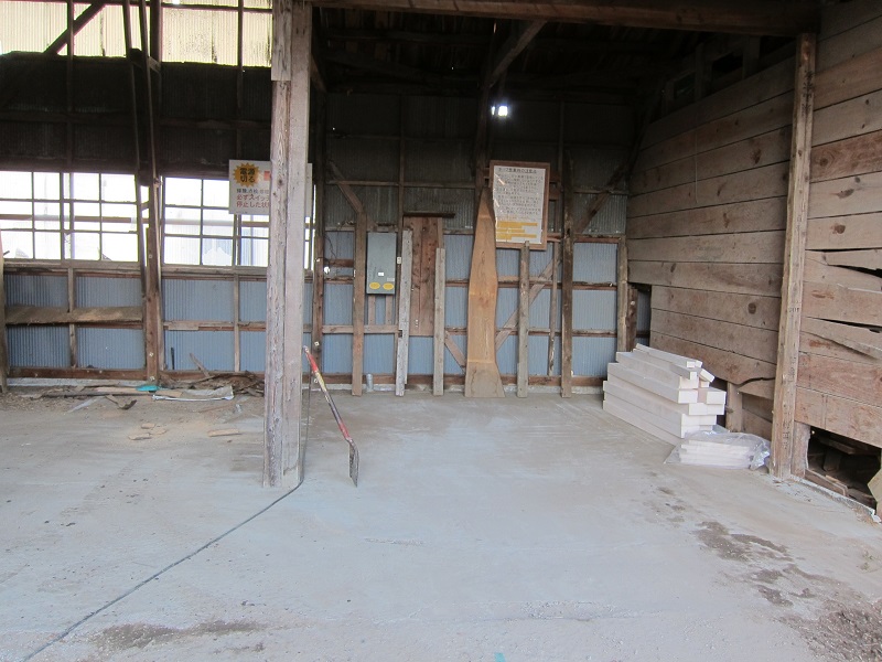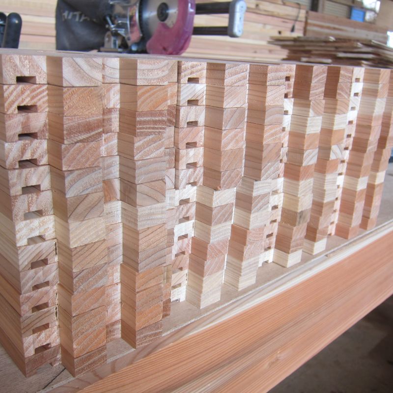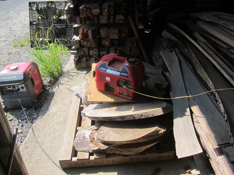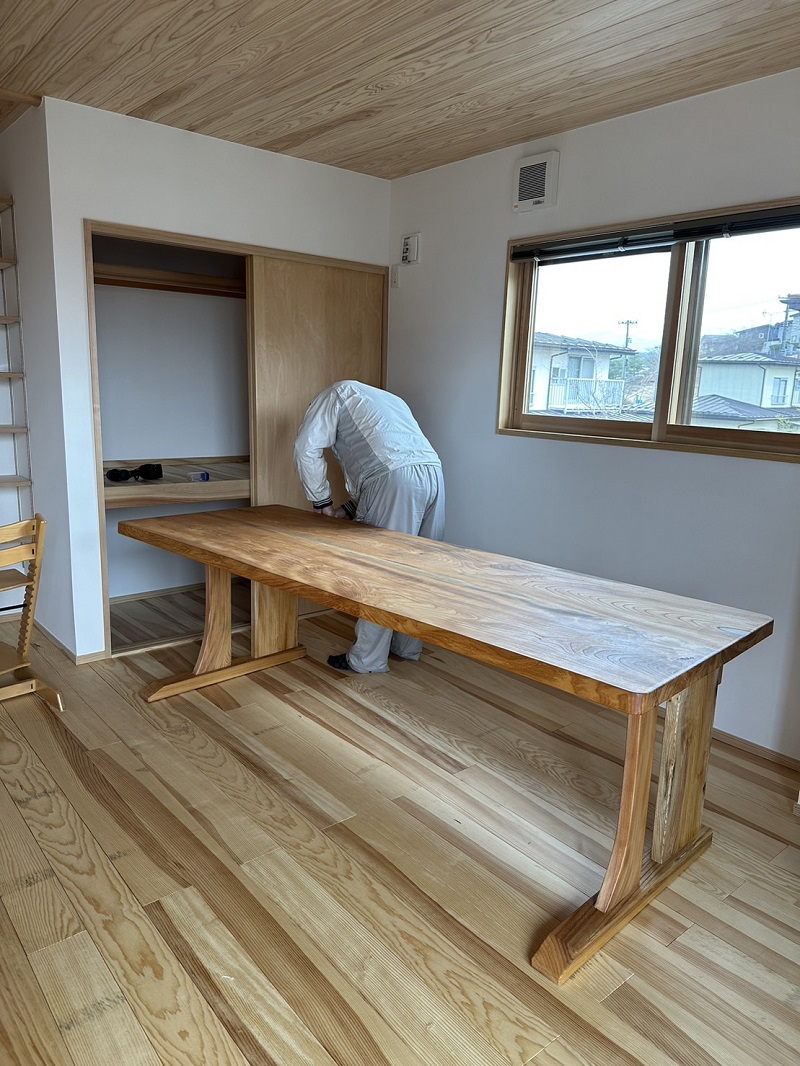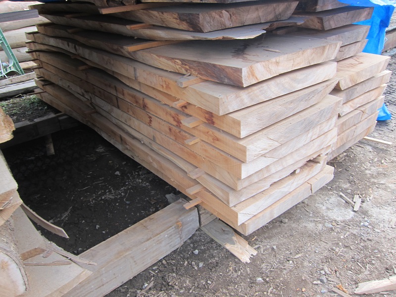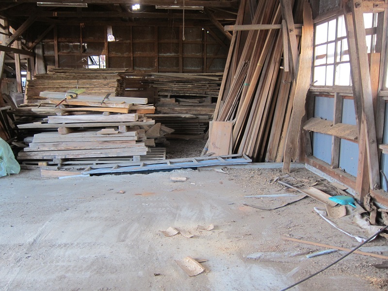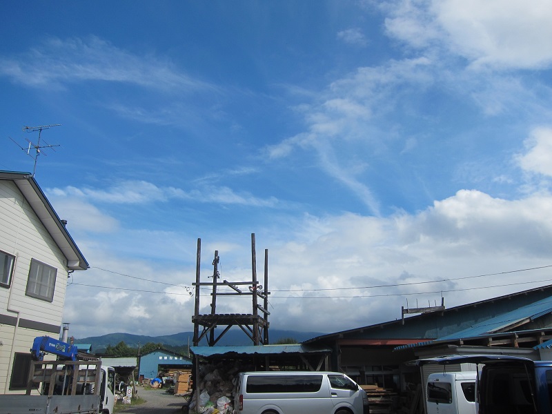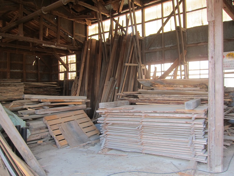 次の新築工事の構造材の修正挽に取り組んでおります。台車に乗ってサイズを見ながら調整する家具職人とそのサポートが一人、製材されて出来たセッカ板を片付ける担当が一人の計三人で行います。桟積天然乾燥しているので、乾きながら反ったり割れて膨らんだりするので、このように直角で真っすぐな材に修正できる製材機の扱いがとても有難く大切です。