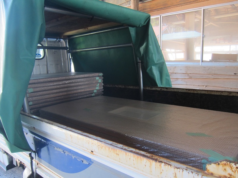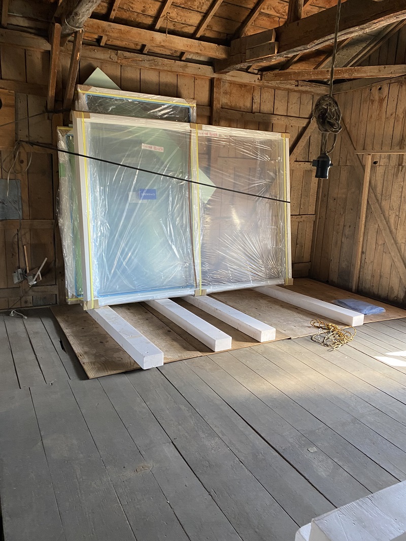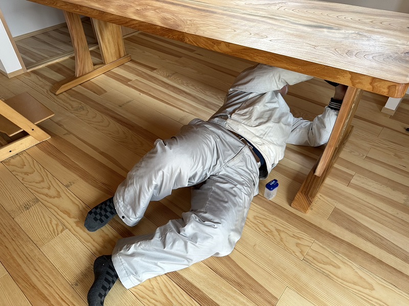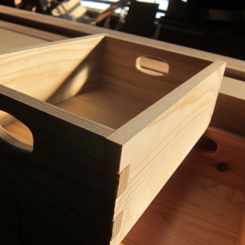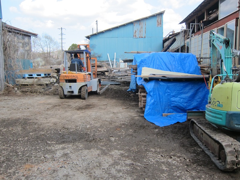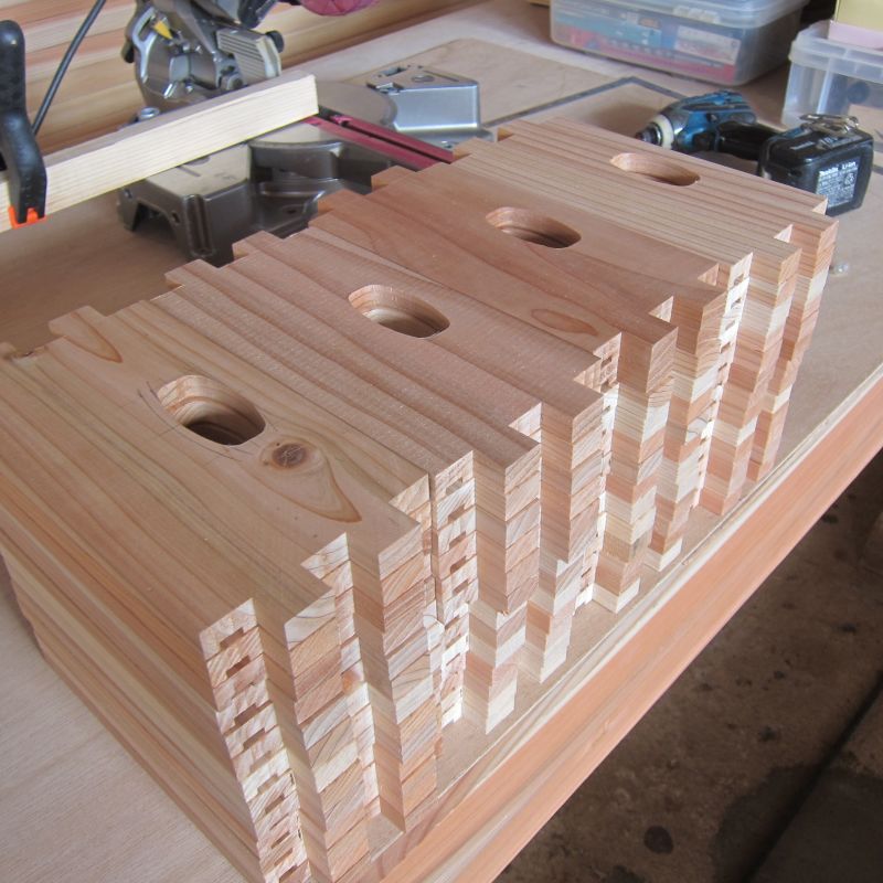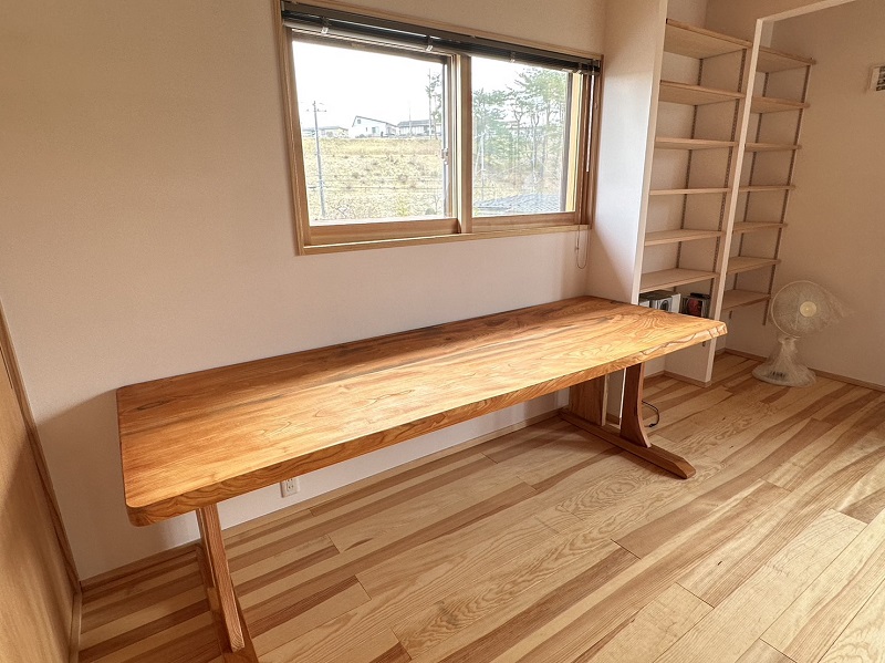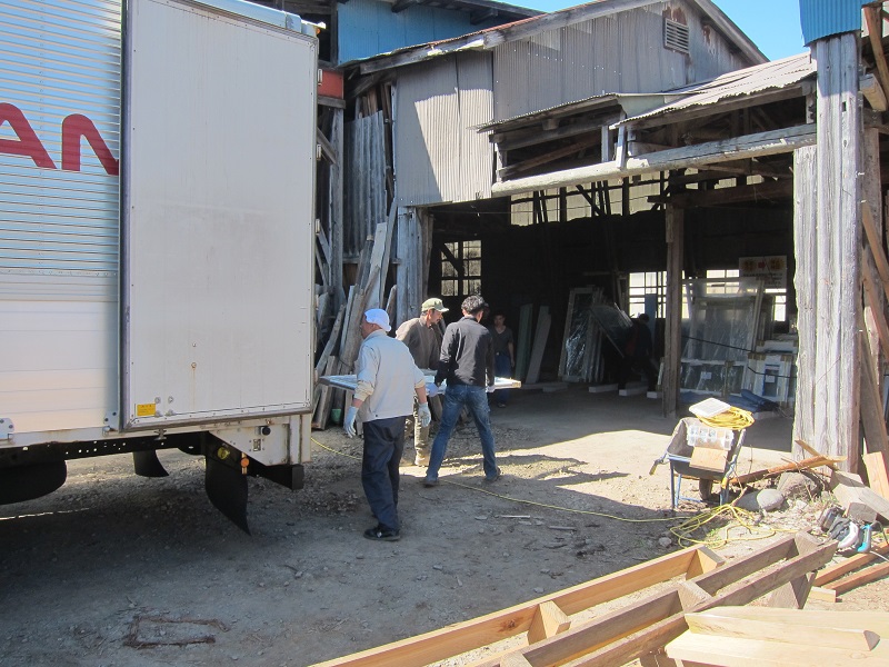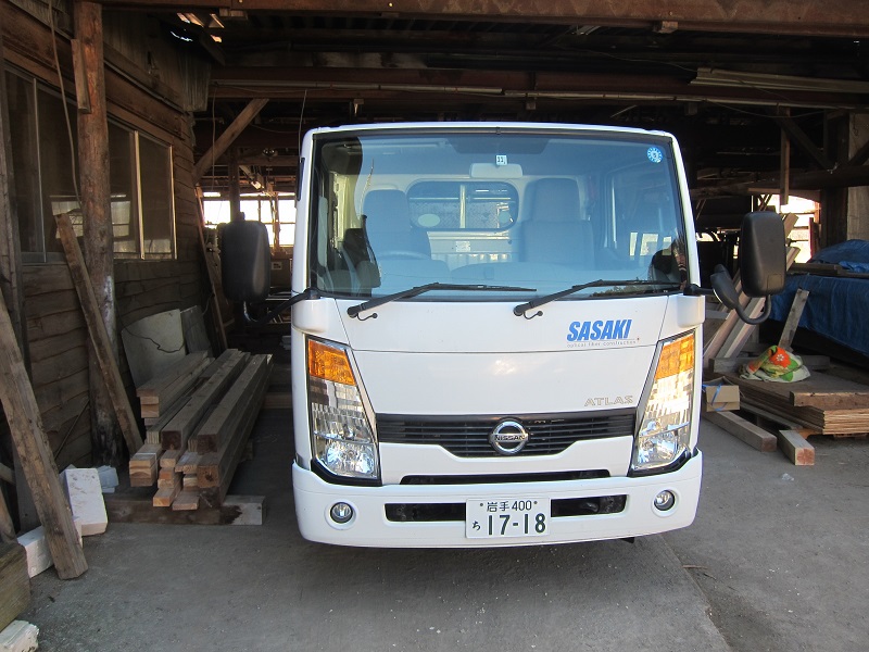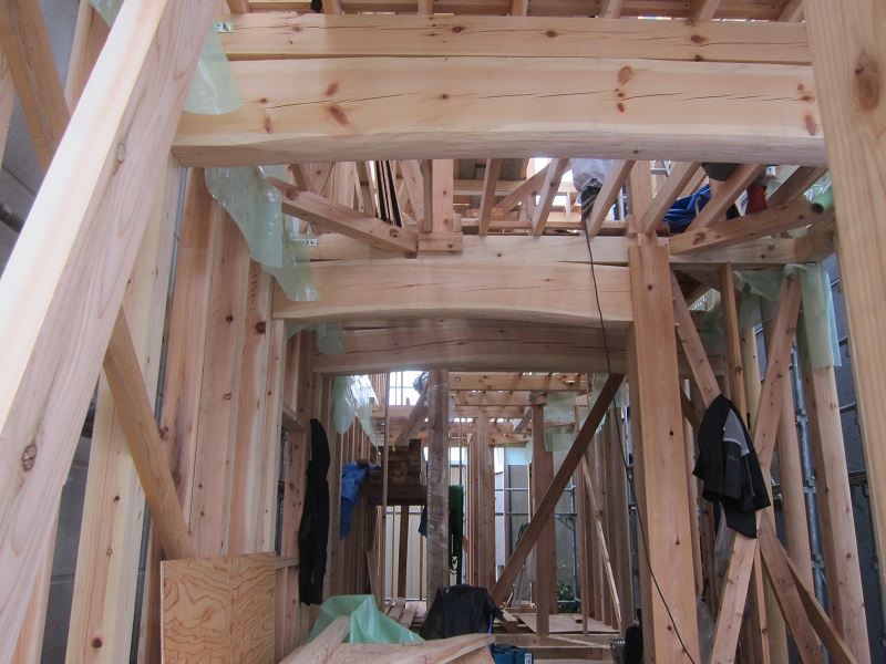 次の新築工事の構造材の修正挽に取り組んでおります。台車に乗ってサイズを見ながら調整する家具職人とそのサポートが一人、製材されて出来たセッカ板を片付ける担当が一人の計三人で行います。桟積天然乾燥しているので、乾きながら反ったり割れて膨らんだりするので、このように直角で真っすぐな材に修正できる製材機の扱いがとても有難く大切です。