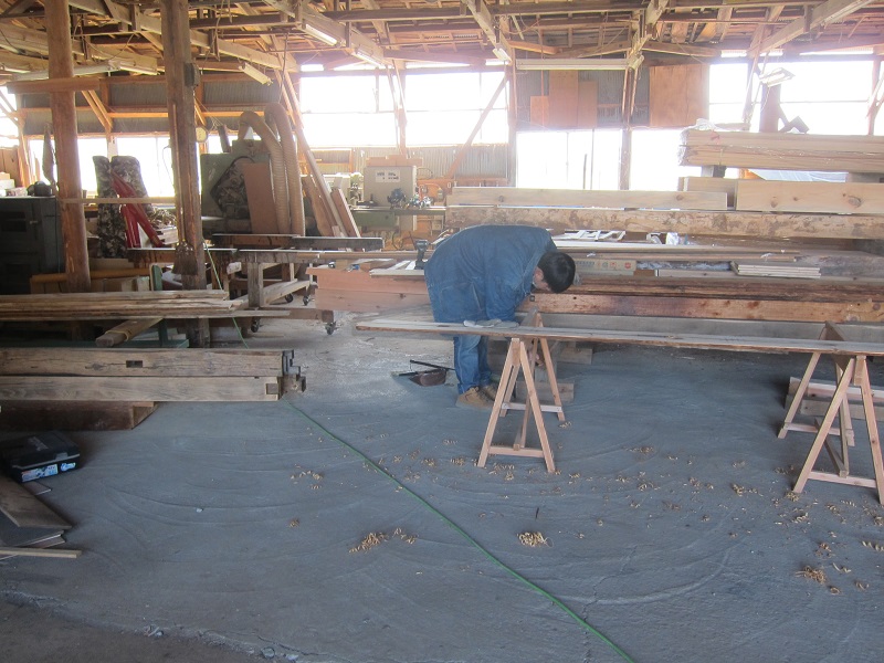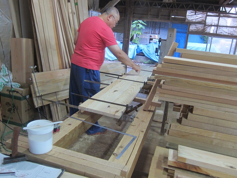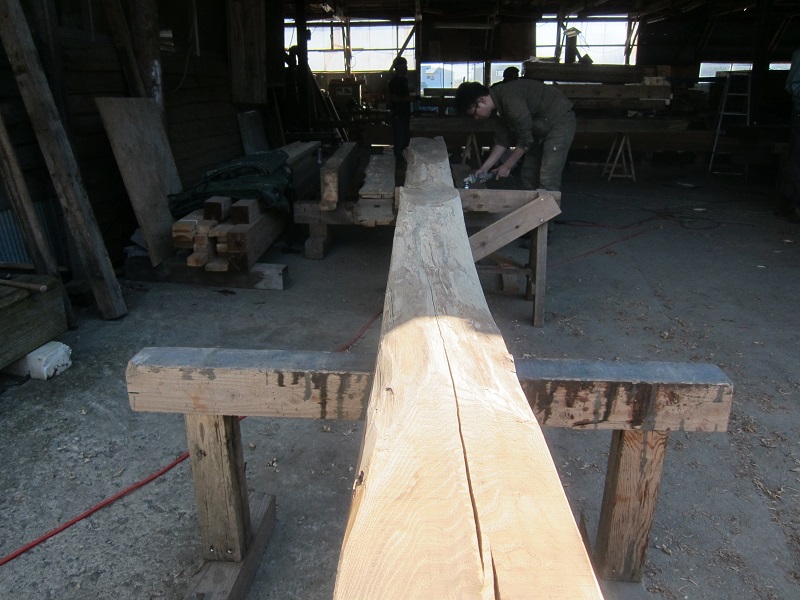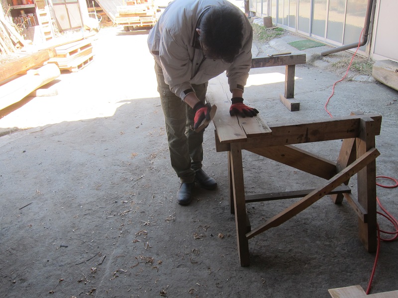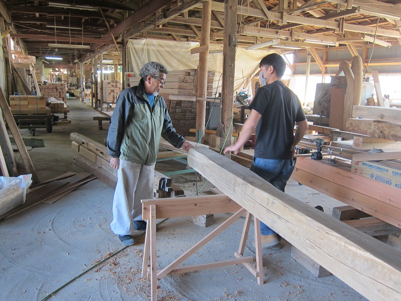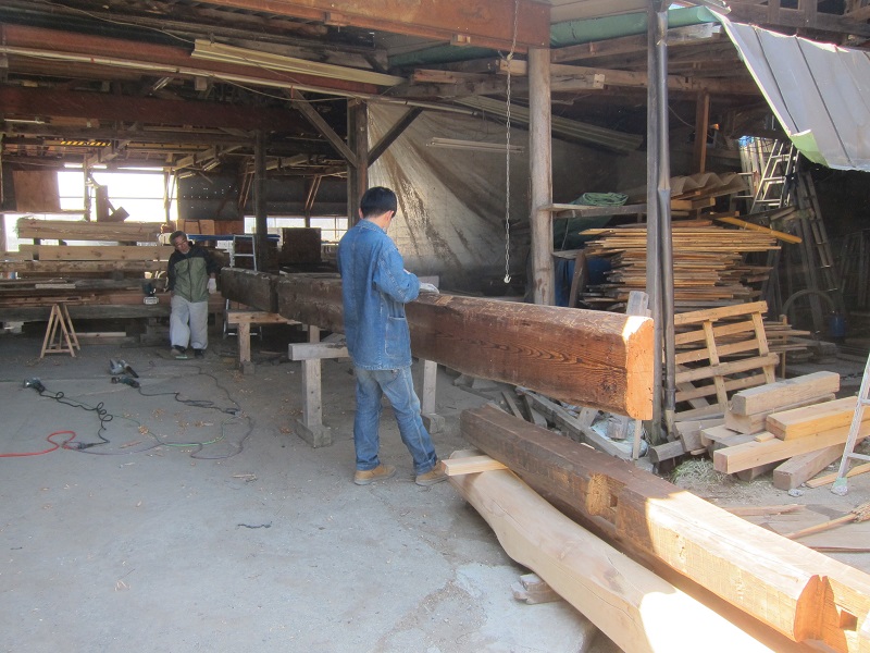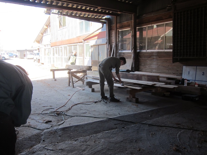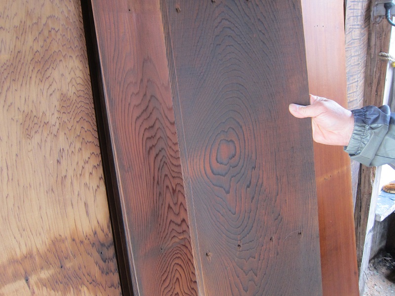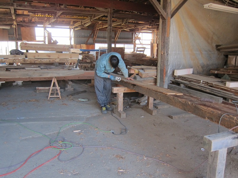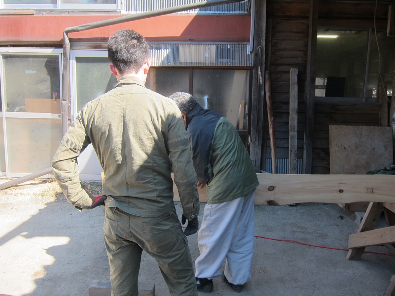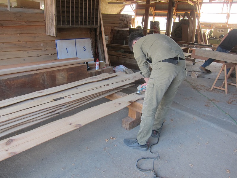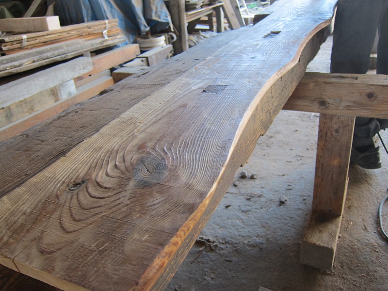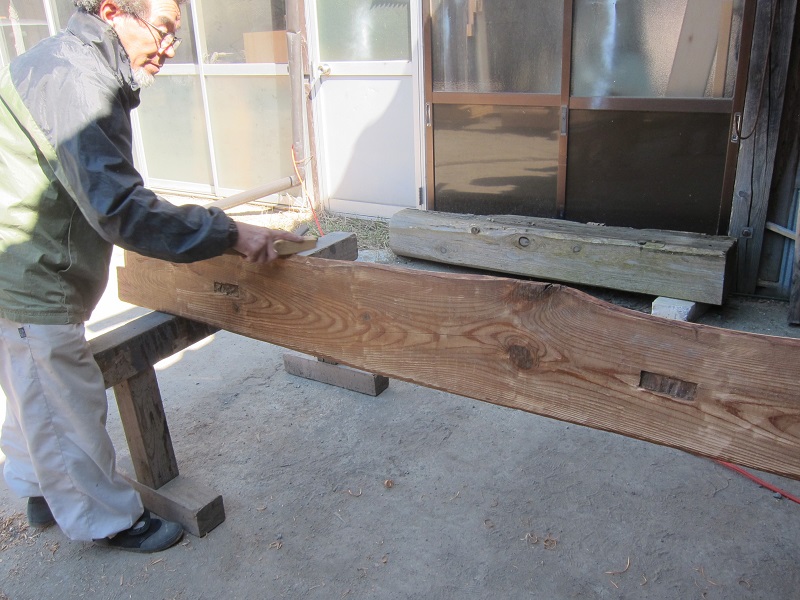 毎日修正挽を続けています。写真は修正挽前は古びた感じになっていたのに鋸を通すと綺麗な元木の木肌が見えてきたところです。残屑を吹き払いながらの作業が続いています。
