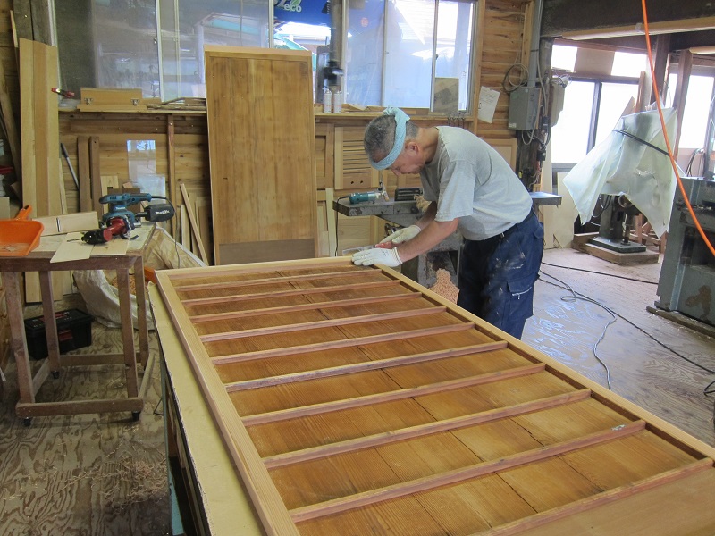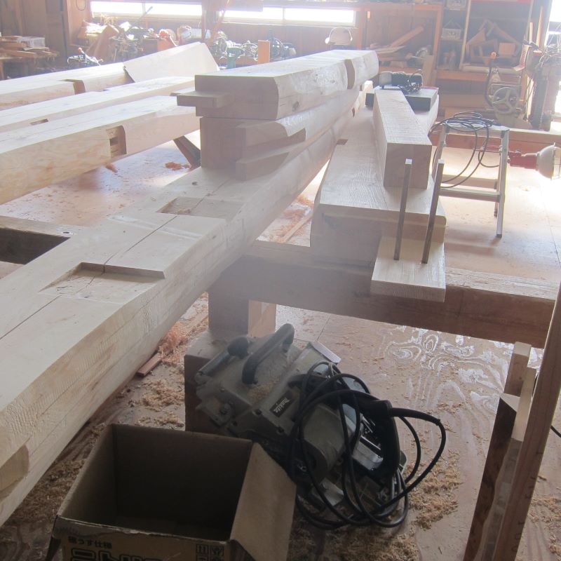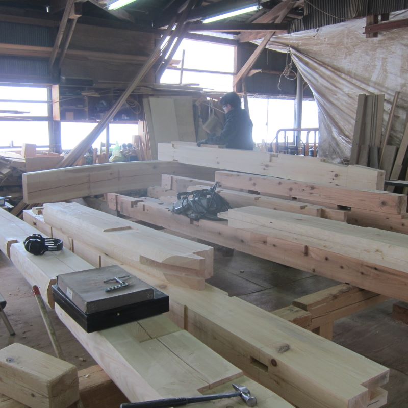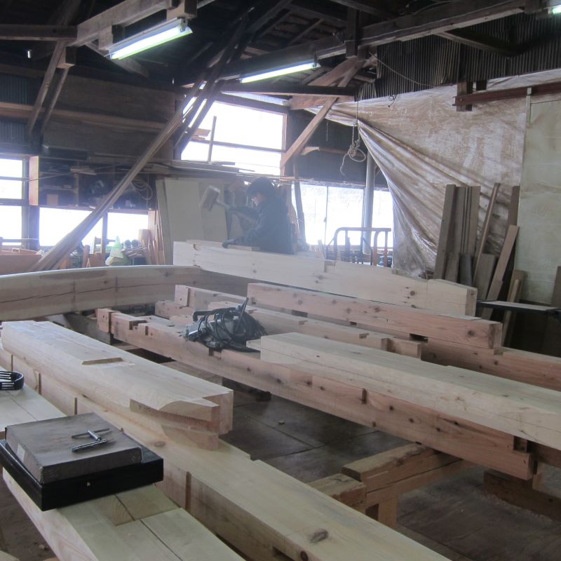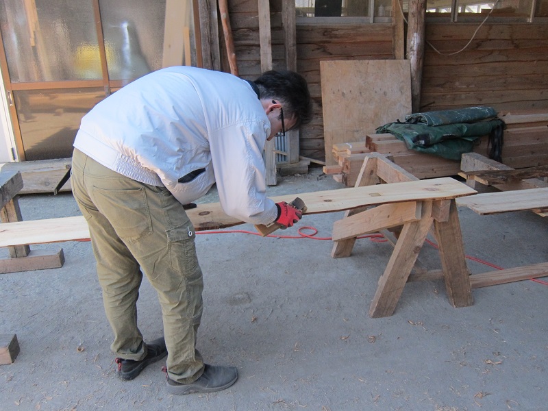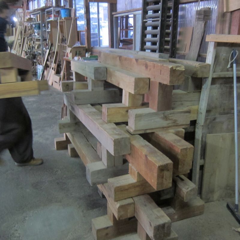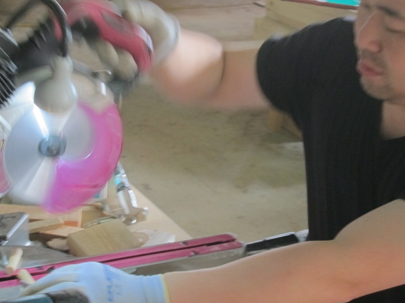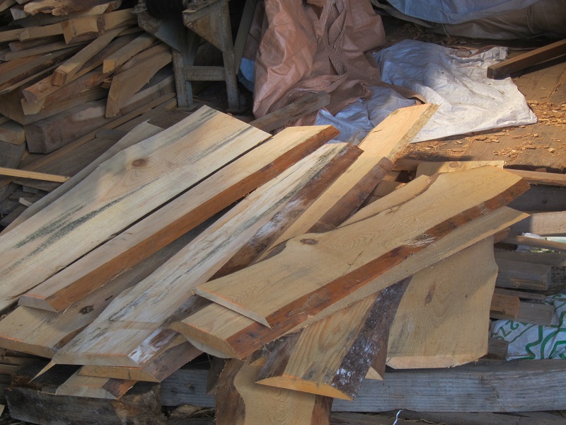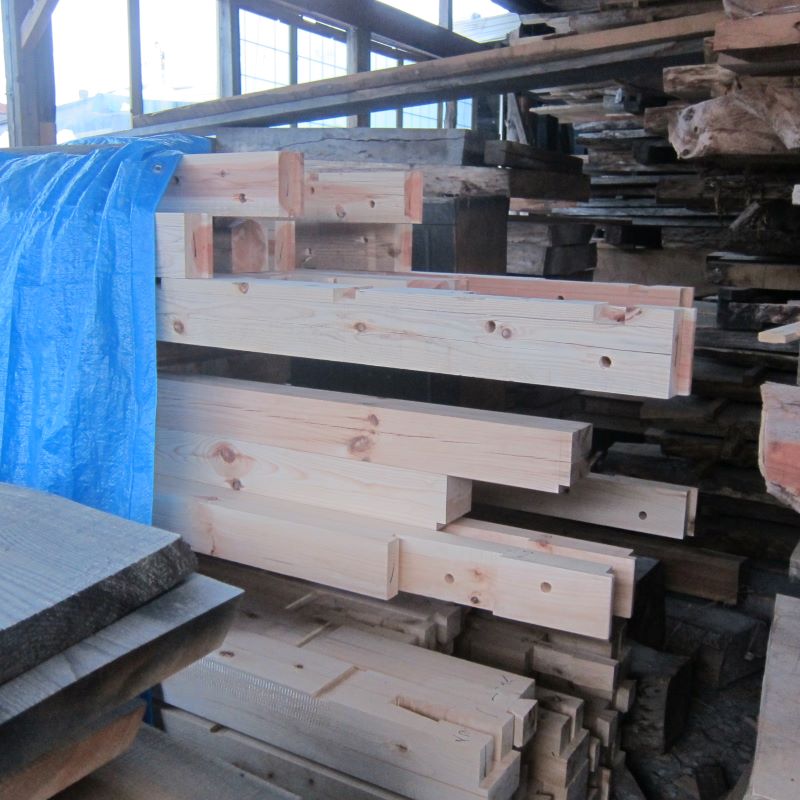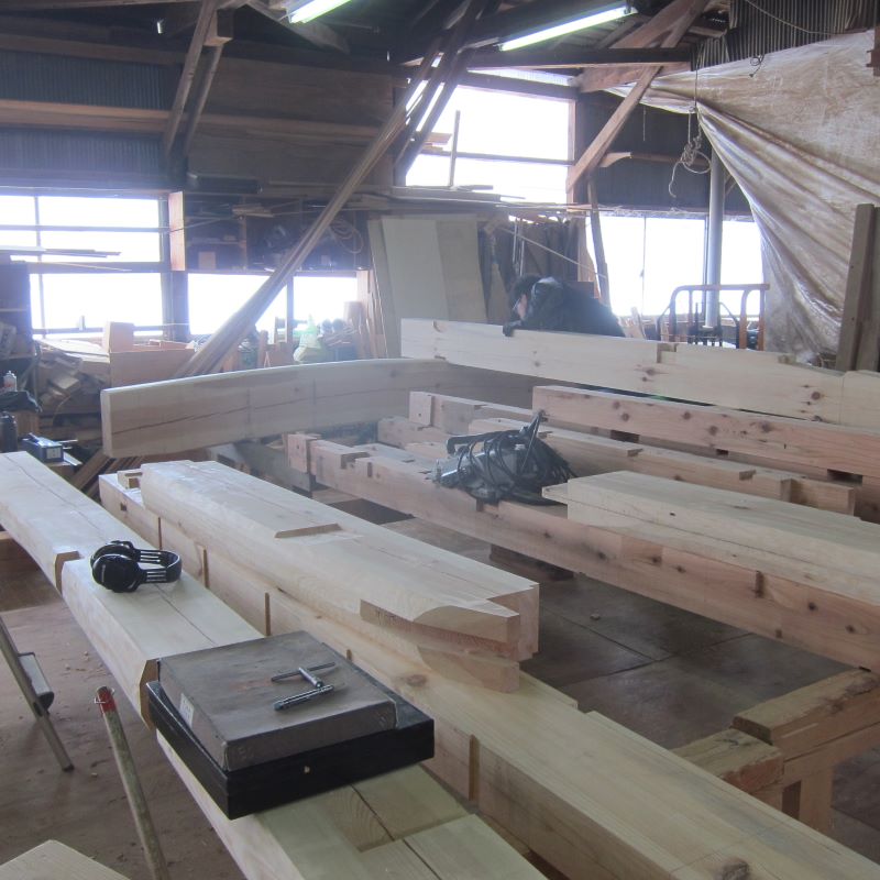 毎日修正挽を続けています。写真は修正挽前は古びた感じになっていたのに鋸を通すと綺麗な元木の木肌が見えてきたところです。残屑を吹き払いながらの作業が続いています。
