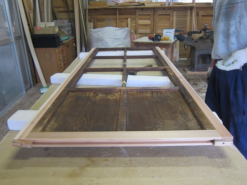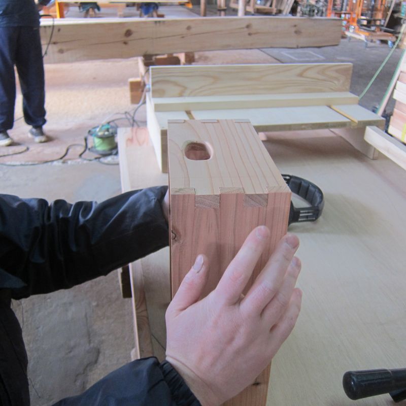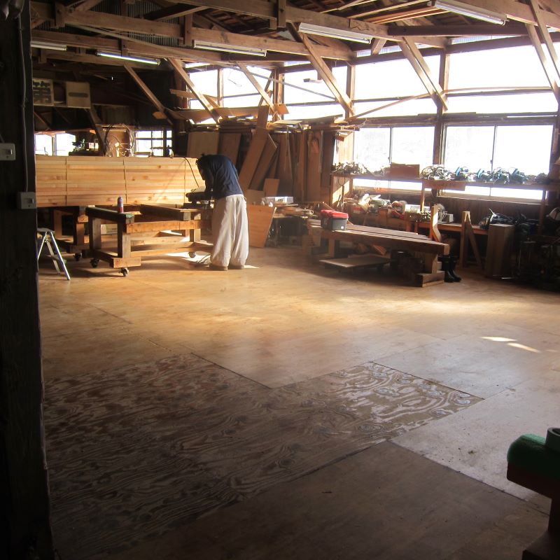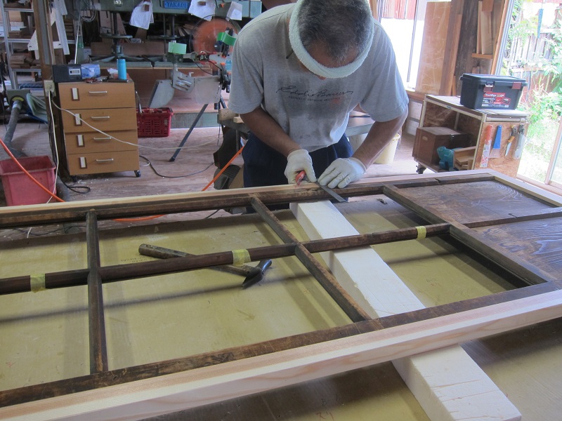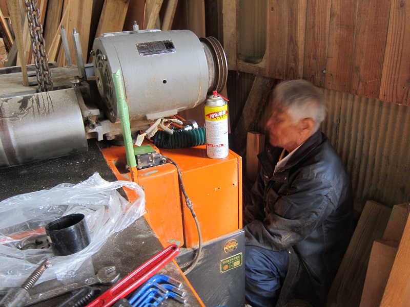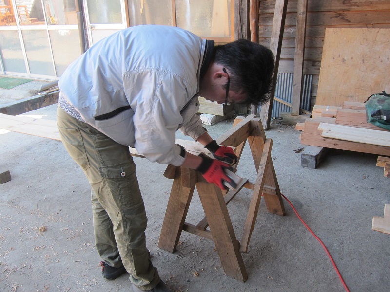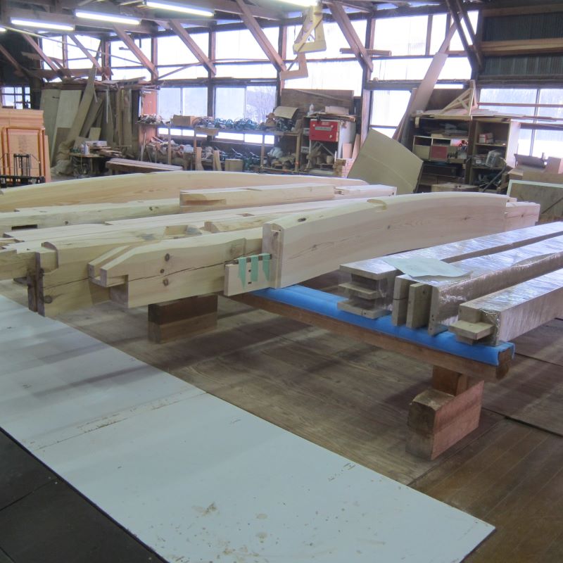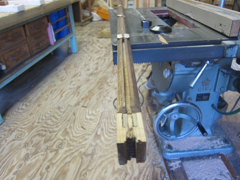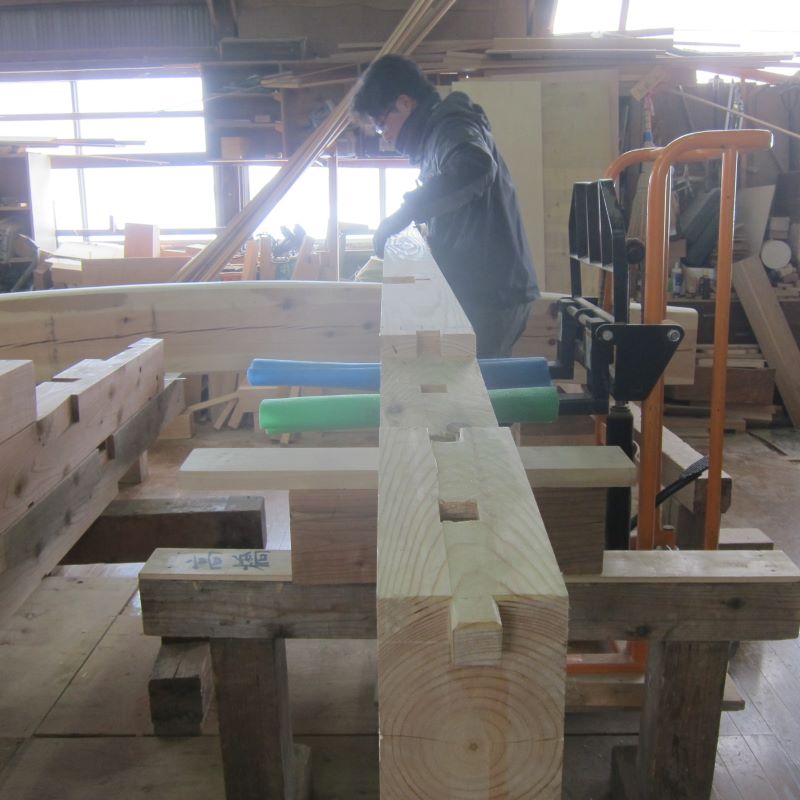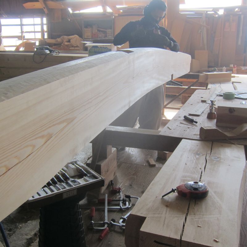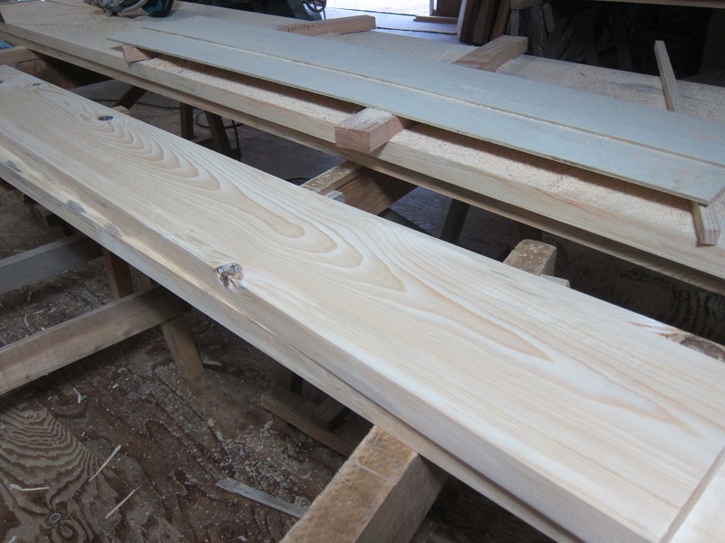 毎日修正挽を続けています。写真は修正挽前は古びた感じになっていたのに鋸を通すと綺麗な元木の木肌が見えてきたところです。残屑を吹き払いながらの作業が続いています。