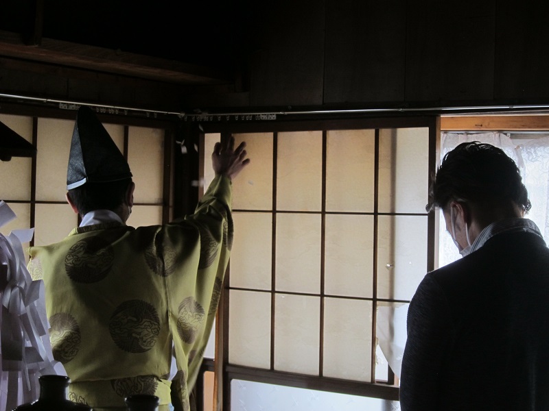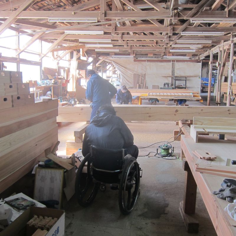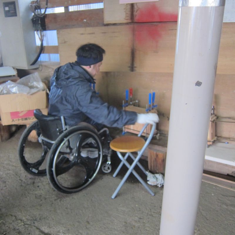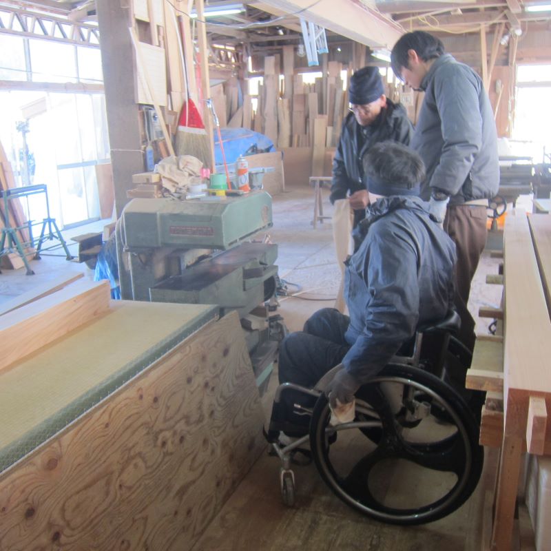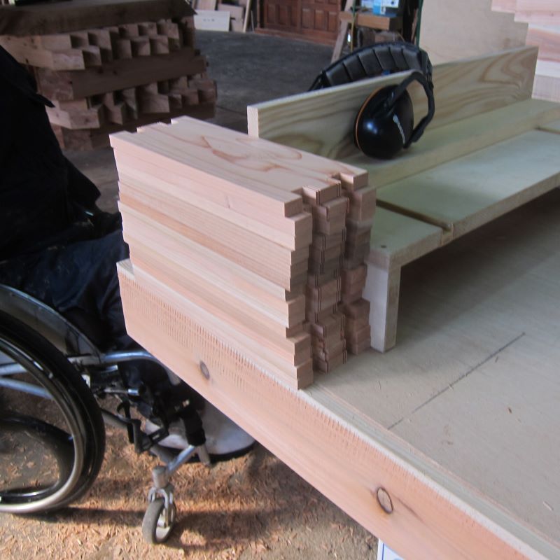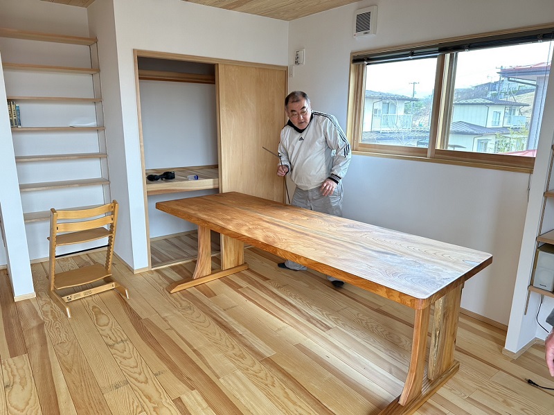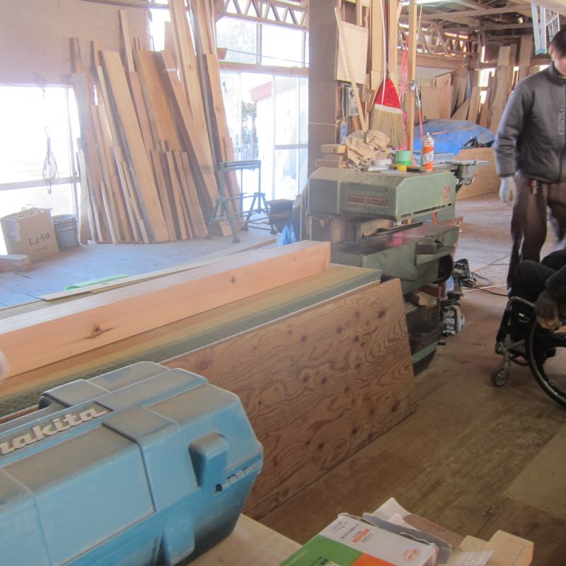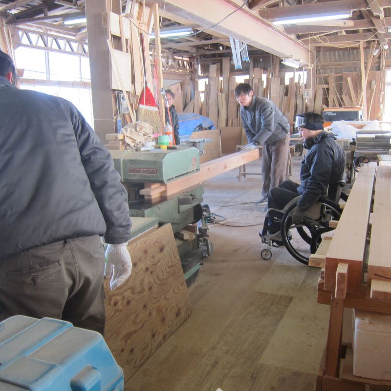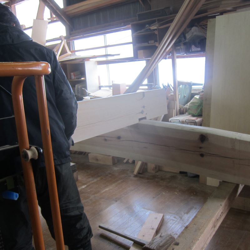 先日、次回鉈屋町での新築現場の構造材の木材の清め式が執り行われました。前日その準備に取り組む車椅子大工は、既に墨付けに取り組んでいて、四面自動鉋を掛けた土台の積み直しを車椅子に乗りながらこなしています。木材の清めとは、建て主様と墨付け手刻みを行う大工が共に、塩とお神酒で住まいに使用する構造木材の清めを行う儀式です。この時に、柱は雫石の杉で梁は米内川の上流で盛岡の街を水害から守ってくれた赤松で通し柱は岩泉町、他重茂半島の杉材などと木がどこから来て建物のどこにどの様に使われるかを説明させていただきます。特に桂の梁や、欅に漆、そして栗に桜など雑木も特に見える場所に配されるので、念入りにご説明させていただきます。そして、清めが終わり気持ち的に綺麗に白紙化したところで、初の刃物を入れるのをお施主様にチョウナで実際に殴り込みハツリを行っていただきます。