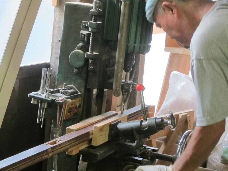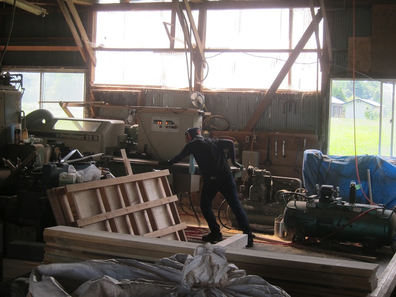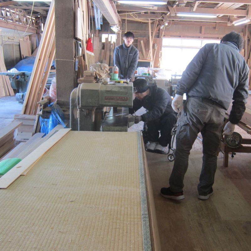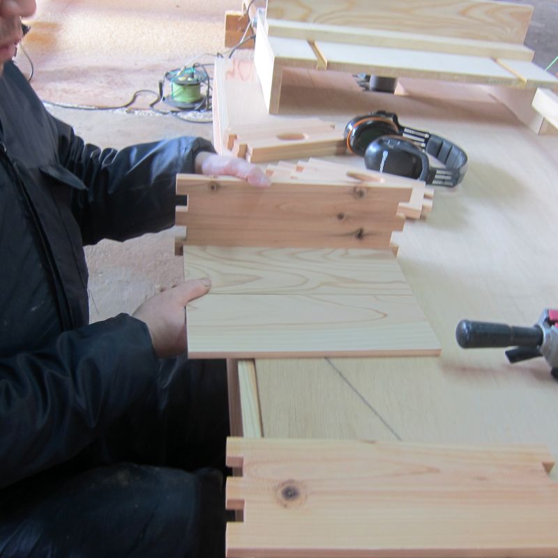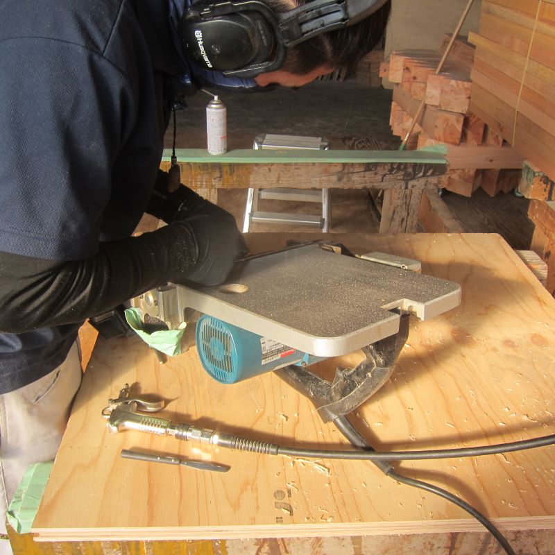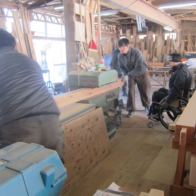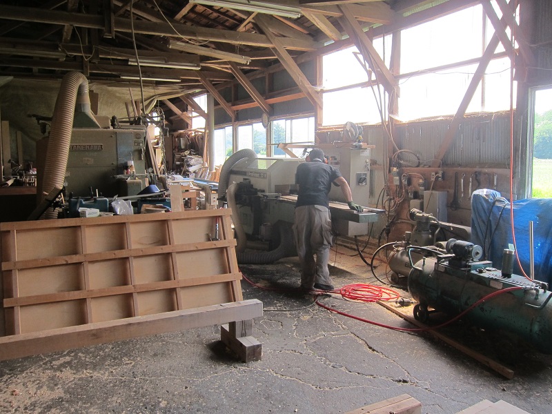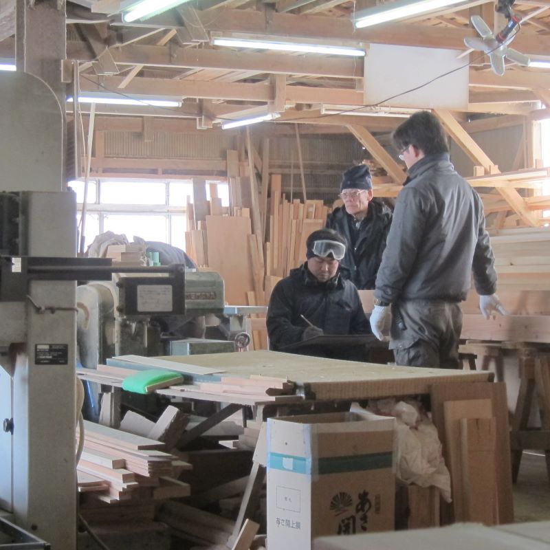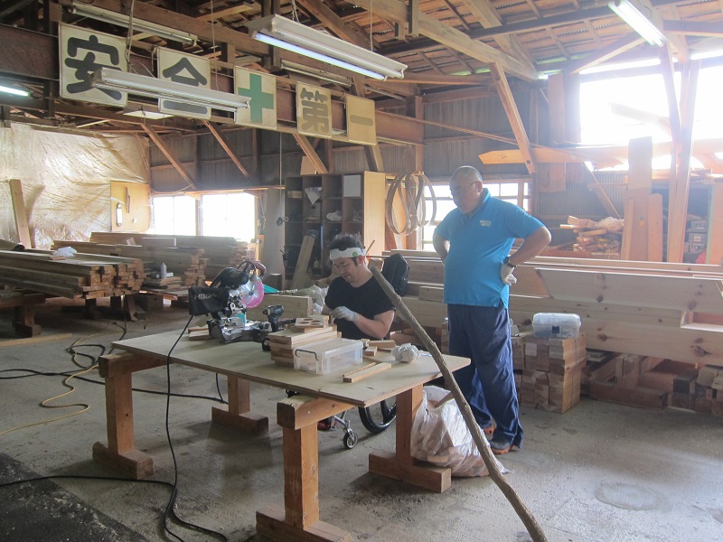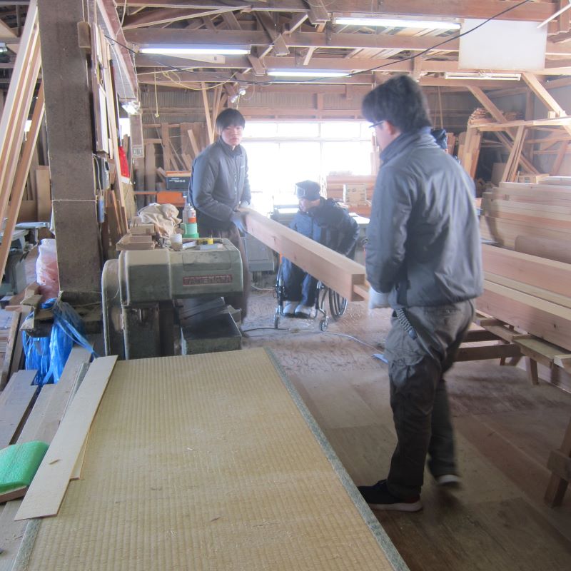 修正挽が終わると、今度は、構造材の断面を一律に揃えて、墨付けをし易くするために、四面自動鉋機のモルダーに材料を通して鉋を掛ける作業に入ります。ここでも、機械に角材を入れる担当一人出てくる材を受け取り並べる担当一人の二人一組でのでの連携があります。そのほかに、機械の調整や、集塵機のセッティングなど重要な部分を家具職人が行って若手に教えて指導しています。