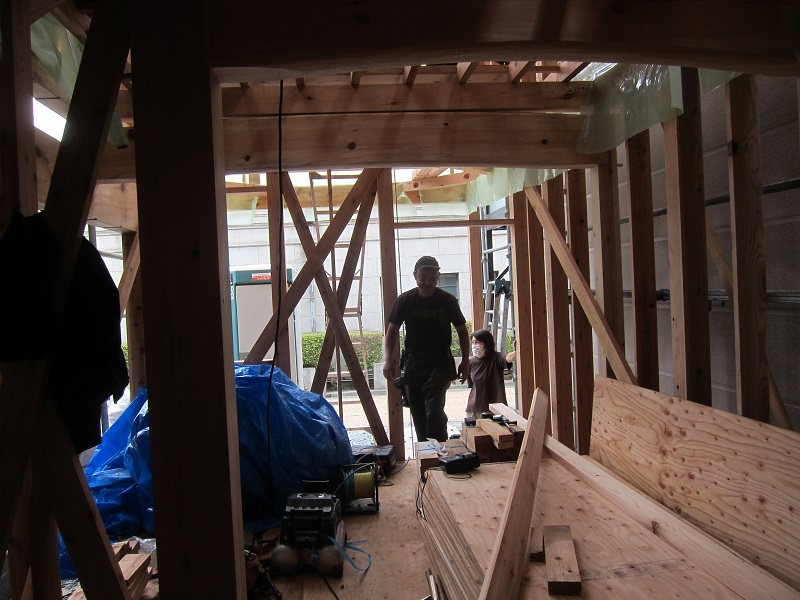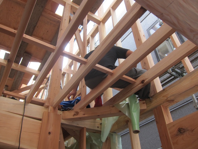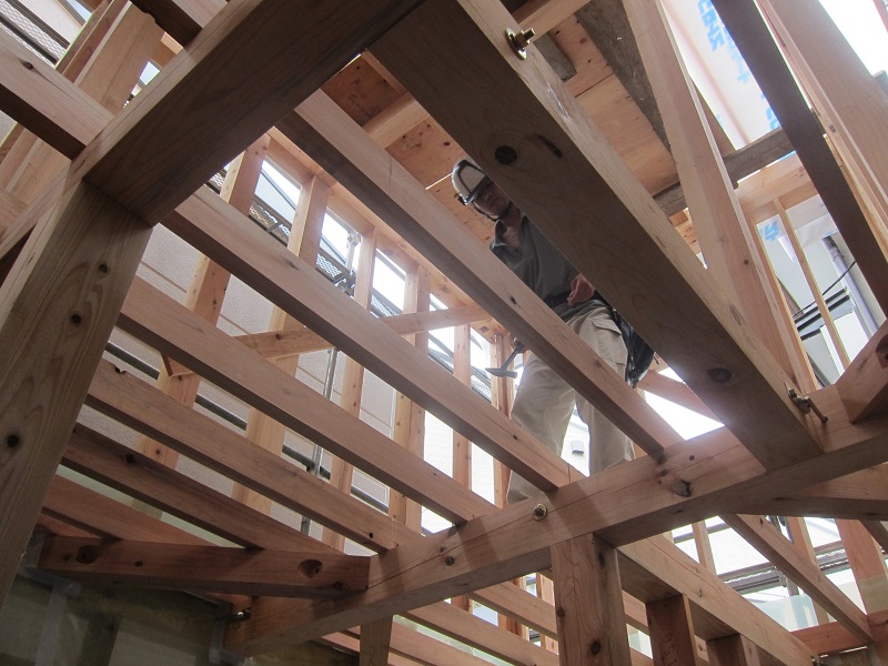 先日の木材の清め式が行われた鉈屋町での新築工事の構造材に墨付けが始まりました。そして、そのまま刻みも進めています。これは、若手大工が墨付けを行う車椅子大工のサポートを行いながら、出来る部分の手刻みも行う作業工程です。また、若手大工も手分けして墨付けを行います。車椅子大工のサポートのみならず、若手大工も経験を積める良き取り組みと捉えています。