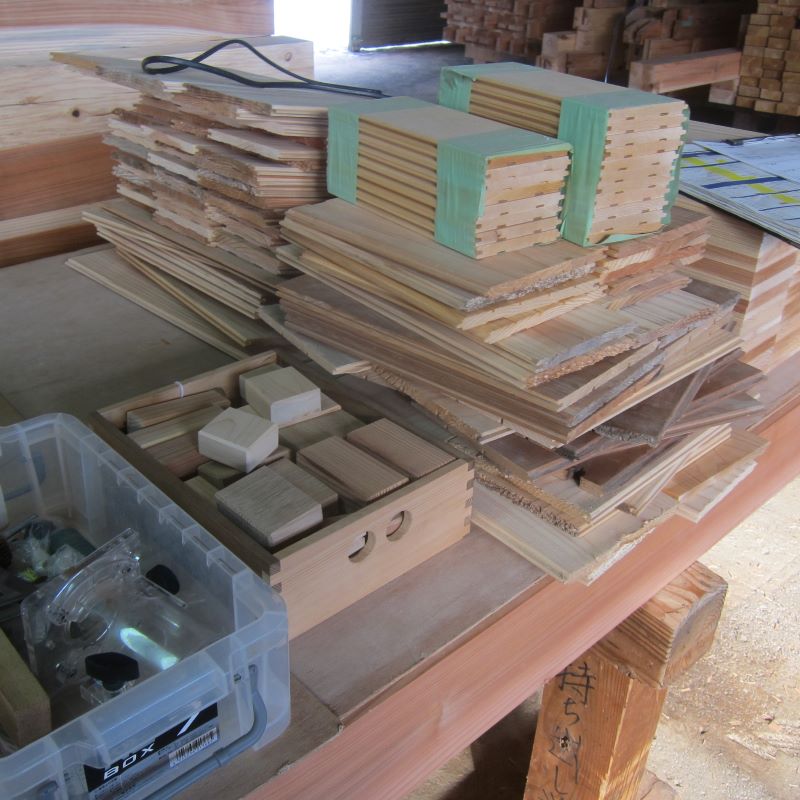 引き続きで修正挽がおこなわれています。昨日は漆の柱が修正挽されていました。そのほかにサクやクリに桂の梁と雑木が多く出そろい始めました。そうすると直ぐに、どの面をどの様に向けるかを決める番付け作業が始まりました。ウルシの木は最初この色でも直ぐに落ち着いてくるんですよね・・・みんなかぶれるの嫌だから手袋してたけど、この段階ではかぶれません。