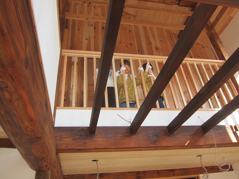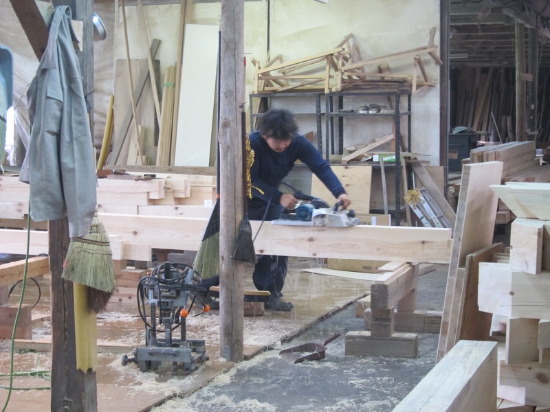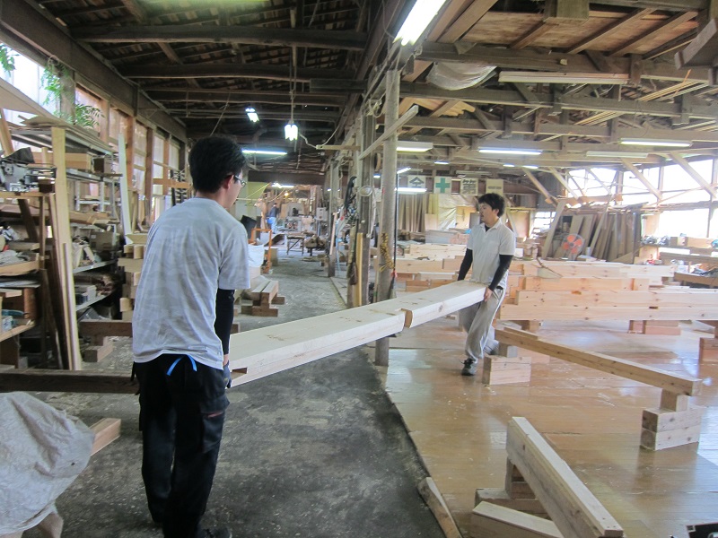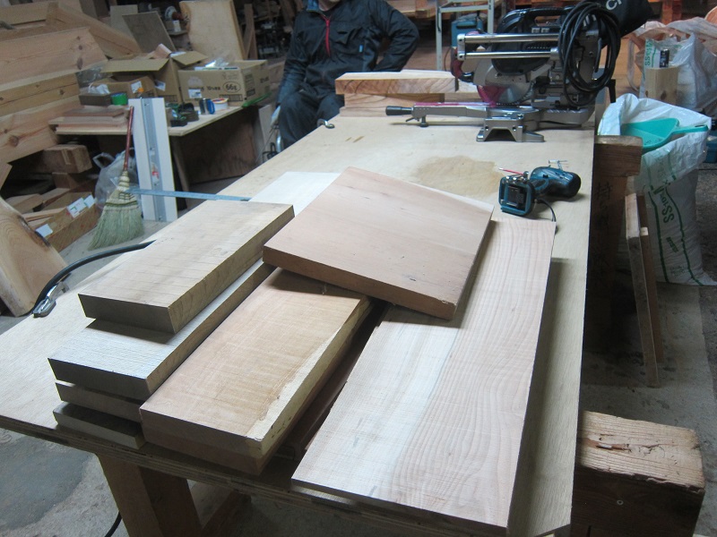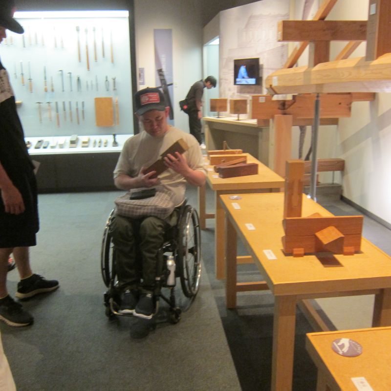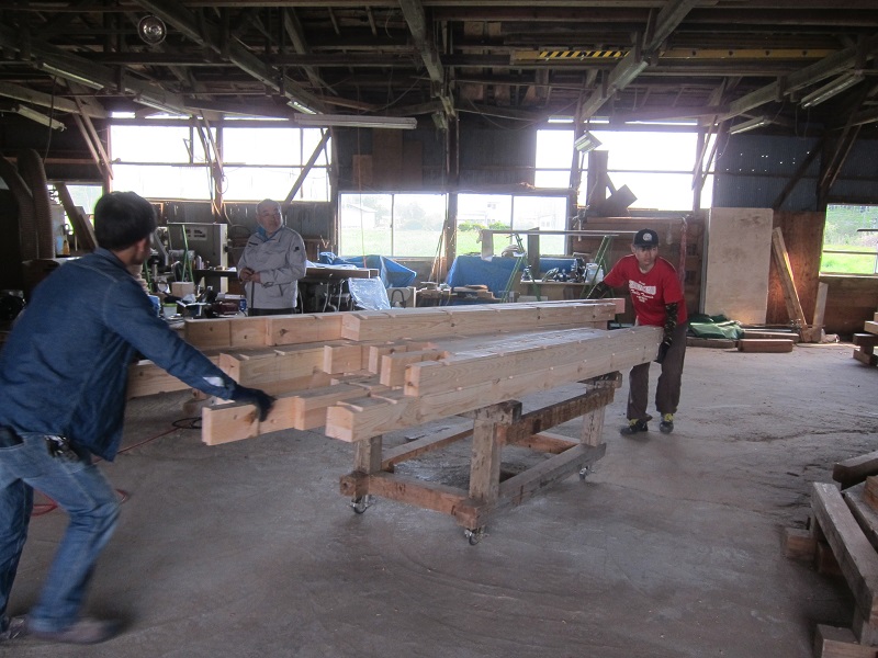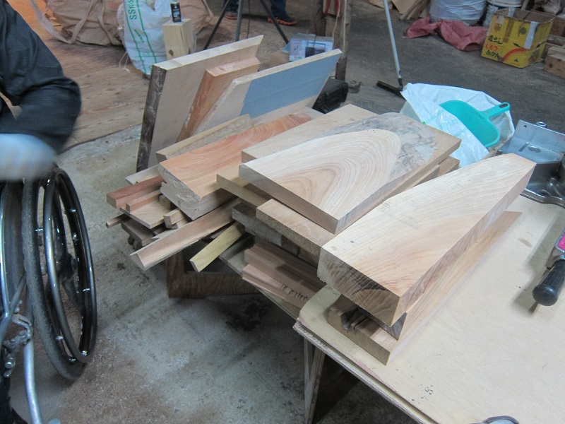 古材活用の工事が色々と進んでいます。設計担当も初めてのことなので、車椅子大工から学んでいました。