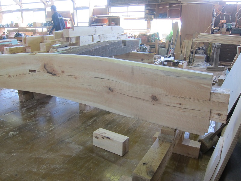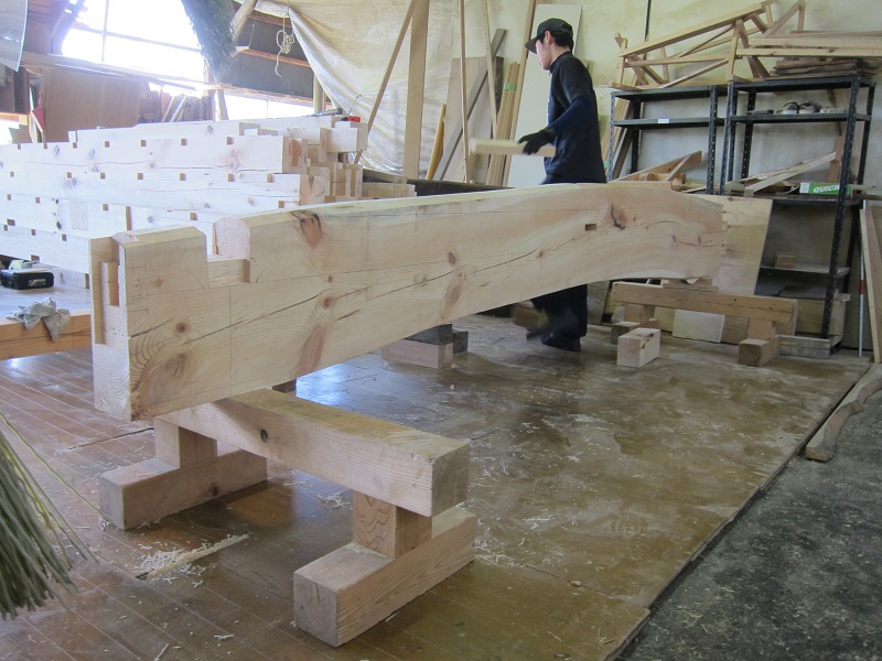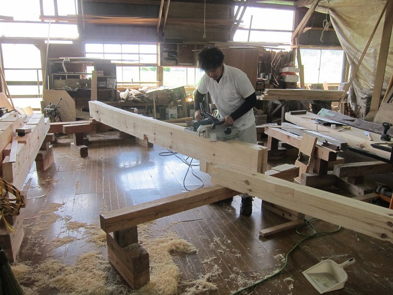 車いす大工の次なる仕事は、古材への墨付け刻みです。百年二百年が経過する古民家の茅葺屋根から外されてここに届いた曲がりの強い丸太梁など、真っすぐな材はありませんが、この楕円の曲がる木に真っすぐな墨を打ち込んで、構造躯体を作り上げるのは、大工の手業と目線による伝統技術です。これを世紀を超えて次世代に残して行く事がこの場で続けられています。