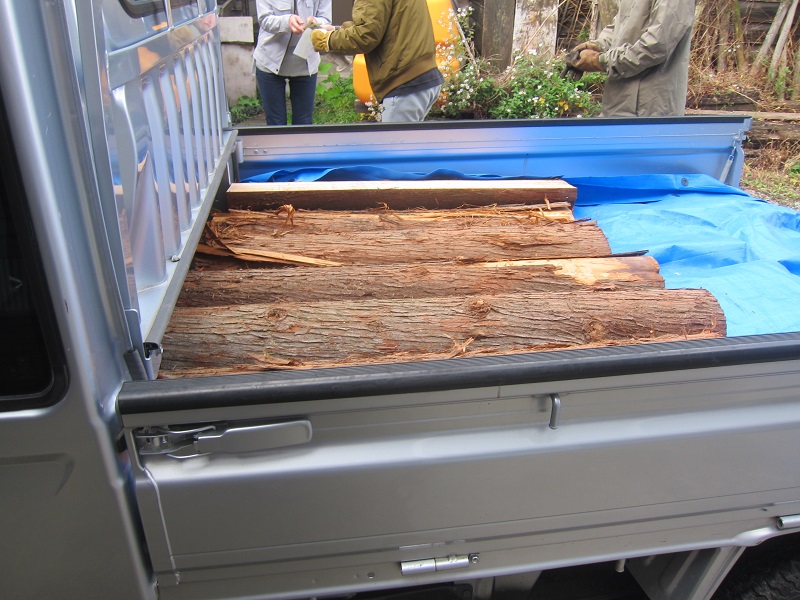 田山の山に赤松を見て選んできました。普通は真っすぐな丸太を選ぶのだと思いますが、それだと、根元のところを山に残して、地面から1m2m残されるものです。そこで、先日の曲がりくねる古材への墨付けが出来る技が役立ちますから、曲がりを入れて伐採してもらうことにしました。そして、この雪景色です。杖を突いてこの中を歩きました。