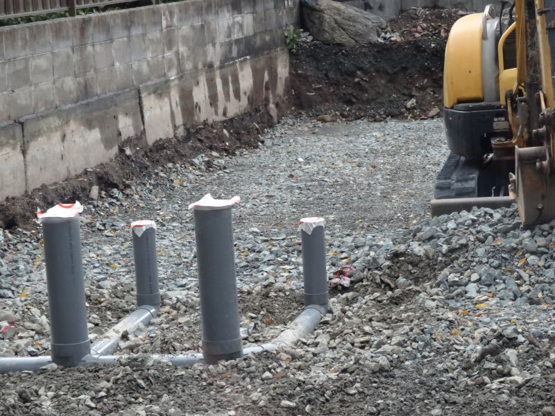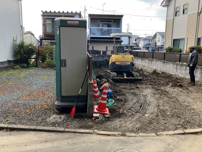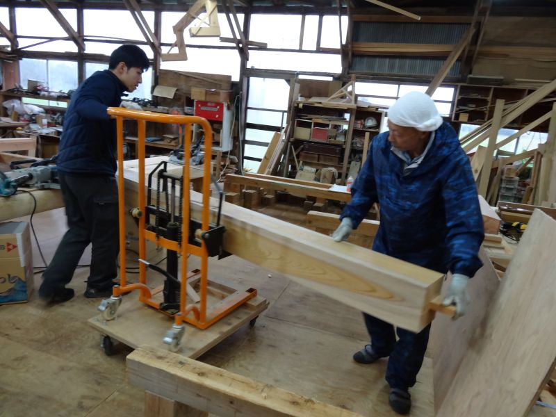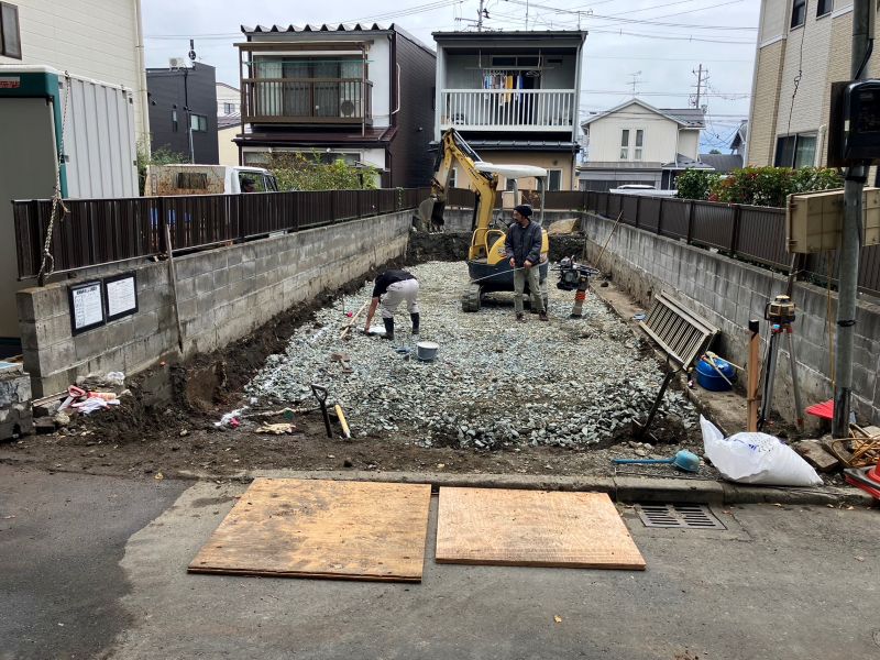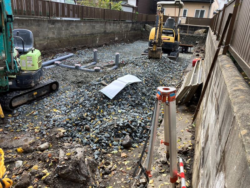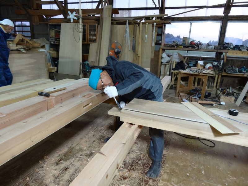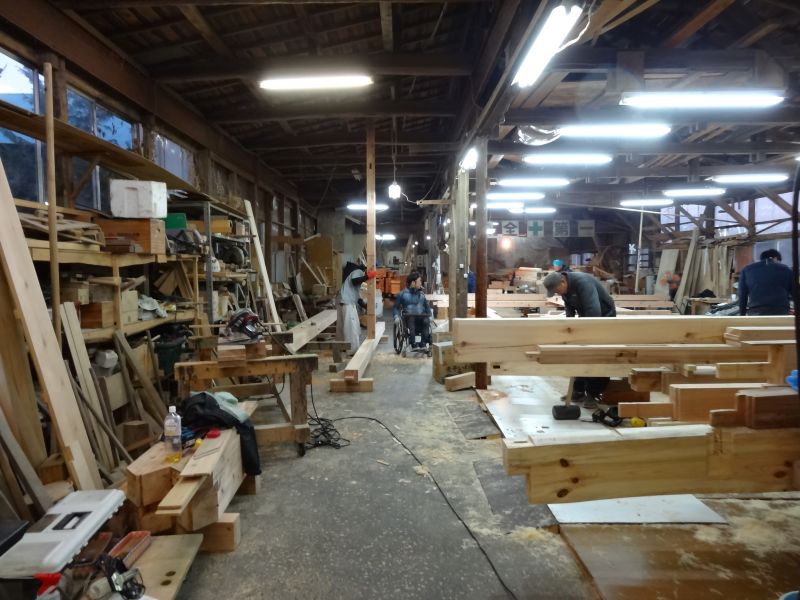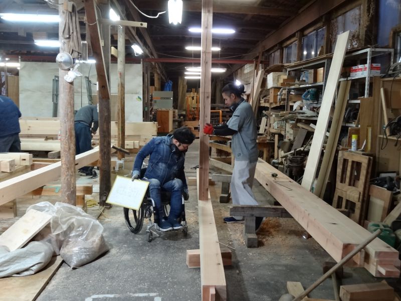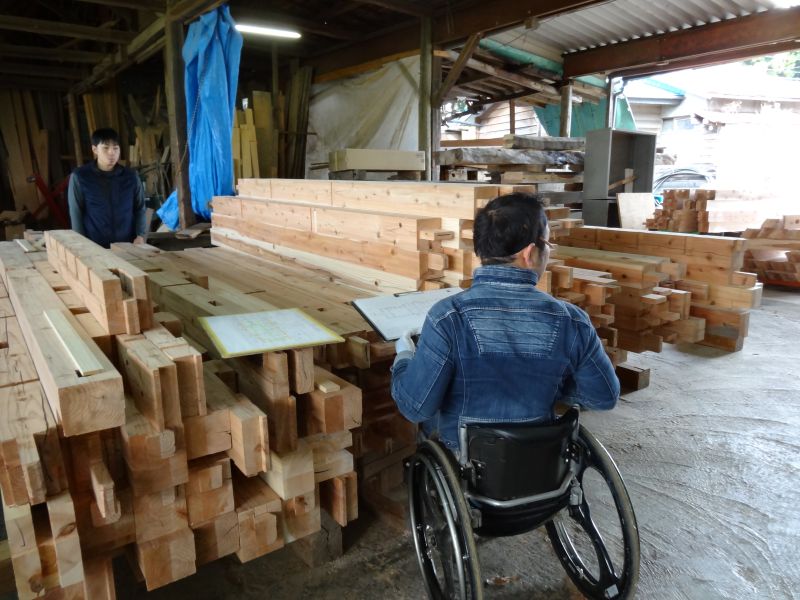 鉈屋町での新築工事の手刻みは無事完了いたしました。現場の方は基礎根伐り砕石地業がと下水配管も進んでいます。車椅子大工は刻みが完了しても、なにか間違いがないかを点検していました。